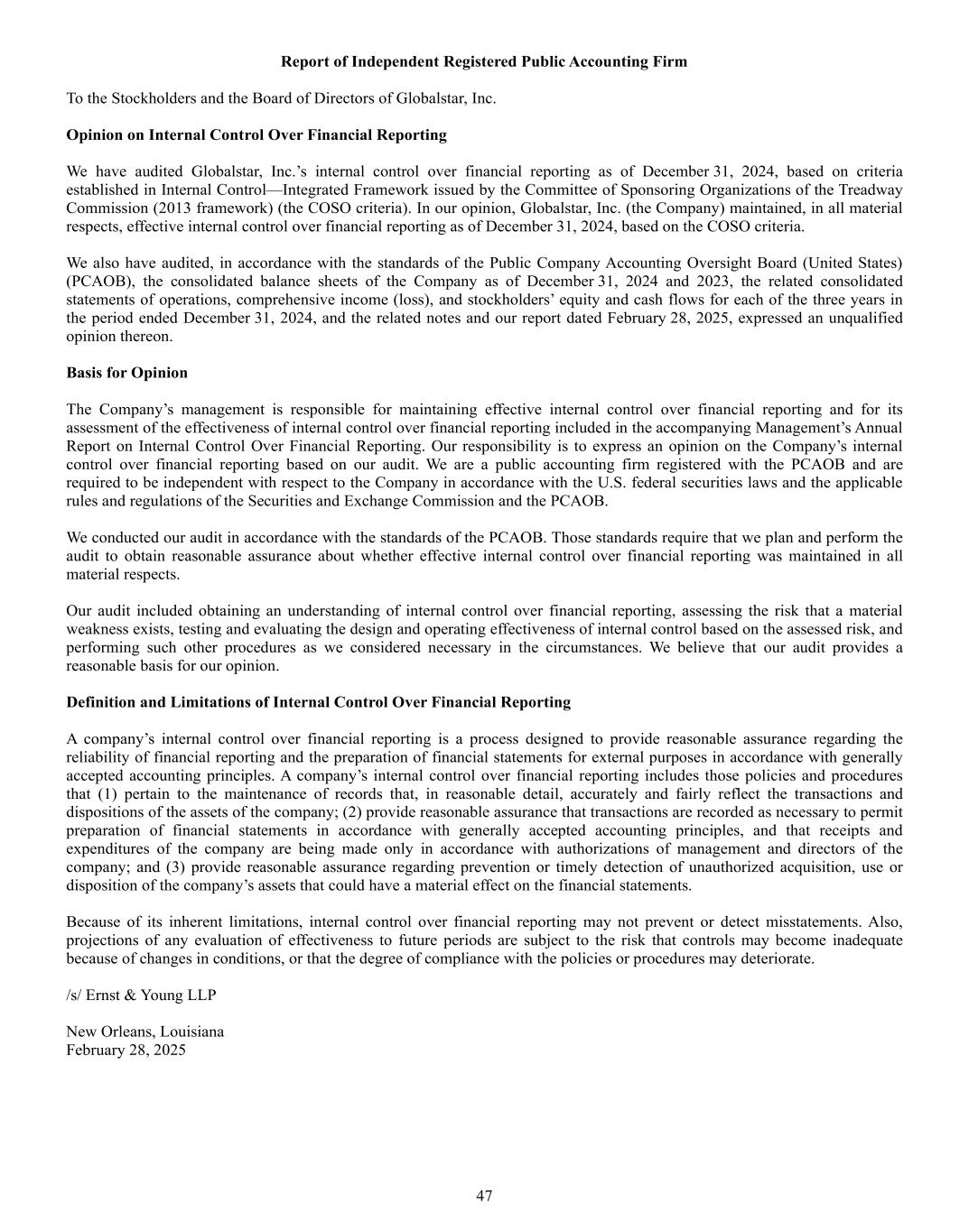 47   Report of Independent Registered Public Accounting Firm     To the Stockholders and the Board of Directors of Globalstar, Inc.    Opinion on Internal Control Over Financial Reporting    We have audited Globalstar, Inc.’s internal control over financial reporting as of December 31, 2024, based on criteria  established in Internal Control—Integrated Framework issued by the Committee of Sponsoring Organizations of the Treadway  Commission (2013 framework) (the COSO criteria). In our opinion, Globalstar, Inc. (the Company) maintained, in all material  respects, effective internal control over financial reporting as of December 31, 2024, based on the COSO criteria.    We also have audited, in accordance with the standards of the Public Company Accounting Oversight Board (United States)  (PCAOB), the consolidated balance sheets of the Company as of December 31, 2024 and 2023, the related consolidated  statements of operations, comprehensive income (loss), and stockholders’ equity and cash flows for each of the three years in  the period ended December 31, 2024, and the related notes and our report dated February 28, 2025, expressed an unqualified  opinion thereon.    Basis for Opinion    The Company’s management is responsible for maintaining effective internal control over financial reporting and for its  assessment of the effectiveness of internal control over financial reporting included in the accompanying Management’s Annual  Report on Internal Control Over Financial Reporting. Our responsibility is to express an opinion on the Company’s internal  control over financial reporting based on our audit. We are a public accounting firm registered with the PCAOB and are  required to be independent with respect to the Company in accordance with the U.S. federal securities laws and the applicable  rules and regulations of the Securities and Exchange Commission and the PCAOB.    We conducted our audit in accordance with the standards of the PCAOB. Those standards require that we plan and perform the  audit to obtain reasonable assurance about whether effective internal control over financial reporting was maintained in all  material respects.     Our audit included obtaining an understanding of internal control over financial reporting, assessing the risk that a material  weakness exists, testing and evaluating the design and operating effectiveness of internal control based on the assessed risk, and  performing such other procedures as we considered necessary in the circumstances. We believe that our audit provides a  reasonable basis for our opinion.    Definition and Limitations of Internal Control Over Financial Reporting    A company’s internal control over financial reporting is a process designed to provide reasonable assurance regarding the  reliability of financial reporting and the preparation of financial statements for external purposes in accordance with generally  accepted accounting principles. A company’s internal control over financial reporting includes those policies and procedures  that (1) pertain to the maintenance of records that, in reasonable detail, accurately and fairly reflect the transactions and  dispositions of the assets of the company; (2) provide reasonable assurance that transactions are recorded as necessary to permit  preparation of financial statements in accordance with generally accepted accounting principles, and that receipts and  expenditures of the company are being made only in accordance with authorizations of management and directors of the  company; and (3) provide reasonable assurance regarding prevention or timely detection of unauthorized acquisition, use or  disposition of the company’s assets that could have a material effect on the financial statements.    Because of its inherent limitations, internal control over financial reporting may not prevent or detect misstatements. Also,  projections of any evaluation of effectiveness to future periods are subject to the risk that controls may become inadequate  because of changes in conditions, or that the degree of compliance with the policies or procedures may deteriorate.    /s/ Ernst & Young LLP    New Orleans, Louisiana  February 28, 2025