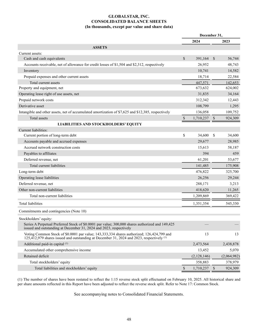 48   GLOBALSTAR, INC.  CONSOLIDATED BALANCE SHEETS  (In thousands, except par value and share data)    December 31,    2024  2023  ASSETS       Current assets:       Cash and cash equivalents $ 391,164  $ 56,744   Accounts receivable, net of allowance for credit losses of $1,504 and $2,312, respectively  26,952   48,743   Inventory  10,741   14,582   Prepaid expenses and other current assets  18,714   22,584   Total current assets  447,571   142,653   Property and equipment, net  673,632   624,002   Operating lease right of use assets, net  31,835   34,164   Prepaid network costs  312,342   12,443   Derivative asset  108,799    1,295   Intangible and other assets, net of accumulated amortization of $7,625 and $12,385, respectively  136,058   109,752   Total assets $ 1,710,237  $ 924,309   LIABILITIES AND STOCKHOLDERS’ EQUITY       Current liabilities:       Current portion of long-term debt $ 34,600  $ 34,600   Accounts payable and accrued expenses  29,677   28,985   Accrued network construction costs  15,613   58,187   Payables to affiliates  394   459   Deferred revenue, net  61,201   53,677   Total current liabilities  141,485   175,908   Long-term debt  476,822   325,700   Operating lease liabilities  26,256   29,244   Deferred revenue, net  288,171   3,213   Other non-current liabilities  418,620   11,265   Total non-current liabilities  1,209,869   369,422   Total liabilities  1,351,354   545,330   Commitments and contingencies (Note 10)     Stockholders’ equity:       Series A Perpetual Preferred Stock of $0.0001 par value; 300,000 shares authorized and 149,425  issued and outstanding at December 31, 2024 and 2023, respectively   —      —   Voting Common Stock of $0.0001 par value; 143,333,334 shares authorized; 126,424,799 and  125,412,979 shares issued and outstanding at December 31, 2024 and 2023, respectively (1)   13      13   Additional paid-in capital (1)  2,473,564   2,438,878   Accumulated other comprehensive income  13,452   5,070   Retained deficit  (2,128,146)  (2,064,982)  Total stockholders’ equity  358,883   378,979   Total liabilities and stockholders’ equity $ 1,710,237  $ 924,309     (1) The number of shares have been restated to reflect the 1:15 reverse stock split effectuated on February 10, 2025. All historical share and  per share amounts reflected in this Report have been adjusted to reflect the reverse stock split. Refer to Note 17: Common Stock.    See accompanying notes to Consolidated Financial Statements.