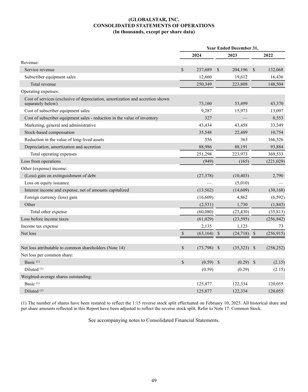 49   (GLOBALSTAR, INC.  CONSOLIDATED STATEMENTS OF OPERATIONS  (In thousands, except per share data)       Year Ended December 31,    2024  2023  2022  Revenue:          Service revenue $ 237,689  $ 204,196  $ 132,068   Subscriber equipment sales  12,660   19,612   16,436   Total revenue  250,349   223,808   148,504   Operating expenses:          Cost of services (exclusive of depreciation, amortization and accretion shown  separately below)  73,160   53,499   43,370   Cost of subscriber equipment sales  9,287   15,973   13,097   Cost of subscriber equipment sales - reduction in the value of inventory  327   —   8,553   Marketing, general and administrative  43,434   43,458   33,349   Stock-based compensation  35,548   22,489   10,754   Reduction in the value of long-lived assets  556   363   166,526   Depreciation, amortization and accretion  88,986   88,191   93,884   Total operating expenses  251,298   223,973   369,533   Loss from operations  (949)  (165)  (221,029)  Other (expense) income:          (Loss) gain on extinguishment of debt  (27,378)  (10,403)  2,790   Loss on equity issuance  —   (5,010)  —   Interest income and expense, net of amounts capitalized  (13,562)  (14,609)  (30,168)  Foreign currency (loss) gain  (16,609)  4,862   (6,592)  Other  (2,531)  1,730   (1,843)  Total other expense  (60,080)  (23,430)  (35,813)  Loss before income taxes  (61,029)  (23,595)  (256,842)  Income tax expense  2,135   1,123   73   Net loss $ (63,164) $ (24,718) $ (256,915)         Net loss attributable to common shareholders (Note 14) $ (73,798) $ (35,323) $ (258,252)  Net loss per common share:          Basic (1) $ (0.59) $ (0.29) $ (2.15)  Diluted (1)  (0.59)  (0.29)  (2.15)  Weighted-average shares outstanding:          Basic (1)  125,877   122,334   120,055   Diluted (1)  125,877   122,334   120,055      (1) The number of shares have been restated to reflect the 1:15 reverse stock split effectuated on February 10, 2025. All historical share and  per share amounts reflected in this Report have been adjusted to reflect the reverse stock split. Refer to Note 17: Common Stock.    See accompanying notes to Consolidated Financial Statements.