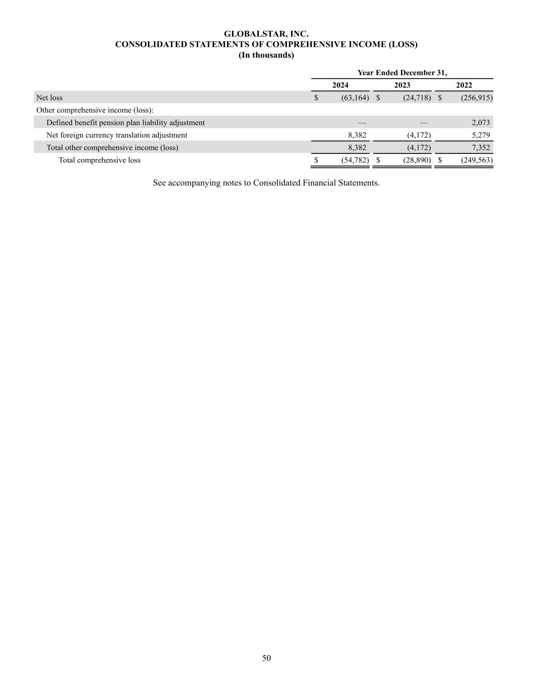 50  GLOBALSTAR, INC.  CONSOLIDATED STATEMENTS OF COMPREHENSIVE INCOME (LOSS)  (In thousands)    Year Ended December 31,    2024  2023  2022  Net loss $ (63,164) $ (24,718) $ (256,915)  Other comprehensive income (loss):          Defined benefit pension plan liability adjustment  —   —   2,073   Net foreign currency translation adjustment  8,382   (4,172)  5,279   Total other comprehensive income (loss)  8,382   (4,172)  7,352   Total comprehensive loss $ (54,782) $ (28,890) $ (249,563)      See accompanying notes to Consolidated Financial Statements.