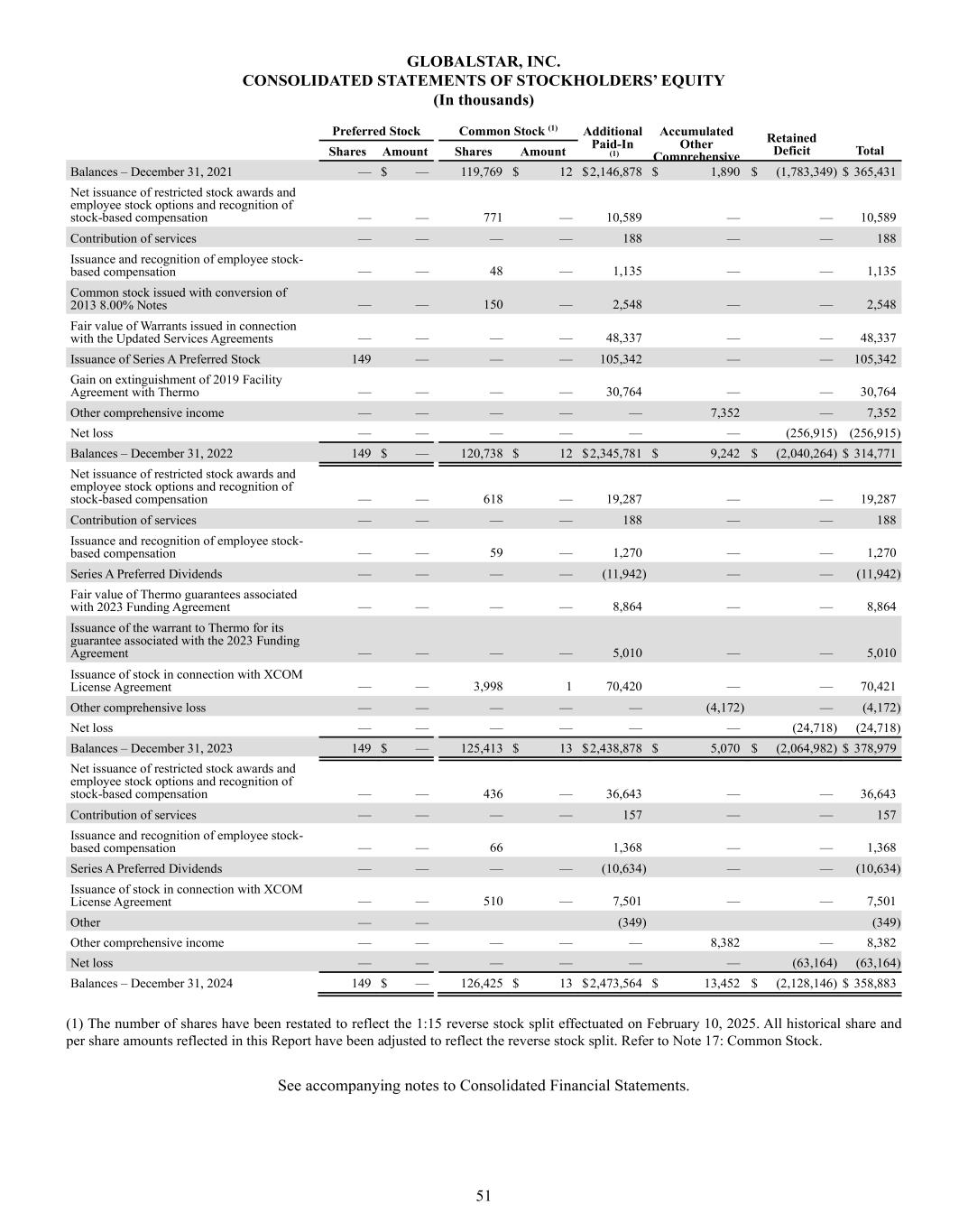51  GLOBALSTAR, INC.  CONSOLIDATED STATEMENTS OF STOCKHOLDERS’ EQUITY  (In thousands)   Preferred Stock  Common Stock (1) Additional  Paid-In  (1) Accumulated  Other  Comprehensive Retained  Deficit Total   Shares Amount  Shares Amount  Balances – December 31, 2021  —  $ —   119,769  $ 12  $ 2,146,878  $ 1,890  $ (1,783,349) $ 365,431   Net issuance of restricted stock awards and  employee stock options and recognition of  stock-based compensation  —   —   771   —   10,589   —   —   10,589   Contribution of services  —   —   —   —   188   —   —   188   Issuance and recognition of employee stock- based compensation  —   —   48   —   1,135   —   —   1,135   Common stock issued with conversion of  2013 8.00% Notes  —   —   150   —   2,548   —   —   2,548   Fair value of Warrants issued in connection  with the Updated Services Agreements  —   —   —   —   48,337   —   —   48,337   Issuance of Series A Preferred Stock  149   —   —   —   105,342   —   —   105,342   Gain on extinguishment of 2019 Facility  Agreement with Thermo  —   —   —   —   30,764   —   —   30,764   Other comprehensive income  —   —   —   —   —   7,352   —   7,352   Net loss  —   —   —   —   —   —   (256,915)  (256,915)  Balances – December 31, 2022  149  $ —   120,738  $ 12  $ 2,345,781  $ 9,242  $ (2,040,264) $ 314,771   Net issuance of restricted stock awards and  employee stock options and recognition of  stock-based compensation  —   —   618   —   19,287   —   —   19,287   Contribution of services  —   —   —   —   188   —   —   188   Issuance and recognition of employee stock- based compensation  —   —   59   —   1,270   —   —   1,270   Series A Preferred Dividends  —   —   —   —   (11,942)  —   —   (11,942)  Fair value of Thermo guarantees associated  with 2023 Funding Agreement  —   —   —   —   8,864   —   —   8,864   Issuance of the warrant to Thermo for its  guarantee associated with the 2023 Funding  Agreement  —   —   —   —   5,010   —   —   5,010   Issuance of stock in connection with XCOM  License Agreement  —   —   3,998   1   70,420   —   —   70,421   Other comprehensive loss  —   —   —   —   —   (4,172)  —   (4,172)  Net loss  —   —   —   —   —   —   (24,718)  (24,718)  Balances – December 31, 2023  149  $ —   125,413  $ 13  $ 2,438,878  $ 5,070  $ (2,064,982) $ 378,979   Net issuance of restricted stock awards and  employee stock options and recognition of  stock-based compensation  —   —   436   —   36,643   —   —   36,643   Contribution of services  —   —   —   —   157   —   —   157   Issuance and recognition of employee stock- based compensation  —   —   66    1,368   —   —   1,368   Series A Preferred Dividends  —   —   —   —   (10,634)  —   —   (10,634)  Issuance of stock in connection with XCOM  License Agreement  —   —   510   —   7,501   —   —   7,501   Other  —   —   (349)  (349)  Other comprehensive income  —   —   —   —   —   8,382   —   8,382   Net loss  —   —   —   —   —   —   (63,164)  (63,164)  Balances – December 31, 2024  149  $ —   126,425  $ 13  $ 2,473,564  $ 13,452  $ (2,128,146) $ 358,883     (1) The number of shares have been restated to reflect the 1:15 reverse stock split effectuated on February 10, 2025. All historical share and  per share amounts reflected in this Report have been adjusted to reflect the reverse stock split. Refer to Note 17: Common Stock.    See accompanying notes to Consolidated Financial Statements.