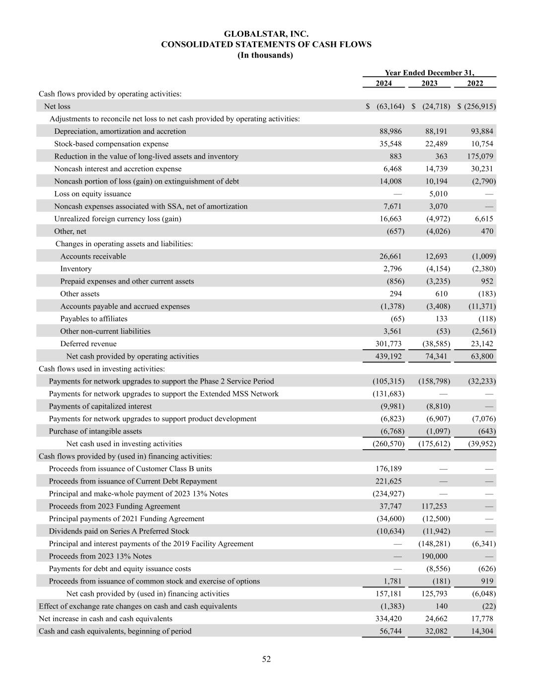 52  GLOBALSTAR, INC.  CONSOLIDATED STATEMENTS OF CASH FLOWS  (In thousands)     Year Ended December 31,    2024  2023  2022  Cash flows provided by operating activities:          Net loss $ (63,164) $ (24,718) $ (256,915)  Adjustments to reconcile net loss to net cash provided by operating activities:          Depreciation, amortization and accretion  88,986   88,191   93,884   Stock-based compensation expense  35,548   22,489   10,754   Reduction in the value of long-lived assets and inventory  883   363   175,079   Noncash interest and accretion expense  6,468   14,739   30,231   Noncash portion of loss (gain) on extinguishment of debt  14,008   10,194   (2,790)  Loss on equity issuance  —   5,010   —   Noncash expenses associated with SSA, net of amortization  7,671   3,070   —   Unrealized foreign currency loss (gain)  16,663   (4,972)  6,615   Other, net  (657)  (4,026)  470   Changes in operating assets and liabilities:          Accounts receivable  26,661   12,693   (1,009)  Inventory  2,796   (4,154)  (2,380)  Prepaid expenses and other current assets  (856)  (3,235)  952   Other assets  294   610   (183)  Accounts payable and accrued expenses  (1,378)  (3,408)  (11,371)  Payables to affiliates  (65)  133   (118)  Other non-current liabilities  3,561   (53)  (2,561)  Deferred revenue  301,773   (38,585)  23,142   Net cash provided by operating activities  439,192   74,341   63,800   Cash flows used in investing activities:          Payments for network upgrades to support the Phase 2 Service Period  (105,315)  (158,798)  (32,233)  Payments for network upgrades to support the Extended MSS Network  (131,683)   —    —   Payments of capitalized interest  (9,981)  (8,810)  —   Payments for network upgrades to support product development  (6,823)  (6,907)  (7,076)  Purchase of intangible assets  (6,768)  (1,097)  (643)  Net cash used in investing activities  (260,570)  (175,612)  (39,952)  Cash flows provided by (used in) financing activities:          Proceeds from issuance of Customer Class B units  176,189    —   —   Proceeds from issuance of Current Debt Repayment  221,625    —    —   Principal and make-whole payment of 2023 13% Notes  (234,927)   —    —   Proceeds from 2023 Funding Agreement  37,747   117,253   —   Principal payments of 2021 Funding Agreement  (34,600)  (12,500)  —   Dividends paid on Series A Preferred Stock  (10,634)  (11,942)  —   Principal and interest payments of the 2019 Facility Agreement  —   (148,281)  (6,341)  Proceeds from 2023 13% Notes  —   190,000   —   Payments for debt and equity issuance costs  —   (8,556)  (626)  Proceeds from issuance of common stock and exercise of options  1,781   (181)  919   Net cash provided by (used in) financing activities  157,181   125,793   (6,048)  Effect of exchange rate changes on cash and cash equivalents  (1,383)  140   (22)  Net increase in cash and cash equivalents  334,420   24,662   17,778   Cash and cash equivalents, beginning of period  56,744   32,082   14,304