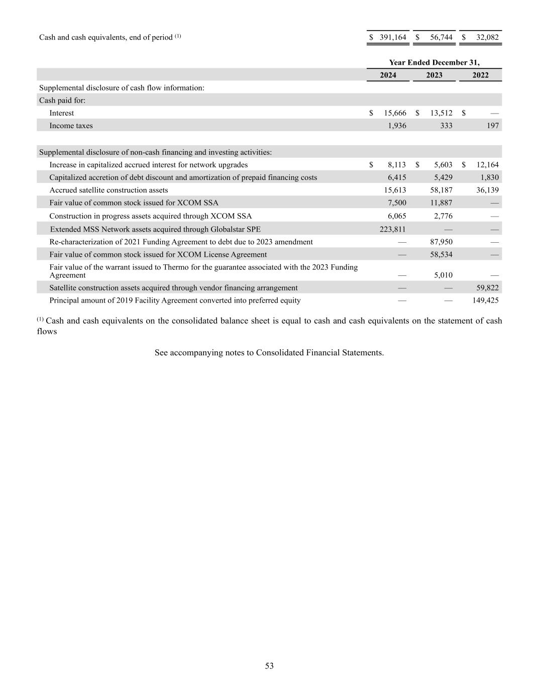 53  Cash and cash equivalents, end of period (1) $ 391,164  $ 56,744  $ 32,082           Year Ended December 31,   2024  2023  2022  Supplemental disclosure of cash flow information:          Cash paid for:          Interest $ 15,666  $ 13,512  $ —   Income taxes  1,936   333   197          Supplemental disclosure of non-cash financing and investing activities:       Increase in capitalized accrued interest for network upgrades $ 8,113  $ 5,603  $ 12,164   Capitalized accretion of debt discount and amortization of prepaid financing costs  6,415   5,429   1,830   Accrued satellite construction assets  15,613   58,187   36,139   Fair value of common stock issued for XCOM SSA  7,500   11,887   —   Construction in progress assets acquired through XCOM SSA  6,065   2,776   —   Extended MSS Network assets acquired through Globalstar SPE  223,811    —    —   Re-characterization of 2021 Funding Agreement to debt due to 2023 amendment  —   87,950   —   Fair value of common stock issued for XCOM License Agreement  —   58,534   —   Fair value of the warrant issued to Thermo for the guarantee associated with the 2023 Funding  Agreement  —   5,010   —   Satellite construction assets acquired through vendor financing arrangement  —   —   59,822   Principal amount of 2019 Facility Agreement converted into preferred equity  —   —   149,425     (1) Cash and cash equivalents on the consolidated balance sheet is equal to cash and cash equivalents on the statement of cash  flows     See accompanying notes to Consolidated Financial Statements.