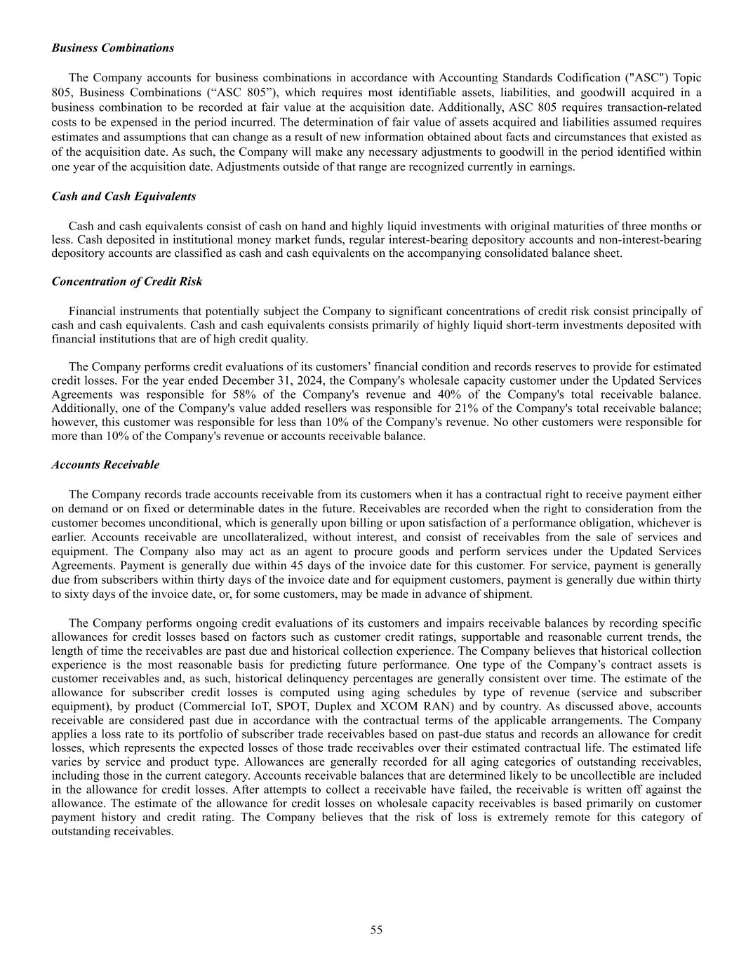 55   Business Combinations    The Company accounts for business combinations in accordance with Accounting Standards Codification ("ASC") Topic  805, Business Combinations (“ASC 805”), which requires most identifiable assets, liabilities, and goodwill acquired in a  business combination to be recorded at fair value at the acquisition date. Additionally, ASC 805 requires transaction-related  costs to be expensed in the period incurred. The determination of fair value of assets acquired and liabilities assumed requires  estimates and assumptions that can change as a result of new information obtained about facts and circumstances that existed as  of the acquisition date. As such, the Company will make any necessary adjustments to goodwill in the period identified within  one year of the acquisition date. Adjustments outside of that range are recognized currently in earnings.     Cash and Cash Equivalents     Cash and cash equivalents consist of cash on hand and highly liquid investments with original maturities of three months or  less. Cash deposited in institutional money market funds, regular interest-bearing depository accounts and non-interest-bearing  depository accounts are classified as cash and cash equivalents on the accompanying consolidated balance sheet.     Concentration of Credit Risk     Financial instruments that potentially subject the Company to significant concentrations of credit risk consist principally of  cash and cash equivalents. Cash and cash equivalents consists primarily of highly liquid short-term investments deposited with  financial institutions that are of high credit quality.     The Company performs credit evaluations of its customers’ financial condition and records reserves to provide for estimated  credit losses. For the year ended December 31, 2024, the Company's wholesale capacity customer under the Updated Services  Agreements was responsible for 58% of the Company's revenue and 40% of the Company's total receivable balance.  Additionally, one of the Company's value added resellers was responsible for 21% of the Company's total receivable balance;  however, this customer was responsible for less than 10% of the Company's revenue. No other customers were responsible for  more than 10% of the Company's revenue or accounts receivable balance.       Accounts Receivable     The Company records trade accounts receivable from its customers when it has a contractual right to receive payment either  on demand or on fixed or determinable dates in the future. Receivables are recorded when the right to consideration from the  customer becomes unconditional, which is generally upon billing or upon satisfaction of a performance obligation, whichever is  earlier. Accounts receivable are uncollateralized, without interest, and consist of receivables from the sale of services and  equipment. The Company also may act as an agent to procure goods and perform services under the Updated Services  Agreements. Payment is generally due within 45 days of the invoice date for this customer. For service, payment is generally  due from subscribers within thirty days of the invoice date and for equipment customers, payment is generally due within thirty  to sixty days of the invoice date, or, for some customers, may be made in advance of shipment.    The Company performs ongoing credit evaluations of its customers and impairs receivable balances by recording specific  allowances for credit losses based on factors such as customer credit ratings, supportable and reasonable current trends, the  length of time the receivables are past due and historical collection experience. The Company believes that historical collection  experience is the most reasonable basis for predicting future performance. One type of the Company’s contract assets is  customer receivables and, as such, historical delinquency percentages are generally consistent over time. The estimate of the  allowance for subscriber credit losses is computed using aging schedules by type of revenue (service and subscriber  equipment), by product (Commercial IoT, SPOT, Duplex and XCOM RAN) and by country. As discussed above, accounts  receivable are considered past due in accordance with the contractual terms of the applicable arrangements. The Company  applies a loss rate to its portfolio of subscriber trade receivables based on past-due status and records an allowance for credit  losses, which represents the expected losses of those trade receivables over their estimated contractual life. The estimated life   varies by service and product type. Allowances are generally recorded for all aging categories of outstanding receivables,  including those in the current category. Accounts receivable balances that are determined likely to be uncollectible are included  in the allowance for credit losses. After attempts to collect a receivable have failed, the receivable is written off against the  allowance. The estimate of the allowance for credit losses on wholesale capacity receivables is based primarily on customer  payment history and credit rating. The Company believes that the risk of loss is extremely remote for this category of  outstanding receivables.