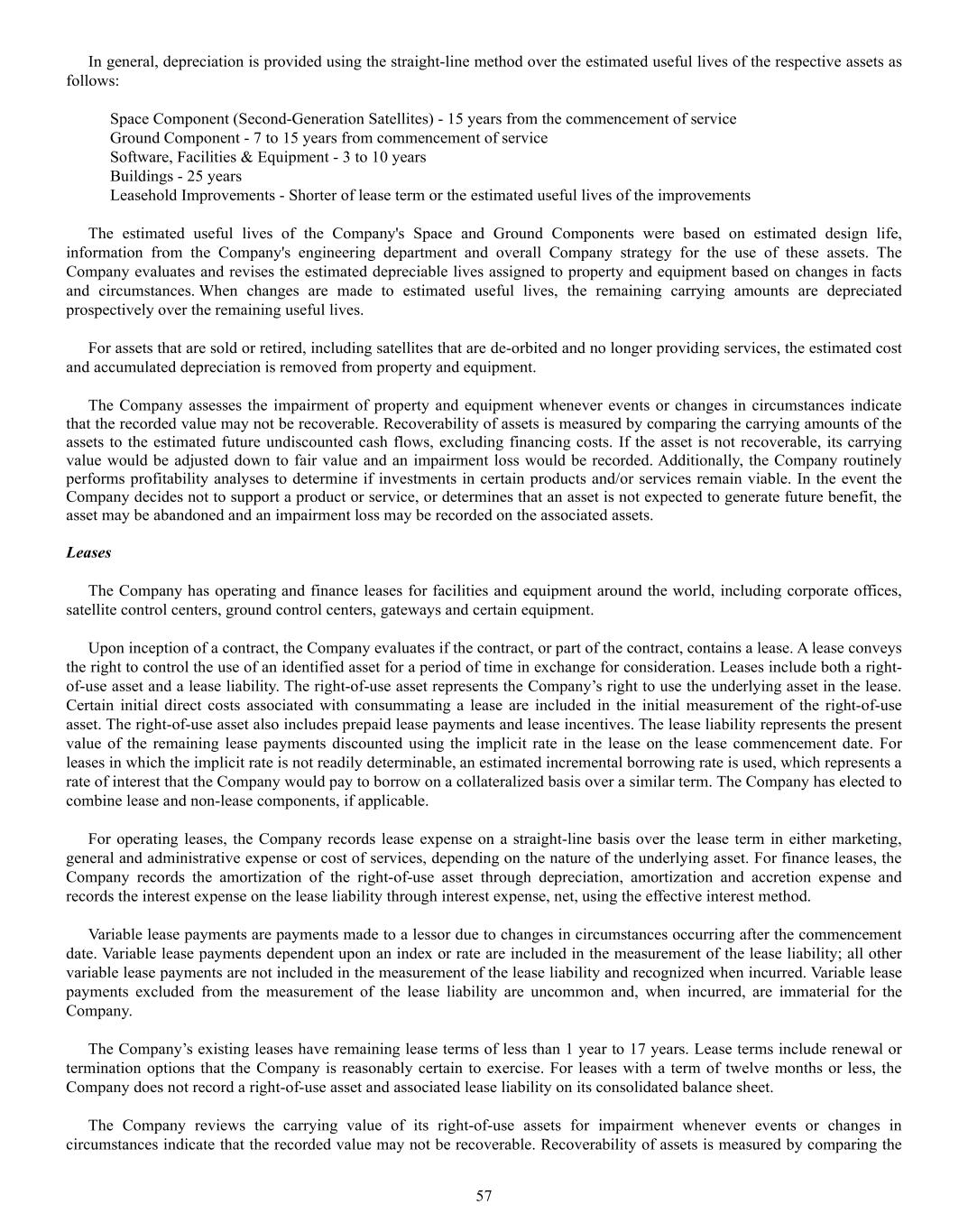 57   In general, depreciation is provided using the straight-line method over the estimated useful lives of the respective assets as  follows:    Space Component (Second-Generation Satellites) - 15 years from the commencement of service  Ground Component - 7 to 15 years from commencement of service  Software, Facilities & Equipment - 3 to 10 years   Buildings - 25 years  Leasehold Improvements - Shorter of lease term or the estimated useful lives of the improvements    The estimated useful lives of the Company's Space and Ground Components were based on estimated design life,  information from the Company's engineering department and overall Company strategy for the use of these assets. The  Company evaluates and revises the estimated depreciable lives assigned to property and equipment based on changes in facts  and circumstances. When changes are made to estimated useful lives, the remaining carrying amounts are depreciated  prospectively over the remaining useful lives.     For assets that are sold or retired, including satellites that are de-orbited and no longer providing services, the estimated cost  and accumulated depreciation is removed from property and equipment.      The Company assesses the impairment of property and equipment whenever events or changes in circumstances indicate  that the recorded value may not be recoverable. Recoverability of assets is measured by comparing the carrying amounts of the  assets to the estimated future undiscounted cash flows, excluding financing costs. If the asset is not recoverable, its carrying  value would be adjusted down to fair value and an impairment loss would be recorded. Additionally, the Company routinely  performs profitability analyses to determine if investments in certain products and/or services remain viable. In the event the  Company decides not to support a product or service, or determines that an asset is not expected to generate future benefit, the  asset may be abandoned and an impairment loss may be recorded on the associated assets.     Leases     The Company has operating and finance leases for facilities and equipment around the world, including corporate offices,  satellite control centers, ground control centers, gateways and certain equipment.    Upon inception of a contract, the Company evaluates if the contract, or part of the contract, contains a lease. A lease conveys  the right to control the use of an identified asset for a period of time in exchange for consideration. Leases include both a right- of-use asset and a lease liability. The right-of-use asset represents the Company’s right to use the underlying asset in the lease.  Certain initial direct costs associated with consummating a lease are included in the initial measurement of the right-of-use  asset. The right-of-use asset also includes prepaid lease payments and lease incentives. The lease liability represents the present  value of the remaining lease payments discounted using the implicit rate in the lease on the lease commencement date. For  leases in which the implicit rate is not readily determinable, an estimated incremental borrowing rate is used, which represents a  rate of interest that the Company would pay to borrow on a collateralized basis over a similar term. The Company has elected to  combine lease and non-lease components, if applicable.    For operating leases, the Company records lease expense on a straight-line basis over the lease term in either marketing,  general and administrative expense or cost of services, depending on the nature of the underlying asset. For finance leases, the  Company records the amortization of the right-of-use asset through depreciation, amortization and accretion expense and  records the interest expense on the lease liability through interest expense, net, using the effective interest method.     Variable lease payments are payments made to a lessor due to changes in circumstances occurring after the commencement  date. Variable lease payments dependent upon an index or rate are included in the measurement of the lease liability; all other  variable lease payments are not included in the measurement of the lease liability and recognized when incurred. Variable lease  payments excluded from the measurement of the lease liability are uncommon and, when incurred, are immaterial for the  Company.     The Company’s existing leases have remaining lease terms of less than 1 year to 17 years. Lease terms include renewal or  termination options that the Company is reasonably certain to exercise. For leases with a term of twelve months or less, the  Company does not record a right-of-use asset and associated lease liability on its consolidated balance sheet.     The Company reviews the carrying value of its right-of-use assets for impairment whenever events or changes in  circumstances indicate that the recorded value may not be recoverable. Recoverability of assets is measured by comparing the