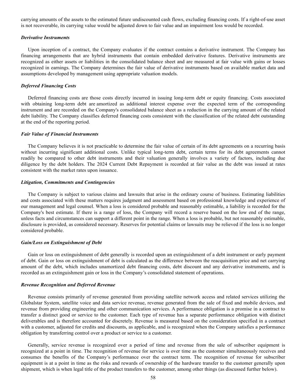 58   carrying amounts of the assets to the estimated future undiscounted cash flows, excluding financing costs. If a right-of-use asset  is not recoverable, its carrying value would be adjusted down to fair value and an impairment loss would be recorded.    Derivative Instruments     Upon inception of a contract, the Company evaluates if the contract contains a derivative instrument. The Company has  financing arrangements that are hybrid instruments that contain embedded derivative features. Derivative instruments are  recognized as either assets or liabilities in the consolidated balance sheet and are measured at fair value with gains or losses  recognized in earnings. The Company determines the fair value of derivative instruments based on available market data and  assumptions developed by management using appropriate valuation models.     Deferred Financing Costs     Deferred financing costs are those costs directly incurred in issuing long-term debt or equity financing. Costs associated  with obtaining long-term debt are amortized as additional interest expense over the expected term of the corresponding  instrument and are recorded on the Company's consolidated balance sheet as a reduction in the carrying amount of the related  debt liability. The Company classifies deferred financing costs consistent with the classification of the related debt outstanding  at the end of the reporting period.     Fair Value of Financial Instruments     The Company believes it is not practicable to determine the fair value of certain of its debt agreements on a recurring basis  without incurring significant additional costs. Unlike typical long-term debt, certain terms for its debt agreements cannot  readily be compared to other debt instruments and their valuation generally involves a variety of factors, including due  diligence by the debt holders. The 2024 Current Debt Repayment is recorded at fair value as the debt was issued at rates  consistent with the market rates upon issuance.    Litigation, Commitments and Contingencies     The Company is subject to various claims and lawsuits that arise in the ordinary course of business. Estimating liabilities  and costs associated with these matters requires judgment and assessment based on professional knowledge and experience of  our management and legal counsel. When a loss is considered probable and reasonably estimable, a liability is recorded for the  Company's best estimate. If there is a range of loss, the Company will record a reserve based on the low end of the range,  unless facts and circumstances can support a different point in the range. When a loss is probable, but not reasonably estimable,  disclosure is provided, as considered necessary. Reserves for potential claims or lawsuits may be relieved if the loss is no longer  considered probable.      Gain/Loss on Extinguishment of Debt     Gain or loss on extinguishment of debt generally is recorded upon an extinguishment of a debt instrument or early payment  of debt. Gain or loss on extinguishment of debt is calculated as the difference between the reacquisition price and net carrying  amount of the debt, which includes unamortized debt financing costs, debt discount and any derivative instruments, and is  recorded as an extinguishment gain or loss in the Company’s consolidated statement of operations.     Revenue Recognition and Deferred Revenue     Revenue consists primarily of revenue generated from providing satellite network access and related services utilizing the  Globalstar System, satellite voice and data service revenue, revenue generated from the sale of fixed and mobile devices, and  revenue from providing engineering and other communication services. A performance obligation is a promise in a contract to  transfer a distinct good or service to the customer. Each type of revenue has a separate performance obligation with distinct  deliverables and is therefore accounted for discretely. Revenue is measured based on the consideration specified in a contract  with a customer, adjusted for credits and discounts, as applicable, and is recognized when the Company satisfies a performance  obligation by transferring control over a product or service to a customer.    Generally, service revenue is recognized over a period of time and revenue from the sale of subscriber equipment is  recognized at a point in time. The recognition of revenue for service is over time as the customer simultaneously receives and  consumes the benefits of the Company’s performance over the contract term. The recognition of revenue for subscriber  equipment is at a point in time as the risks and rewards of ownership of the hardware transfer to the customer generally upon  shipment, which is when legal title of the product transfers to the customer, among other things (as discussed further below).