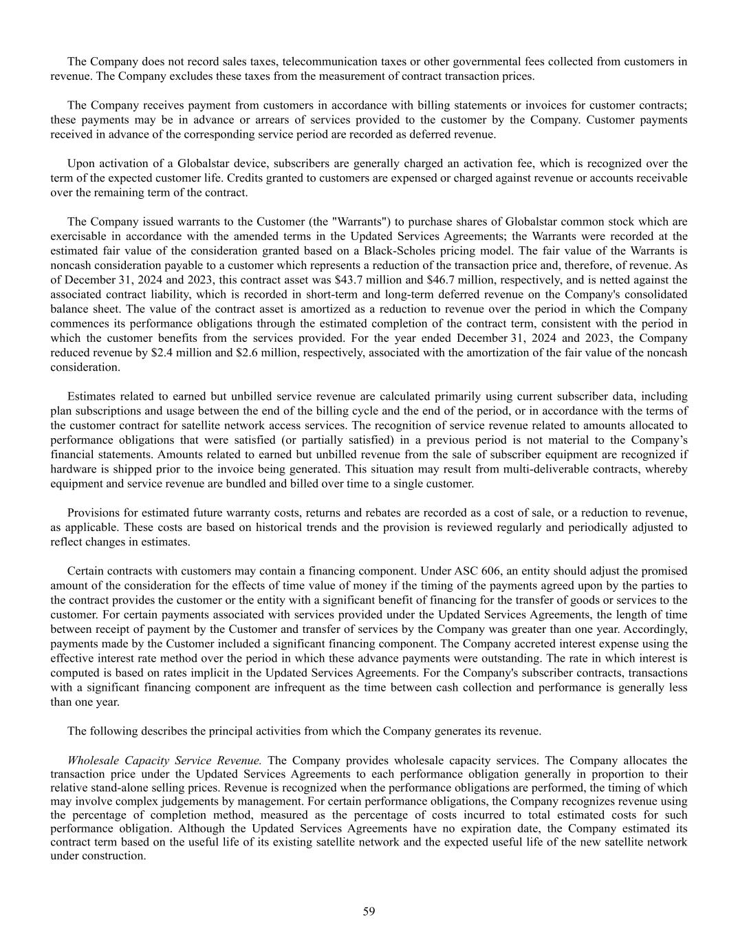 59    The Company does not record sales taxes, telecommunication taxes or other governmental fees collected from customers in  revenue. The Company excludes these taxes from the measurement of contract transaction prices.    The Company receives payment from customers in accordance with billing statements or invoices for customer contracts;  these payments may be in advance or arrears of services provided to the customer by the Company. Customer payments  received in advance of the corresponding service period are recorded as deferred revenue.     Upon activation of a Globalstar device, subscribers are generally charged an activation fee, which is recognized over the  term of the expected customer life. Credits granted to customers are expensed or charged against revenue or accounts receivable  over the remaining term of the contract.     The Company issued warrants to the Customer (the "Warrants") to purchase shares of Globalstar common stock which are  exercisable in accordance with the amended terms in the Updated Services Agreements; the Warrants were recorded at the  estimated fair value of the consideration granted based on a Black-Scholes pricing model. The fair value of the Warrants is  noncash consideration payable to a customer which represents a reduction of the transaction price and, therefore, of revenue. As  of December 31, 2024 and 2023, this contract asset was $43.7 million and $46.7 million, respectively, and is netted against the  associated contract liability, which is recorded in short-term and long-term deferred revenue on the Company's consolidated  balance sheet. The value of the contract asset is amortized as a reduction to revenue over the period in which the Company  commences its performance obligations through the estimated completion of the contract term, consistent with the period in  which the customer benefits from the services provided. For the year ended December 31, 2024 and 2023, the Company  reduced revenue by $2.4 million and $2.6 million, respectively, associated with the amortization of the fair value of the noncash  consideration.    Estimates related to earned but unbilled service revenue are calculated primarily using current subscriber data, including  plan subscriptions and usage between the end of the billing cycle and the end of the period, or in accordance with the terms of  the customer contract for satellite network access services. The recognition of service revenue related to amounts allocated to  performance obligations that were satisfied (or partially satisfied) in a previous period is not material to the Company’s  financial statements. Amounts related to earned but unbilled revenue from the sale of subscriber equipment are recognized if  hardware is shipped prior to the invoice being generated. This situation may result from multi-deliverable contracts, whereby  equipment and service revenue are bundled and billed over time to a single customer.     Provisions for estimated future warranty costs, returns and rebates are recorded as a cost of sale, or a reduction to revenue,  as applicable. These costs are based on historical trends and the provision is reviewed regularly and periodically adjusted to  reflect changes in estimates.    Certain contracts with customers may contain a financing component. Under ASC 606, an entity should adjust the promised  amount of the consideration for the effects of time value of money if the timing of the payments agreed upon by the parties to  the contract provides the customer or the entity with a significant benefit of financing for the transfer of goods or services to the  customer. For certain payments associated with services provided under the Updated Services Agreements, the length of time  between receipt of payment by the Customer and transfer of services by the Company was greater than one year. Accordingly,  payments made by the Customer included a significant financing component. The Company accreted interest expense using the  effective interest rate method over the period in which these advance payments were outstanding. The rate in which interest is  computed is based on rates implicit in the Updated Services Agreements. For the Company's subscriber contracts, transactions  with a significant financing component are infrequent as the time between cash collection and performance is generally less  than one year.     The following describes the principal activities from which the Company generates its revenue.     Wholesale Capacity Service Revenue. The Company provides wholesale capacity services. The Company allocates the  transaction price under the Updated Services Agreements to each performance obligation generally in proportion to their  relative stand-alone selling prices. Revenue is recognized when the performance obligations are performed, the timing of which  may involve complex judgements by management. For certain performance obligations, the Company recognizes revenue using  the percentage of completion method, measured as the percentage of costs incurred to total estimated costs for such  performance obligation. Although the Updated Services Agreements have no expiration date, the Company estimated its  contract term based on the useful life of its existing satellite network and the expected useful life of the new satellite network  under construction.