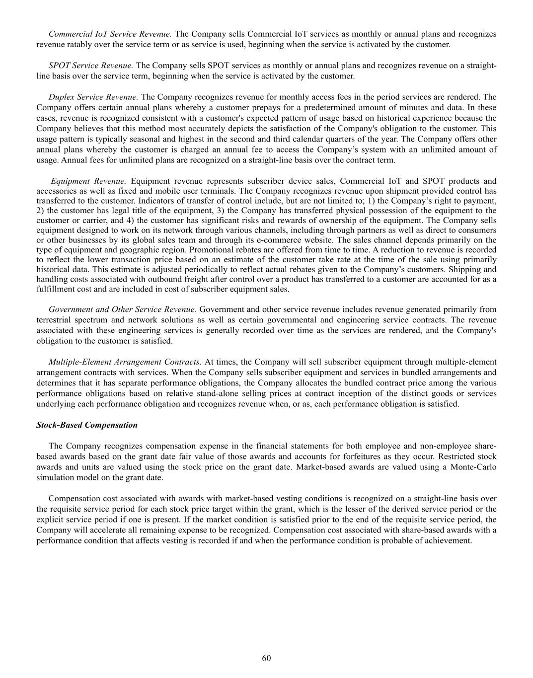 60  Commercial IoT Service Revenue. The Company sells Commercial IoT services as monthly or annual plans and recognizes  revenue ratably over the service term or as service is used, beginning when the service is activated by the customer.        SPOT Service Revenue. The Company sells SPOT services as monthly or annual plans and recognizes revenue on a straight- line basis over the service term, beginning when the service is activated by the customer.     Duplex Service Revenue. The Company recognizes revenue for monthly access fees in the period services are rendered. The  Company offers certain annual plans whereby a customer prepays for a predetermined amount of minutes and data. In these  cases, revenue is recognized consistent with a customer's expected pattern of usage based on historical experience because the  Company believes that this method most accurately depicts the satisfaction of the Company's obligation to the customer. This  usage pattern is typically seasonal and highest in the second and third calendar quarters of the year. The Company offers other  annual plans whereby the customer is charged an annual fee to access the Company’s system with an unlimited amount of  usage. Annual fees for unlimited plans are recognized on a straight-line basis over the contract term.      Equipment Revenue. Equipment revenue represents subscriber device sales, Commercial IoT and SPOT products and  accessories as well as fixed and mobile user terminals. The Company recognizes revenue upon shipment provided control has  transferred to the customer. Indicators of transfer of control include, but are not limited to; 1) the Company’s right to payment,  2) the customer has legal title of the equipment, 3) the Company has transferred physical possession of the equipment to the  customer or carrier, and 4) the customer has significant risks and rewards of ownership of the equipment. The Company sells  equipment designed to work on its network through various channels, including through partners as well as direct to consumers  or other businesses by its global sales team and through its e-commerce website. The sales channel depends primarily on the  type of equipment and geographic region. Promotional rebates are offered from time to time. A reduction to revenue is recorded  to reflect the lower transaction price based on an estimate of the customer take rate at the time of the sale using primarily  historical data. This estimate is adjusted periodically to reflect actual rebates given to the Company’s customers. Shipping and  handling costs associated with outbound freight after control over a product has transferred to a customer are accounted for as a  fulfillment cost and are included in cost of subscriber equipment sales.     Government and Other Service Revenue. Government and other service revenue includes revenue generated primarily from  terrestrial spectrum and network solutions as well as certain governmental and engineering service contracts. The revenue  associated with these engineering services is generally recorded over time as the services are rendered, and the Company's  obligation to the customer is satisfied.    Multiple-Element Arrangement Contracts. At times, the Company will sell subscriber equipment through multiple-element  arrangement contracts with services. When the Company sells subscriber equipment and services in bundled arrangements and  determines that it has separate performance obligations, the Company allocates the bundled contract price among the various  performance obligations based on relative stand-alone selling prices at contract inception of the distinct goods or services  underlying each performance obligation and recognizes revenue when, or as, each performance obligation is satisfied.     Stock-Based Compensation     The Company recognizes compensation expense in the financial statements for both employee and non-employee share- based awards based on the grant date fair value of those awards and accounts for forfeitures as they occur. Restricted stock  awards and units are valued using the stock price on the grant date. Market-based awards are valued using a Monte-Carlo  simulation model on the grant date.    Compensation cost associated with awards with market-based vesting conditions is recognized on a straight-line basis over  the requisite service period for each stock price target within the grant, which is the lesser of the derived service period or the  explicit service period if one is present. If the market condition is satisfied prior to the end of the requisite service period, the  Company will accelerate all remaining expense to be recognized. Compensation cost associated with share-based awards with a  performance condition that affects vesting is recorded if and when the performance condition is probable of achievement.