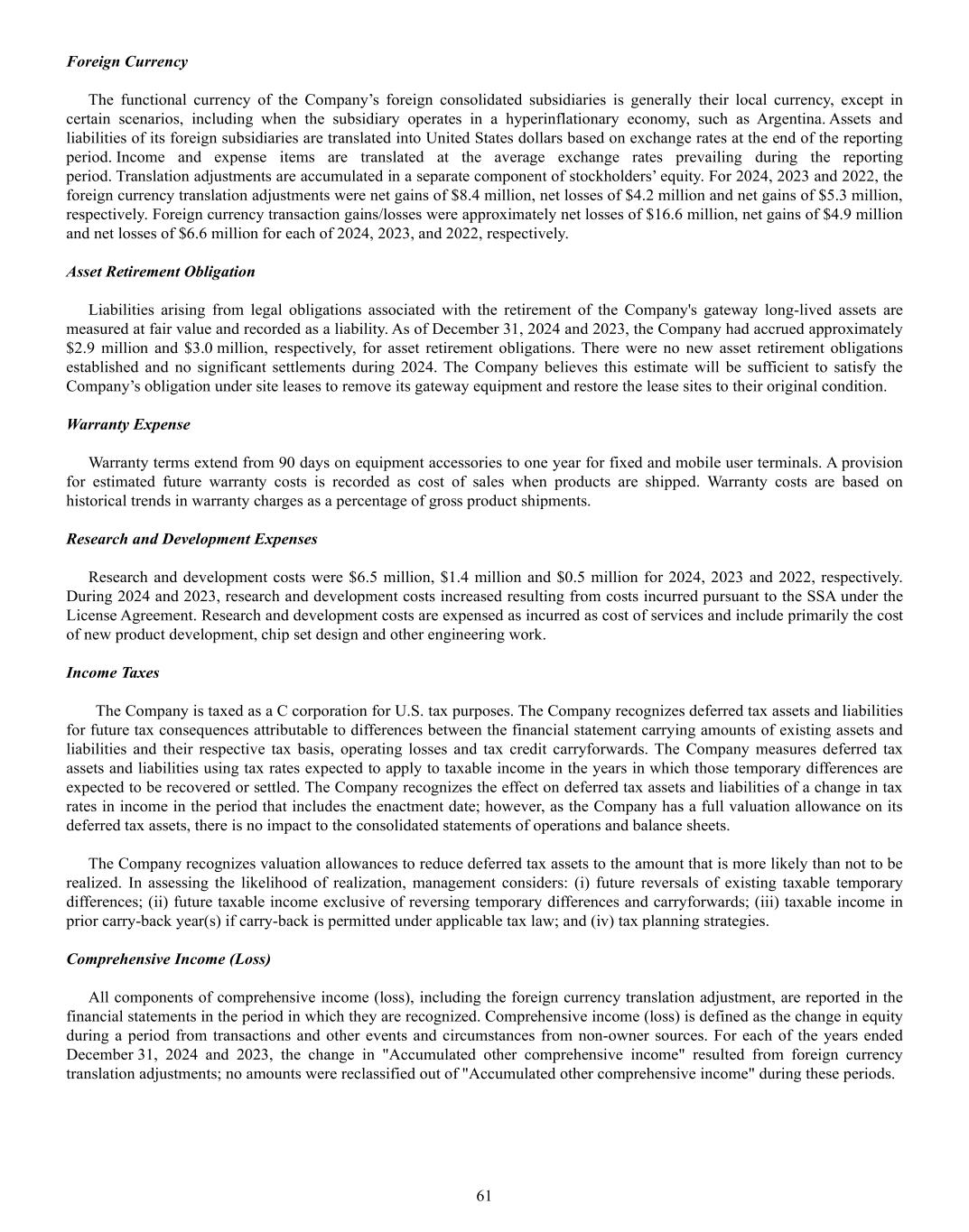 61   Foreign Currency      The functional currency of the Company’s foreign consolidated subsidiaries is generally their local currency, except in  certain scenarios, including when the subsidiary operates in a hyperinflationary economy, such as Argentina. Assets and  liabilities of its foreign subsidiaries are translated into United States dollars based on exchange rates at the end of the reporting  period. Income and expense items are translated at the average exchange rates prevailing during the reporting  period. Translation adjustments are accumulated in a separate component of stockholders’ equity. For 2024, 2023 and 2022, the  foreign currency translation adjustments were net gains of $8.4 million, net losses of $4.2 million and net gains of $5.3 million,  respectively. Foreign currency transaction gains/losses were approximately net losses of $16.6 million, net gains of $4.9 million  and net losses of $6.6 million for each of 2024, 2023, and 2022, respectively.    Asset Retirement Obligation     Liabilities arising from legal obligations associated with the retirement of the Company's gateway long-lived assets are  measured at fair value and recorded as a liability. As of December 31, 2024 and 2023, the Company had accrued approximately  $2.9 million and $3.0 million, respectively, for asset retirement obligations. There were no new asset retirement obligations  established and no significant settlements during 2024. The Company believes this estimate will be sufficient to satisfy the  Company’s obligation under site leases to remove its gateway equipment and restore the lease sites to their original condition.     Warranty Expense     Warranty terms extend from 90 days on equipment accessories to one year for fixed and mobile user terminals. A provision  for estimated future warranty costs is recorded as cost of sales when products are shipped. Warranty costs are based on  historical trends in warranty charges as a percentage of gross product shipments.      Research and Development Expenses     Research and development costs were $6.5 million, $1.4 million and $0.5 million for 2024, 2023 and 2022, respectively.  During 2024 and 2023, research and development costs increased resulting from costs incurred pursuant to the SSA under the  License Agreement. Research and development costs are expensed as incurred as cost of services and include primarily the cost  of new product development, chip set design and other engineering work.     Income Taxes     The Company is taxed as a C corporation for U.S. tax purposes. The Company recognizes deferred tax assets and liabilities  for future tax consequences attributable to differences between the financial statement carrying amounts of existing assets and  liabilities and their respective tax basis, operating losses and tax credit carryforwards. The Company measures deferred tax  assets and liabilities using tax rates expected to apply to taxable income in the years in which those temporary differences are  expected to be recovered or settled. The Company recognizes the effect on deferred tax assets and liabilities of a change in tax  rates in income in the period that includes the enactment date; however, as the Company has a full valuation allowance on its  deferred tax assets, there is no impact to the consolidated statements of operations and balance sheets.      The Company recognizes valuation allowances to reduce deferred tax assets to the amount that is more likely than not to be  realized. In assessing the likelihood of realization, management considers: (i) future reversals of existing taxable temporary  differences; (ii) future taxable income exclusive of reversing temporary differences and carryforwards; (iii) taxable income in  prior carry-back year(s) if carry-back is permitted under applicable tax law; and (iv) tax planning strategies.     Comprehensive Income (Loss)      All components of comprehensive income (loss), including the foreign currency translation adjustment, are reported in the  financial statements in the period in which they are recognized. Comprehensive income (loss) is defined as the change in equity  during a period from transactions and other events and circumstances from non-owner sources. For each of the years ended  December 31, 2024 and 2023, the change in "Accumulated other comprehensive income" resulted from foreign currency  translation adjustments; no amounts were reclassified out of "Accumulated other comprehensive income" during these periods.