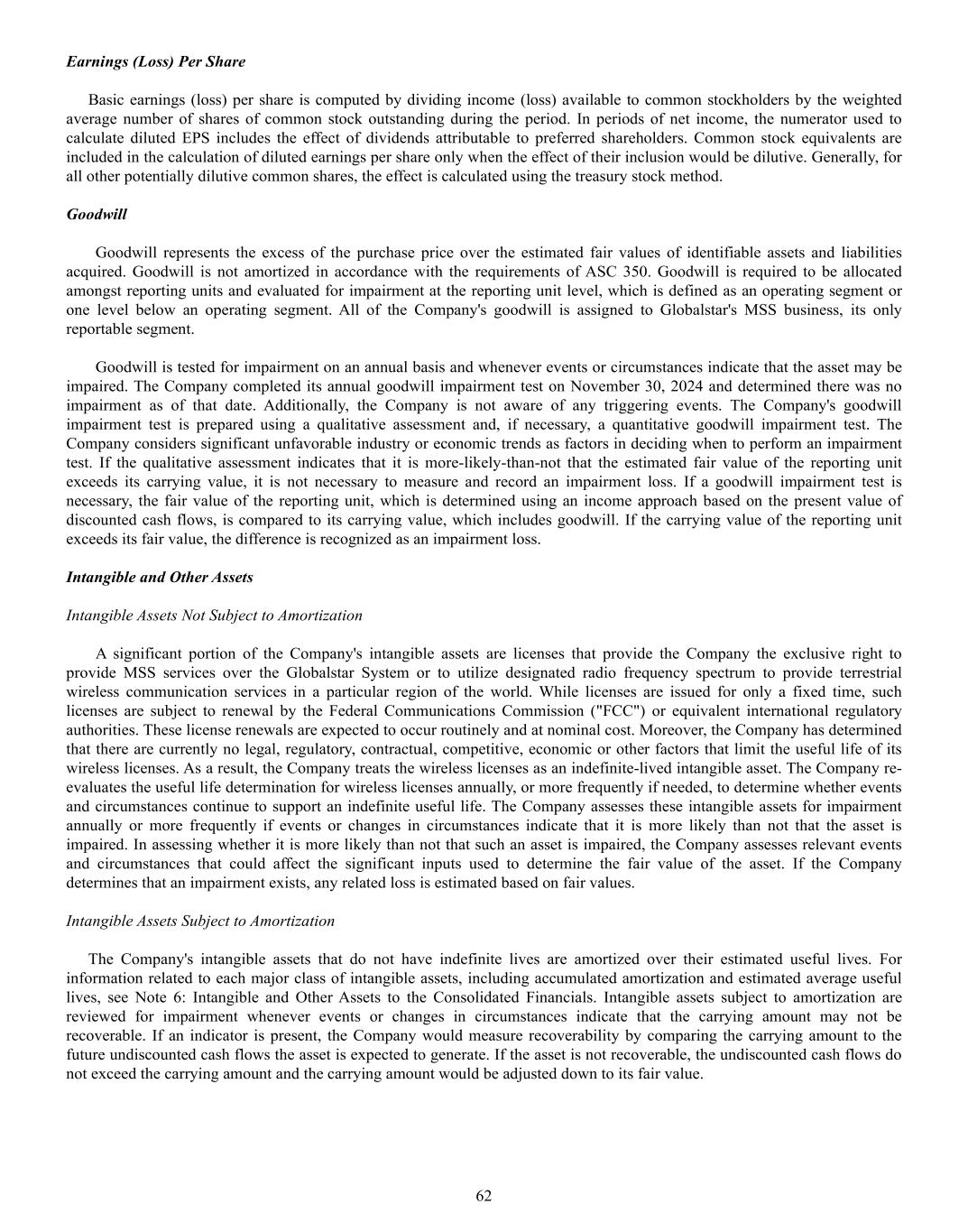 62   Earnings (Loss) Per Share     Basic earnings (loss) per share is computed by dividing income (loss) available to common stockholders by the weighted  average number of shares of common stock outstanding during the period. In periods of net income, the numerator used to  calculate diluted EPS includes the effect of dividends attributable to preferred shareholders. Common stock equivalents are  included in the calculation of diluted earnings per share only when the effect of their inclusion would be dilutive. Generally, for  all other potentially dilutive common shares, the effect is calculated using the treasury stock method.    Goodwill    Goodwill represents the excess of the purchase price over the estimated fair values of identifiable assets and liabilities  acquired. Goodwill is not amortized in accordance with the requirements of ASC 350. Goodwill is required to be allocated  amongst reporting units and evaluated for impairment at the reporting unit level, which is defined as an operating segment or  one level below an operating segment. All of the Company's goodwill is assigned to Globalstar's MSS business, its only  reportable segment.     Goodwill is tested for impairment on an annual basis and whenever events or circumstances indicate that the asset may be  impaired. The Company completed its annual goodwill impairment test on November 30, 2024 and determined there was no  impairment as of that date. Additionally, the Company is not aware of any triggering events. The Company's goodwill  impairment test is prepared using a qualitative assessment and, if necessary, a quantitative goodwill impairment test. The  Company considers significant unfavorable industry or economic trends as factors in deciding when to perform an impairment  test. If the qualitative assessment indicates that it is more-likely-than-not that the estimated fair value of the reporting unit  exceeds its carrying value, it is not necessary to measure and record an impairment loss. If a goodwill impairment test is  necessary, the fair value of the reporting unit, which is determined using an income approach based on the present value of  discounted cash flows, is compared to its carrying value, which includes goodwill. If the carrying value of the reporting unit  exceeds its fair value, the difference is recognized as an impairment loss.     Intangible and Other Assets     Intangible Assets Not Subject to Amortization     A significant portion of the Company's intangible assets are licenses that provide the Company the exclusive right to  provide MSS services over the Globalstar System or to utilize designated radio frequency spectrum to provide terrestrial  wireless communication services in a particular region of the world. While licenses are issued for only a fixed time, such  licenses are subject to renewal by the Federal Communications Commission ("FCC") or equivalent international regulatory  authorities. These license renewals are expected to occur routinely and at nominal cost. Moreover, the Company has determined  that there are currently no legal, regulatory, contractual, competitive, economic or other factors that limit the useful life of its  wireless licenses. As a result, the Company treats the wireless licenses as an indefinite-lived intangible asset. The Company re- evaluates the useful life determination for wireless licenses annually, or more frequently if needed, to determine whether events  and circumstances continue to support an indefinite useful life. The Company assesses these intangible assets for impairment  annually or more frequently if events or changes in circumstances indicate that it is more likely than not that the asset is  impaired. In assessing whether it is more likely than not that such an asset is impaired, the Company assesses relevant events  and circumstances that could affect the significant inputs used to determine the fair value of the asset. If the Company  determines that an impairment exists, any related loss is estimated based on fair values.    Intangible Assets Subject to Amortization    The Company's intangible assets that do not have indefinite lives are amortized over their estimated useful lives. For  information related to each major class of intangible assets, including accumulated amortization and estimated average useful  lives, see Note 6: Intangible and Other Assets to the Consolidated Financials. Intangible assets subject to amortization are  reviewed for impairment whenever events or changes in circumstances indicate that the carrying amount may not be  recoverable. If an indicator is present, the Company would measure recoverability by comparing the carrying amount to the  future undiscounted cash flows the asset is expected to generate. If the asset is not recoverable, the undiscounted cash flows do  not exceed the carrying amount and the carrying amount would be adjusted down to its fair value.