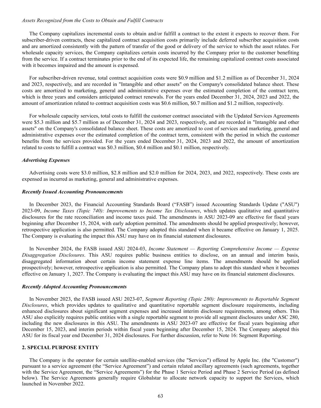 63   Assets Recognized from the Costs to Obtain and Fulfill Contracts    The Company capitalizes incremental costs to obtain and/or fulfill a contract to the extent it expects to recover them. For  subscriber-driven contracts, these capitalized contract acquisition costs primarily include deferred subscriber acquisition costs  and are amortized consistently with the pattern of transfer of the good or delivery of the service to which the asset relates. For  wholesale capacity services, the Company capitalizes certain costs incurred by the Company prior to the customer benefiting  from the service. If a contract terminates prior to the end of its expected life, the remaining capitalized contract costs associated  with it becomes impaired and the amount is expensed.     For subscriber-driven revenue, total contract acquisition costs were $0.9 million and $1.2 million as of December 31, 2024  and 2023, respectively, and are recorded in "Intangible and other assets" on the Company's consolidated balance sheet. These  costs are amortized to marketing, general and administrative expenses over the estimated completion of the contract term,  which is three years and considers anticipated contract renewals. For the years ended December 31, 2024, 2023 and 2022, the  amount of amortization related to contract acquisition costs was $0.6 million, $0.7 million and $1.2 million, respectively.     For wholesale capacity services, total costs to fulfill the customer contract associated with the Updated Services Agreements  were $5.3 million and $5.7 million as of December 31, 2024 and 2023, respectively, and are recorded in "Intangible and other  assets" on the Company's consolidated balance sheet. These costs are amortized to cost of services and marketing, general and  administrative expenses over the estimated completion of the contract term, consistent with the period in which the customer  benefits from the services provided. For the years ended December 31, 2024, 2023 and 2022, the amount of amortization  related to costs to fulfill a contract was $0.3 million, $0.4 million and $0.1 million, respectively.    Advertising Expenses     Advertising costs were $3.0 million, $2.8 million and $2.0 million for 2024, 2023, and 2022, respectively. These costs are  expensed as incurred as marketing, general and administrative expenses.    Recently Issued Accounting Pronouncements     In December 2023, the Financial Accounting Standards Board (“FASB”) issued Accounting Standards Update ("ASU")  2023-09, Income Taxes (Topic 740): Improvements to Income Tax Disclosures, which updates qualitative and quantitative  disclosures for the rate reconciliation and income taxes paid. The amendments in ASU 2023-09 are effective for fiscal years  beginning after December 15, 2024, with early adoption permitted. The amendments should be applied prospectively; however,  retrospective application is also permitted. The Company adopted this standard when it became effective on January 1, 2025.  The Company is evaluating the impact this ASU may have on its financial statement disclosures.    In November 2024, the FASB issued ASU 2024-03, Income Statement — Reporting Comprehensive Income — Expense  Disaggregation Disclosures. This ASU requires public business entities to disclose, on an annual and interim basis,  disaggregated information about certain income statement expense line items. The amendments should be applied  prospectively; however, retrospective application is also permitted. The Company plans to adopt this standard when it becomes  effective on January 1, 2027. The Company is evaluating the impact this ASU may have on its financial statement disclosures.    Recently Adopted Accounting Pronouncements    In November 2023, the FASB issued ASU 2023-07, Segment Reporting (Topic 280): Improvements to Reportable Segment  Disclosures, which provides updates to qualitative and quantitative reportable segment disclosure requirements, including  enhanced disclosures about significant segment expenses and increased interim disclosure requirements, among others. This  ASU also explicitly requires public entities with a single reportable segment to provide all segment disclosures under ASC 280,  including the new disclosures in this ASU. The amendments in ASU 2023-07 are effective for fiscal years beginning after  December 15, 2023, and interim periods within fiscal years beginning after December 15, 2024. The Company adopted this  ASU for its fiscal year end December 31, 2024 disclosures. For further discussion, refer to Note 16: Segment Reporting.    2. SPECIAL PURPOSE ENTITY    The Company is the operator for certain satellite-enabled services (the "Services") offered by Apple Inc. (the "Customer")  pursuant to a service agreement (the “Service Agreement”) and certain related ancillary agreements (such agreements, together  with the Service Agreement, the “Service Agreements”) for the Phase 1 Service Period and Phase 2 Service Period (as defined  below). The Service Agreements generally require Globalstar to allocate network capacity to support the Services, which  launched in November 2022.