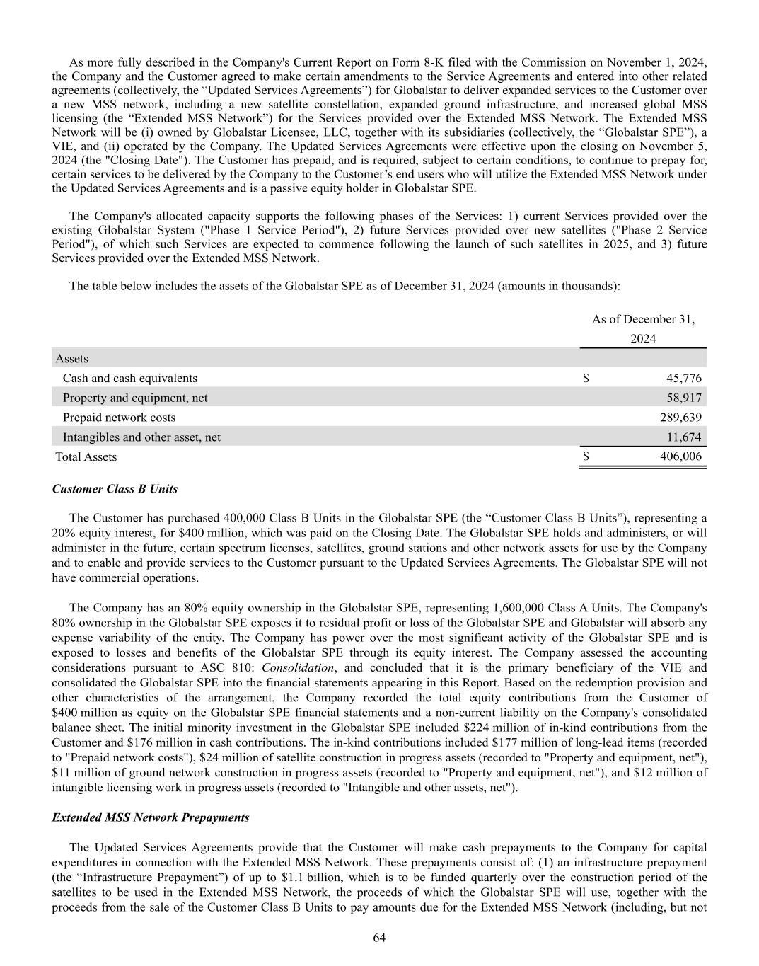 64     As more fully described in the Company's Current Report on Form 8-K filed with the Commission on November 1, 2024,  the Company and the Customer agreed to make certain amendments to the Service Agreements and entered into other related  agreements (collectively, the “Updated Services Agreements”) for Globalstar to deliver expanded services to the Customer over  a new MSS network, including a new satellite constellation, expanded ground infrastructure, and increased global MSS  licensing (the “Extended MSS Network”) for the Services provided over the Extended MSS Network. The Extended MSS  Network will be (i) owned by Globalstar Licensee, LLC, together with its subsidiaries (collectively, the “Globalstar SPE”), a  VIE, and (ii) operated by the Company. The Updated Services Agreements were effective upon the closing on November 5,  2024 (the "Closing Date"). The Customer has prepaid, and is required, subject to certain conditions, to continue to prepay for,  certain services to be delivered by the Company to the Customer’s end users who will utilize the Extended MSS Network under  the Updated Services Agreements and is a passive equity holder in Globalstar SPE.     The Company's allocated capacity supports the following phases of the Services: 1) current Services provided over the  existing Globalstar System ("Phase 1 Service Period"), 2) future Services provided over new satellites ("Phase 2 Service  Period"), of which such Services are expected to commence following the launch of such satellites in 2025, and 3) future  Services provided over the Extended MSS Network.    The table below includes the assets of the Globalstar SPE as of December 31, 2024 (amounts in thousands):      As of December 31,    2024  Assets    Cash and cash equivalents  $ 45,776   Property and equipment, net   58,917   Prepaid network costs   289,639   Intangibles and other asset, net   11,674   Total Assets  $ 406,006     Customer Class B Units    The Customer has purchased 400,000 Class B Units in the Globalstar SPE (the “Customer Class B Units”), representing a  20% equity interest, for $400 million, which was paid on the Closing Date. The Globalstar SPE holds and administers, or will  administer in the future, certain spectrum licenses, satellites, ground stations and other network assets for use by the Company  and to enable and provide services to the Customer pursuant to the Updated Services Agreements. The Globalstar SPE will not  have commercial operations.    The Company has an 80% equity ownership in the Globalstar SPE, representing 1,600,000 Class A Units. The Company's  80% ownership in the Globalstar SPE exposes it to residual profit or loss of the Globalstar SPE and Globalstar will absorb any  expense variability of the entity. The Company has power over the most significant activity of the Globalstar SPE and is  exposed to losses and benefits of the Globalstar SPE through its equity interest. The Company assessed the accounting  considerations pursuant to ASC 810: Consolidation, and concluded that it is the primary beneficiary of the VIE and  consolidated the Globalstar SPE into the financial statements appearing in this Report. Based on the redemption provision and  other characteristics of the arrangement, the Company recorded the total equity contributions from the Customer of  $400 million as equity on the Globalstar SPE financial statements and a non-current liability on the Company's consolidated  balance sheet. The initial minority investment in the Globalstar SPE included $224 million of in-kind contributions from the  Customer and $176 million in cash contributions. The in-kind contributions included $177 million of long-lead items (recorded  to "Prepaid network costs"), $24 million of satellite construction in progress assets (recorded to "Property and equipment, net"),  $11 million of ground network construction in progress assets (recorded to "Property and equipment, net"), and $12 million of  intangible licensing work in progress assets (recorded to "Intangible and other assets, net").     Extended MSS Network Prepayments    The Updated Services Agreements provide that the Customer will make cash prepayments to the Company for capital  expenditures in connection with the Extended MSS Network. These prepayments consist of: (1) an infrastructure prepayment  (the “Infrastructure Prepayment”) of up to $1.1 billion, which is to be funded quarterly over the construction period of the  satellites to be used in the Extended MSS Network, the proceeds of which the Globalstar SPE will use, together with the  proceeds from the sale of the Customer Class B Units to pay amounts due for the Extended MSS Network (including, but not