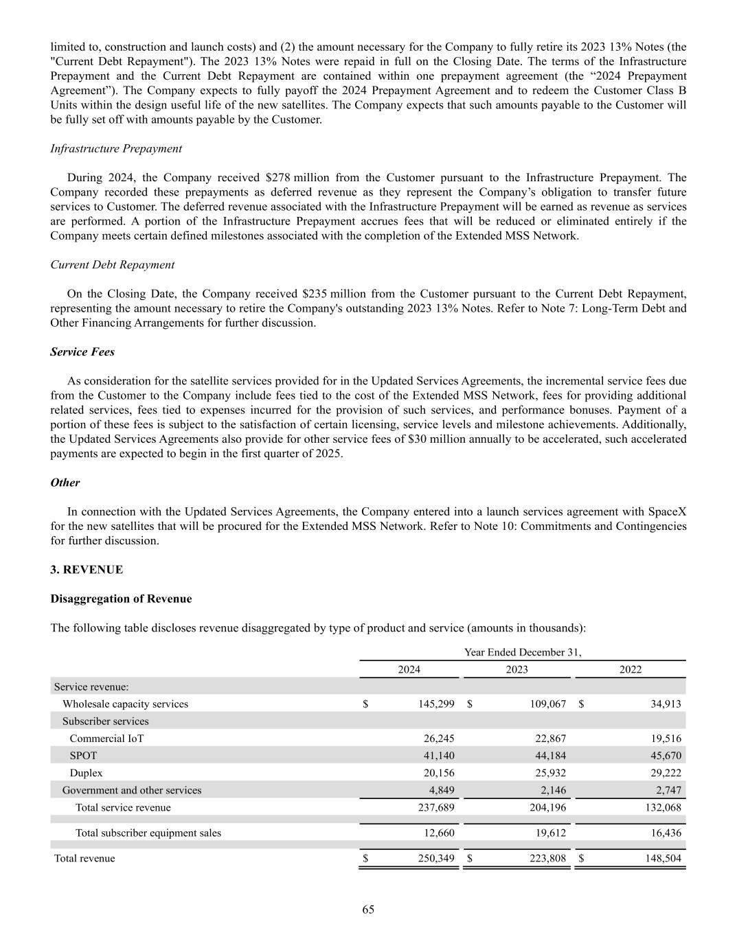 65   limited to, construction and launch costs) and (2) the amount necessary for the Company to fully retire its 2023 13% Notes (the  "Current Debt Repayment"). The 2023 13% Notes were repaid in full on the Closing Date. The terms of the Infrastructure  Prepayment and the Current Debt Repayment are contained within one prepayment agreement (the “2024 Prepayment  Agreement”). The Company expects to fully payoff the 2024 Prepayment Agreement and to redeem the Customer Class B  Units within the design useful life of the new satellites. The Company expects that such amounts payable to the Customer will  be fully set off with amounts payable by the Customer.     Infrastructure Prepayment    During 2024, the Company received $278 million from the Customer pursuant to the Infrastructure Prepayment. The  Company recorded these prepayments as deferred revenue as they represent the Company’s obligation to transfer future  services to Customer. The deferred revenue associated with the Infrastructure Prepayment will be earned as revenue as services  are performed. A portion of the Infrastructure Prepayment accrues fees that will be reduced or eliminated entirely if the  Company meets certain defined milestones associated with the completion of the Extended MSS Network.    Current Debt Repayment    On the Closing Date, the Company received $235 million from the Customer pursuant to the Current Debt Repayment,  representing the amount necessary to retire the Company's outstanding 2023 13% Notes. Refer to Note 7: Long-Term Debt and  Other Financing Arrangements for further discussion.    Service Fees    As consideration for the satellite services provided for in the Updated Services Agreements, the incremental service fees due  from the Customer to the Company include fees tied to the cost of the Extended MSS Network, fees for providing additional  related services, fees tied to expenses incurred for the provision of such services, and performance bonuses. Payment of a  portion of these fees is subject to the satisfaction of certain licensing, service levels and milestone achievements. Additionally,  the Updated Services Agreements also provide for other service fees of $30 million annually to be accelerated, such accelerated  payments are expected to begin in the first quarter of 2025.    Other    In connection with the Updated Services Agreements, the Company entered into a launch services agreement with SpaceX  for the new satellites that will be procured for the Extended MSS Network. Refer to Note 10: Commitments and Contingencies  for further discussion.    3. REVENUE     Disaggregation of Revenue    The following table discloses revenue disaggregated by type of product and service (amounts in thousands):   Year Ended December 31,   2024  2023  2022  Service revenue:       Wholesale capacity services $ 145,299  $ 109,067  $ 34,913   Subscriber services       Commercial IoT  26,245   22,867   19,516   SPOT  41,140   44,184   45,670   Duplex  20,156   25,932   29,222   Government and other services  4,849   2,146   2,747   Total service revenue  237,689   204,196   132,068   Total subscriber equipment sales  12,660   19,612   16,436   Total revenue $ 250,349  $ 223,808  $ 148,504