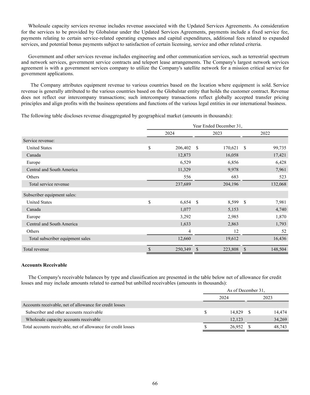 66     Wholesale capacity services revenue includes revenue associated with the Updated Services Agreements. As consideration  for the services to be provided by Globalstar under the Updated Services Agreements, payments include a fixed service fee,  payments relating to certain service-related operating expenses and capital expenditures, additional fees related to expanded  services, and potential bonus payments subject to satisfaction of certain licensing, service and other related criteria.    Government and other services revenue includes engineering and other communication services, such as terrestrial spectrum  and network services, government service contracts and teleport lease arrangements. The Company's largest network services  agreement is with a government services company to utilize the Company's satellite network for a mission critical service for  government applications.    The Company attributes equipment revenue to various countries based on the location where equipment is sold. Service  revenue is generally attributed to the various countries based on the Globalstar entity that holds the customer contract. Revenue  does not reflect our intercompany transactions; such intercompany transactions reflect globally accepted transfer pricing  principles and align profits with the business operations and functions of the various legal entities in our international business.     The following table discloses revenue disaggregated by geographical market (amounts in thousands):   Year Ended December 31,   2024  2023  2022  Service revenue:       United States $ 206,402  $ 170,621  $ 99,735   Canada  12,873   16,058   17,421   Europe  6,529   6,856   6,428   Central and South America  11,329   9,978   7,961   Others  556   683   523   Total service revenue  237,689   204,196   132,068   Subscriber equipment sales:       United States $ 6,654  $ 8,599  $ 7,981   Canada  1,077   5,153   4,740   Europe  3,292   2,985   1,870   Central and South America  1,633   2,863   1,793   Others  4   12   52   Total subscriber equipment sales  12,660   19,612   16,436   Total revenue $ 250,349  $ 223,808  $ 148,504     Accounts Receivable    The Company's receivable balances by type and classification are presented in the table below net of allowance for credit  losses and may include amounts related to earned but unbilled receivables (amounts in thousands):    As of December 31,    2024  2023  Accounts receivable, net of allowance for credit losses      Subscriber and other accounts receivable  $ 14,829  $ 14,474   Wholesale capacity accounts receivable   12,123    34,269   Total accounts receivable, net of allowance for credit losses  $ 26,952  $ 48,743