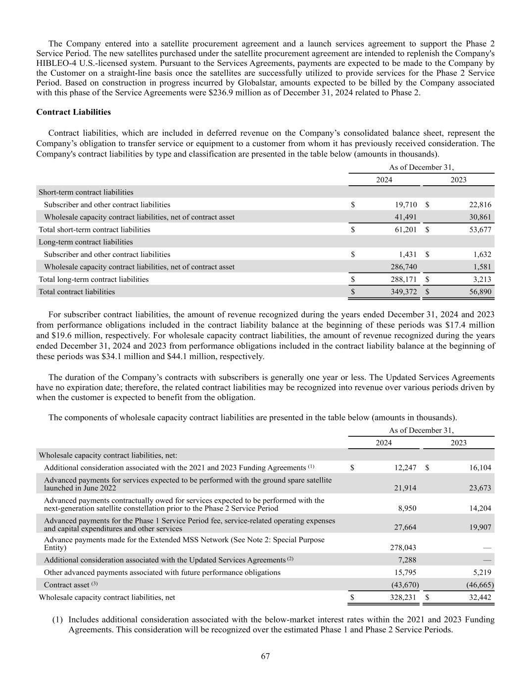 67     The Company entered into a satellite procurement agreement and a launch services agreement to support the Phase 2  Service Period. The new satellites purchased under the satellite procurement agreement are intended to replenish the Company's  HIBLEO-4 U.S.-licensed system. Pursuant to the Services Agreements, payments are expected to be made to the Company by  the Customer on a straight-line basis once the satellites are successfully utilized to provide services for the Phase 2 Service  Period. Based on construction in progress incurred by Globalstar, amounts expected to be billed by the Company associated  with this phase of the Service Agreements were $236.9 million as of December 31, 2024 related to Phase 2.    Contract Liabilities    Contract liabilities, which are included in deferred revenue on the Company’s consolidated balance sheet, represent the  Company’s obligation to transfer service or equipment to a customer from whom it has previously received consideration. The  Company's contract liabilities by type and classification are presented in the table below (amounts in thousands).    As of December 31,    2024  2023  Short-term contract liabilities      Subscriber and other contract liabilities  $ 19,710  $ 22,816   Wholesale capacity contract liabilities, net of contract asset   41,491   30,861   Total short-term contract liabilities  $ 61,201  $ 53,677   Long-term contract liabilities      Subscriber and other contract liabilities  $ 1,431  $ 1,632   Wholesale capacity contract liabilities, net of contract asset   286,740   1,581   Total long-term contract liabilities  $ 288,171  $ 3,213   Total contract liabilities  $ 349,372  $ 56,890     For subscriber contract liabilities, the amount of revenue recognized during the years ended December 31, 2024 and 2023  from performance obligations included in the contract liability balance at the beginning of these periods was $17.4 million  and $19.6 million, respectively. For wholesale capacity contract liabilities, the amount of revenue recognized during the years  ended December 31, 2024 and 2023 from performance obligations included in the contract liability balance at the beginning of  these periods was $34.1 million and $44.1 million, respectively.    The duration of the Company’s contracts with subscribers is generally one year or less. The Updated Services Agreements  have no expiration date; therefore, the related contract liabilities may be recognized into revenue over various periods driven by  when the customer is expected to benefit from the obligation.    The components of wholesale capacity contract liabilities are presented in the table below (amounts in thousands).    As of December 31,    2024  2023  Wholesale capacity contract liabilities, net:      Additional consideration associated with the 2021 and 2023 Funding Agreements (1)  $ 12,247   $ 16,104   Advanced payments for services expected to be performed with the ground spare satellite  launched in June 2022   21,914    23,673   Advanced payments contractually owed for services expected to be performed with the  next-generation satellite constellation prior to the Phase 2 Service Period   8,950    14,204   Advanced payments for the Phase 1 Service Period fee, service-related operating expenses  and capital expenditures and other services   27,664    19,907   Advance payments made for the Extended MSS Network (See Note 2: Special Purpose  Entity)   278,043    —   Additional consideration associated with the Updated Services Agreements (2)   7,288    —   Other advanced payments associated with future performance obligations   15,795    5,219   Contract asset (3)   (43,670)   (46,665)  Wholesale capacity contract liabilities, net  $ 328,231  $ 32,442     (1) Includes additional consideration associated with the below-market interest rates within the 2021 and 2023 Funding  Agreements. This consideration will be recognized over the estimated Phase 1 and Phase 2 Service Periods.