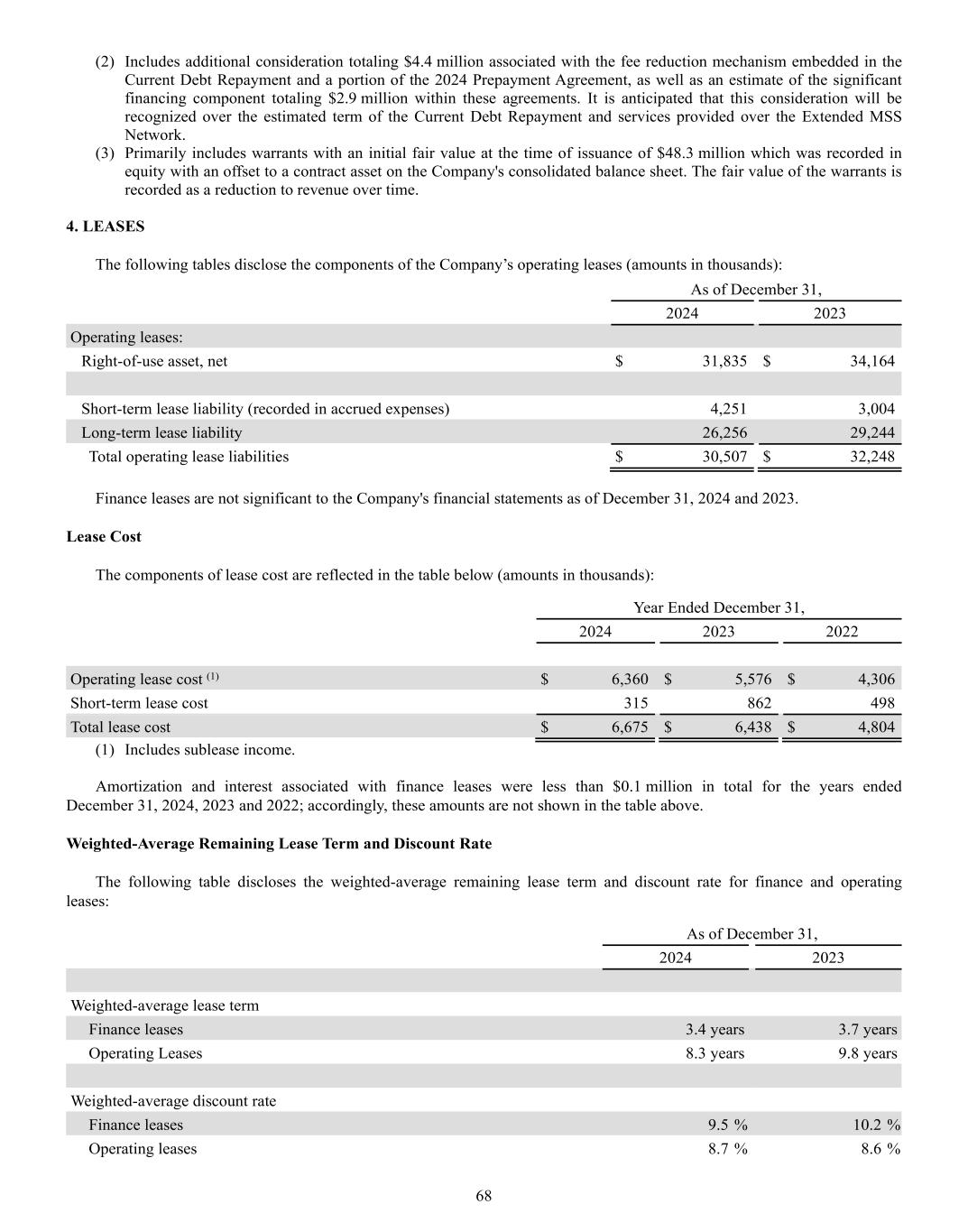 68   (2) Includes additional consideration totaling $4.4 million associated with the fee reduction mechanism embedded in the  Current Debt Repayment and a portion of the 2024 Prepayment Agreement, as well as an estimate of the significant  financing component totaling $2.9 million within these agreements. It is anticipated that this consideration will be  recognized over the estimated term of the Current Debt Repayment and services provided over the Extended MSS  Network.  (3) Primarily includes warrants with an initial fair value at the time of issuance of $48.3 million which was recorded in  equity with an offset to a contract asset on the Company's consolidated balance sheet. The fair value of the warrants is  recorded as a reduction to revenue over time.    4. LEASES     The following tables disclose the components of the Company’s operating leases (amounts in thousands):    As of December 31,    2024  2023  Operating leases:      Right-of-use asset, net  $ 31,835  $ 34,164         Short-term lease liability (recorded in accrued expenses)   4,251   3,004   Long-term lease liability   26,256   29,244   Total operating lease liabilities  $ 30,507  $ 32,248     Finance leases are not significant to the Company's financial statements as of December 31, 2024 and 2023.    Lease Cost     The components of lease cost are reflected in the table below (amounts in thousands):    Year Ended December 31,    2024  2023  2022          Operating lease cost (1)  $ 6,360   $ 5,576   $ 4,306   Short-term lease cost   315    862    498   Total lease cost  $ 6,675  $ 6,438  $ 4,804   (1) Includes sublease income.    Amortization and interest associated with finance leases were less than $0.1 million in total for the years ended  December 31, 2024, 2023 and 2022; accordingly, these amounts are not shown in the table above.    Weighted-Average Remaining Lease Term and Discount Rate     The following table discloses the weighted-average remaining lease term and discount rate for finance and operating  leases:    As of December 31,    2024  2023        Weighted-average lease term      Finance leases  3.4 years  3.7 years  Operating Leases  8.3 years  9.8 years        Weighted-average discount rate      Finance leases  9.5 %  10.2 %  Operating leases  8.7 %  8.6 %