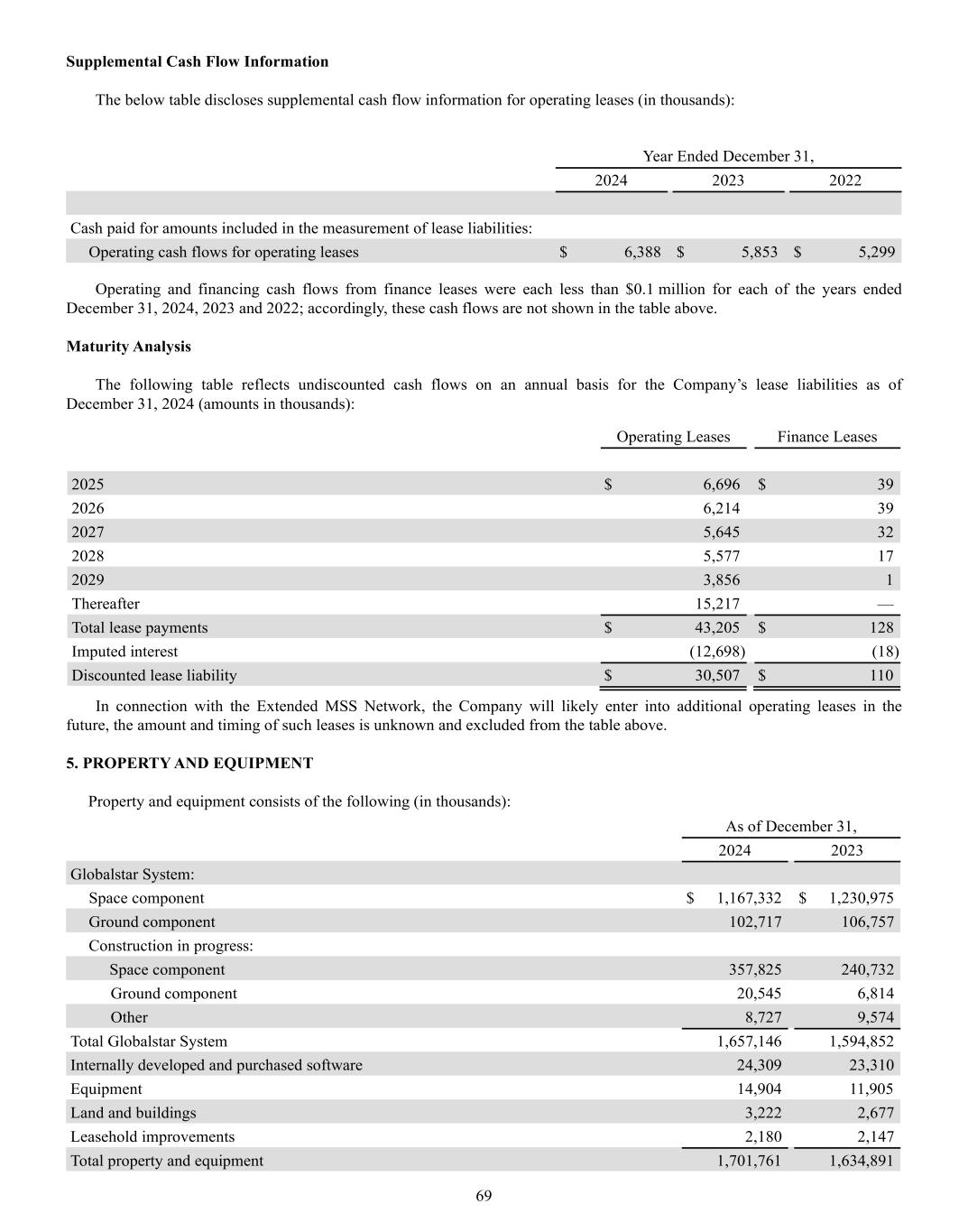 69   Supplemental Cash Flow Information     The below table discloses supplemental cash flow information for operating leases (in thousands):     Year Ended December 31,    2024  2023  2022          Cash paid for amounts included in the measurement of lease liabilities:        Operating cash flows for operating leases  $ 6,388   $ 5,853   $ 5,299     Operating and financing cash flows from finance leases were each less than $0.1 million for each of the years ended  December 31, 2024, 2023 and 2022; accordingly, these cash flows are not shown in the table above.    Maturity Analysis     The following table reflects undiscounted cash flows on an annual basis for the Company’s lease liabilities as of  December 31, 2024 (amounts in thousands):    Operating Leases  Finance Leases        2025  $ 6,696   $ 39   2026   6,214    39   2027   5,645    32   2028   5,577    17   2029   3,856    1   Thereafter   15,217    —   Total lease payments  $ 43,205  $ 128   Imputed interest   (12,698)   (18)  Discounted lease liability  $ 30,507  $ 110   In connection with the Extended MSS Network, the Company will likely enter into additional operating leases in the  future, the amount and timing of such leases is unknown and excluded from the table above.    5. PROPERTY AND EQUIPMENT      Property and equipment consists of the following (in thousands):   As of December 31,   2024  2023  Globalstar System:       Space component $ 1,167,332  $ 1,230,975   Ground component  102,717   106,757   Construction in progress:      Space component  357,825   240,732   Ground component  20,545   6,814   Other  8,727   9,574   Total Globalstar System  1,657,146   1,594,852   Internally developed and purchased software  24,309   23,310   Equipment  14,904   11,905   Land and buildings  3,222   2,677   Leasehold improvements  2,180   2,147   Total property and equipment  1,701,761   1,634,891