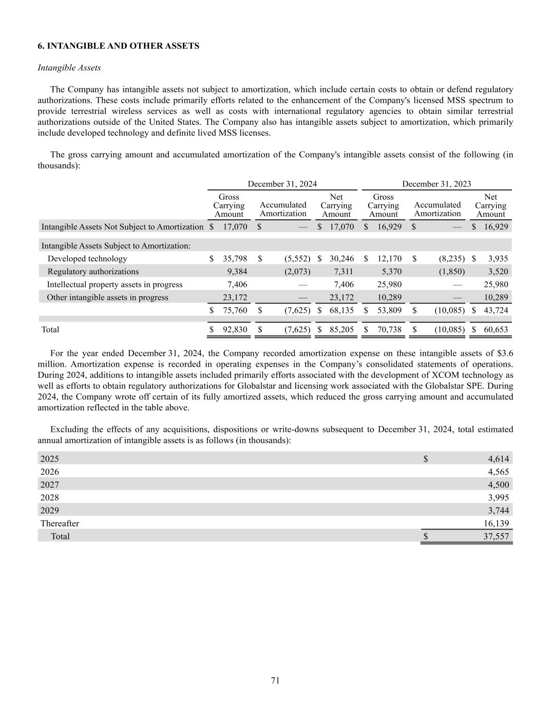 71  6. INTANGIBLE AND OTHER ASSETS    Intangible Assets    The Company has intangible assets not subject to amortization, which include certain costs to obtain or defend regulatory  authorizations. These costs include primarily efforts related to the enhancement of the Company's licensed MSS spectrum to  provide terrestrial wireless services as well as costs with international regulatory agencies to obtain similar terrestrial  authorizations outside of the United States. The Company also has intangible assets subject to amortization, which primarily  include developed technology and definite lived MSS licenses.     The gross carrying amount and accumulated amortization of the Company's intangible assets consist of the following (in  thousands):   December 31, 2024  December 31, 2023    Gross  Carrying  Amount   Accumulated  Amortization   Net  Carrying  Amount   Gross  Carrying  Amount   Accumulated  Amortization   Net  Carrying  Amount  Intangible Assets Not Subject to Amortization $ 17,070  $ —  $ 17,070  $ 16,929  $ —  $ 16,929   Intangible Assets Subject to Amortization:             Developed technology $ 35,798  $ (5,552) $ 30,246  $ 12,170  $ (8,235) $ 3,935   Regulatory authorizations  9,384   (2,073)  7,311   5,370   (1,850)  3,520   Intellectual property assets in progress  7,406    —    7,406    25,980    —    25,980   Other intangible assets in progress  23,172   —   23,172   10,289   —   10,289    $ 75,760  $ (7,625) $ 68,135  $ 53,809  $ (10,085) $ 43,724   Total $ 92,830  $ (7,625) $ 85,205  $ 70,738  $ (10,085) $ 60,653     For the year ended December 31, 2024, the Company recorded amortization expense on these intangible assets of $3.6  million. Amortization expense is recorded in operating expenses in the Company’s consolidated statements of operations.  During 2024, additions to intangible assets included primarily efforts associated with the development of XCOM technology as  well as efforts to obtain regulatory authorizations for Globalstar and licensing work associated with the Globalstar SPE. During  2024, the Company wrote off certain of its fully amortized assets, which reduced the gross carrying amount and accumulated  amortization reflected in the table above.     Excluding the effects of any acquisitions, dispositions or write-downs subsequent to December 31, 2024, total estimated  annual amortization of intangible assets is as follows (in thousands):  2025 $ 4,614   2026  4,565   2027  4,500   2028  3,995   2029  3,744   Thereafter  16,139   Total $ 37,557