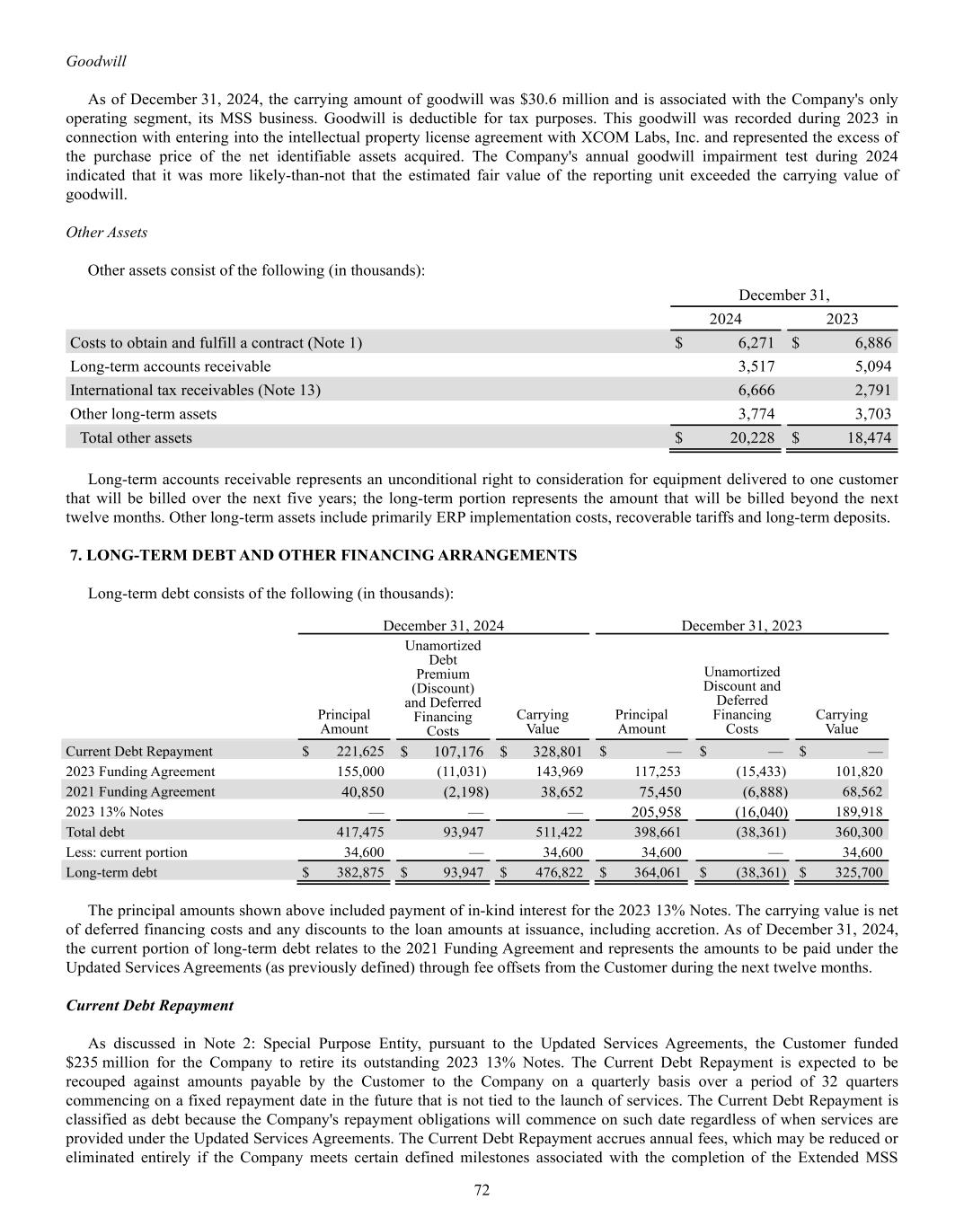 72   Goodwill    As of December 31, 2024, the carrying amount of goodwill was $30.6 million and is associated with the Company's only  operating segment, its MSS business. Goodwill is deductible for tax purposes. This goodwill was recorded during 2023 in  connection with entering into the intellectual property license agreement with XCOM Labs, Inc. and represented the excess of  the purchase price of the net identifiable assets acquired. The Company's annual goodwill impairment test during 2024  indicated that it was more likely-than-not that the estimated fair value of the reporting unit exceeded the carrying value of  goodwill.    Other Assets     Other assets consist of the following (in thousands):   December 31,   2024  2023  Costs to obtain and fulfill a contract (Note 1) $ 6,271  $ 6,886   Long-term accounts receivable  3,517   5,094   International tax receivables (Note 13)  6,666   2,791   Other long-term assets  3,774   3,703   Total other assets $ 20,228  $ 18,474     Long-term accounts receivable represents an unconditional right to consideration for equipment delivered to one customer  that will be billed over the next five years; the long-term portion represents the amount that will be billed beyond the next  twelve months. Other long-term assets include primarily ERP implementation costs, recoverable tariffs and long-term deposits.      7. LONG-TERM DEBT AND OTHER FINANCING ARRANGEMENTS      Long-term debt consists of the following (in thousands):     December 31, 2024  December 31, 2023    Principal  Amount   Unamortized  Debt  Premium  (Discount)  and Deferred  Financing  Costs   Carrying  Value   Principal  Amount   Unamortized  Discount and  Deferred  Financing  Costs   Carrying  Value  Current Debt Repayment $ 221,625  $ 107,176  $ 328,801  $ —  $ —  $ —   2023 Funding Agreement  155,000   (11,031)   143,969   117,253   (15,433)   101,820   2021 Funding Agreement  40,850    (2,198)   38,652    75,450   (6,888)   68,562   2023 13% Notes  —    —    —    205,958   (16,040)   189,918   Total debt  417,475   93,947   511,422   398,661   (38,361)   360,300   Less: current portion  34,600   —   34,600   34,600   —   34,600   Long-term debt $ 382,875  $ 93,947  $ 476,822  $ 364,061  $ (38,361)  $ 325,700     The principal amounts shown above included payment of in-kind interest for the 2023 13% Notes. The carrying value is net  of deferred financing costs and any discounts to the loan amounts at issuance, including accretion. As of December 31, 2024,  the current portion of long-term debt relates to the 2021 Funding Agreement and represents the amounts to be paid under the  Updated Services Agreements (as previously defined) through fee offsets from the Customer during the next twelve months.    Current Debt Repayment    As discussed in Note 2: Special Purpose Entity, pursuant to the Updated Services Agreements, the Customer funded  $235 million for the Company to retire its outstanding 2023 13% Notes. The Current Debt Repayment is expected to be  recouped against amounts payable by the Customer to the Company on a quarterly basis over a period of 32 quarters  commencing on a fixed repayment date in the future that is not tied to the launch of services. The Current Debt Repayment is  classified as debt because the Company's repayment obligations will commence on such date regardless of when services are  provided under the Updated Services Agreements. The Current Debt Repayment accrues annual fees, which may be reduced or  eliminated entirely if the Company meets certain defined milestones associated with the completion of the Extended MSS