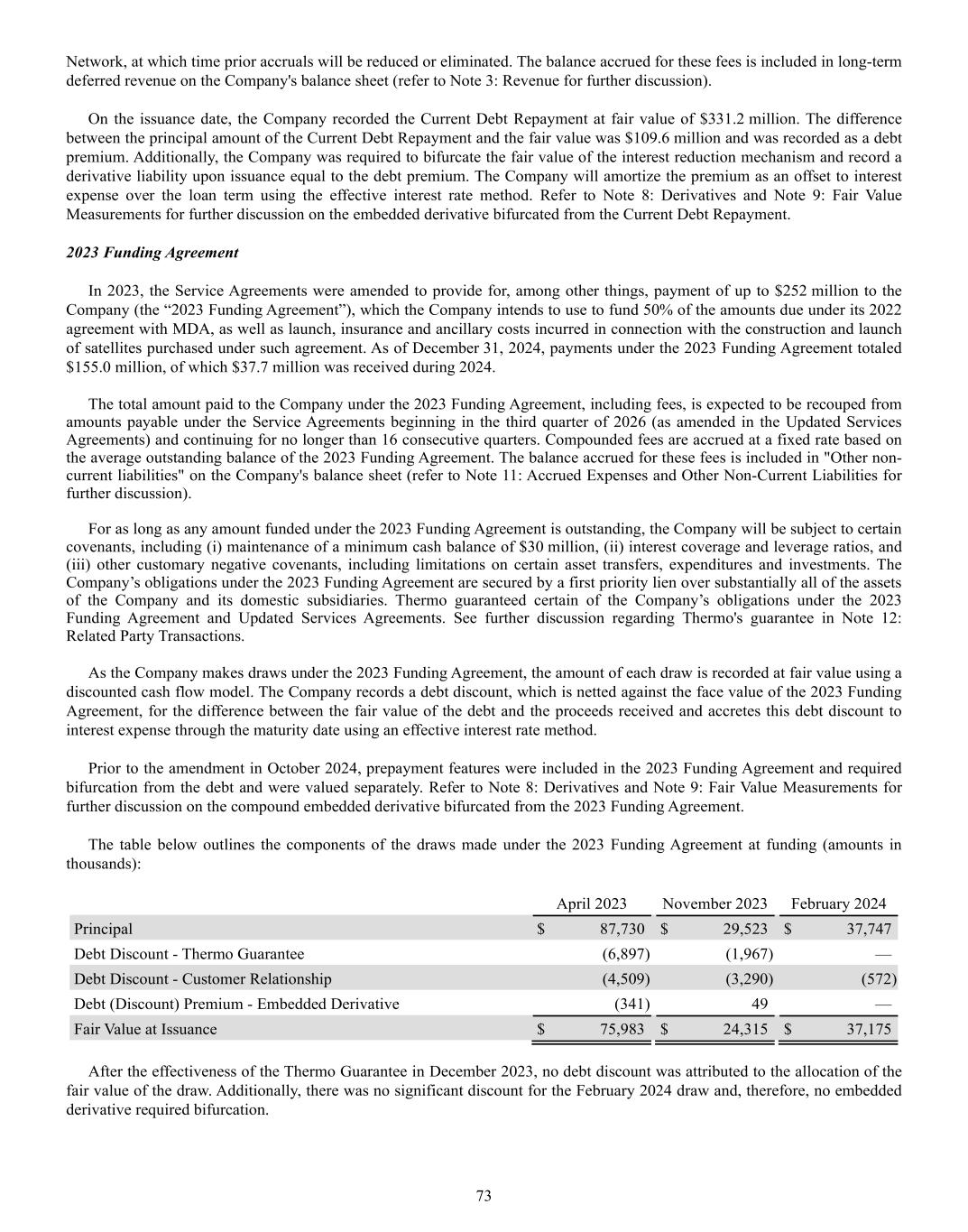 73   Network, at which time prior accruals will be reduced or eliminated. The balance accrued for these fees is included in long-term  deferred revenue on the Company's balance sheet (refer to Note 3: Revenue for further discussion).     On the issuance date, the Company recorded the Current Debt Repayment at fair value of $331.2 million. The difference  between the principal amount of the Current Debt Repayment and the fair value was $109.6 million and was recorded as a debt  premium. Additionally, the Company was required to bifurcate the fair value of the interest reduction mechanism and record a  derivative liability upon issuance equal to the debt premium. The Company will amortize the premium as an offset to interest  expense over the loan term using the effective interest rate method. Refer to Note 8: Derivatives and Note 9: Fair Value  Measurements for further discussion on the embedded derivative bifurcated from the Current Debt Repayment.    2023 Funding Agreement    In 2023, the Service Agreements were amended to provide for, among other things, payment of up to $252 million to the  Company (the “2023 Funding Agreement”), which the Company intends to use to fund 50% of the amounts due under its 2022  agreement with MDA, as well as launch, insurance and ancillary costs incurred in connection with the construction and launch  of satellites purchased under such agreement. As of December 31, 2024, payments under the 2023 Funding Agreement totaled  $155.0 million, of which $37.7 million was received during 2024.    The total amount paid to the Company under the 2023 Funding Agreement, including fees, is expected to be recouped from  amounts payable under the Service Agreements beginning in the third quarter of 2026 (as amended in the Updated Services  Agreements) and continuing for no longer than 16 consecutive quarters. Compounded fees are accrued at a fixed rate based on  the average outstanding balance of the 2023 Funding Agreement. The balance accrued for these fees is included in "Other non- current liabilities" on the Company's balance sheet (refer to Note 11: Accrued Expenses and Other Non-Current Liabilities for  further discussion).     For as long as any amount funded under the 2023 Funding Agreement is outstanding, the Company will be subject to certain  covenants, including (i) maintenance of a minimum cash balance of $30 million, (ii) interest coverage and leverage ratios, and  (iii) other customary negative covenants, including limitations on certain asset transfers, expenditures and investments. The  Company’s obligations under the 2023 Funding Agreement are secured by a first priority lien over substantially all of the assets  of the Company and its domestic subsidiaries. Thermo guaranteed certain of the Company’s obligations under the 2023  Funding Agreement and Updated Services Agreements. See further discussion regarding Thermo's guarantee in Note 12:  Related Party Transactions.    As the Company makes draws under the 2023 Funding Agreement, the amount of each draw is recorded at fair value using a  discounted cash flow model. The Company records a debt discount, which is netted against the face value of the 2023 Funding  Agreement, for the difference between the fair value of the debt and the proceeds received and accretes this debt discount to  interest expense through the maturity date using an effective interest rate method.     Prior to the amendment in October 2024, prepayment features were included in the 2023 Funding Agreement and required  bifurcation from the debt and were valued separately. Refer to Note 8: Derivatives and Note 9: Fair Value Measurements for  further discussion on the compound embedded derivative bifurcated from the 2023 Funding Agreement.    The table below outlines the components of the draws made under the 2023 Funding Agreement at funding (amounts in  thousands):   April 2023  November 2023  February 2024  Principal  $ 87,730   $ 29,523   $ 37,747   Debt Discount - Thermo Guarantee  (6,897)   (1,967)   —   Debt Discount - Customer Relationship  (4,509)   (3,290)   (572)  Debt (Discount) Premium - Embedded Derivative  (341)   49    —   Fair Value at Issuance $ 75,983   $ 24,315   $ 37,175     After the effectiveness of the Thermo Guarantee in December 2023, no debt discount was attributed to the allocation of the  fair value of the draw. Additionally, there was no significant discount for the February 2024 draw and, therefore, no embedded  derivative required bifurcation.