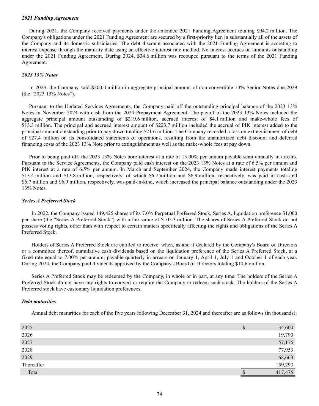 74   During 2021, the Company received payments under the amended 2021 Funding Agreement totaling $94.2 million. The  Company's obligations under the 2021 Funding Agreement are secured by a first-priority lien in substantially all of the assets of  the Company and its domestic subsidiaries. The debt discount associated with the 2021 Funding Agreement is accreting to  interest expense through the maturity date using an effective interest rate method. No interest accrues on amounts outstanding  under the 2021 Funding Agreement. During 2024, $34.6 million was recouped pursuant to the terms of the 2021 Funding  Agreement.    2023 13% Notes    In 2023, the Company sold $200.0 million in aggregate principal amount of non-convertible 13% Senior Notes due 2029  (the “2023 13% Notes”).    Pursuant to the Updated Services Agreements, the Company paid off the outstanding principal balance of the 2023 13%  Notes in November 2024 with cash from the 2024 Prepayment Agreement. The payoff of the 2023 13% Notes included the  aggregate principal amount outstanding of $219.6 million, accrued interest of $4.1 million and make-whole fees of  $13.3 million. The principal and accrued interest amount of $223.7 million included the accrual of PIK interest added to the  principal amount outstanding prior to pay down totaling $21.6 million. The Company recorded a loss on extinguishment of debt  of $27.4 million on its consolidated statements of operations, resulting from the unamortized debt discount and deferred  financing costs of the 2023 13% Note prior to extinguishment as well as the make-whole fees at pay down.    Prior to being paid off, the 2023 13% Notes bore interest at a rate of 13.00% per annum payable semi-annually in arrears.  Pursuant to the Service Agreements, the Company paid cash interest on the 2023 13% Notes at a rate of 6.5% per annum and  PIK interest at a rate of 6.5% per annum. In March and September 2024, the Company made interest payments totaling  $13.4 million and $13.8 million, respectively, of which $6.7 million and $6.9 million, respectively, was paid in cash and  $6.7 million and $6.9 million, respectively, was paid-in-kind, which increased the principal balance outstanding under the 2023  13% Notes.    Series A Preferred Stock     In 2022, the Company issued 149,425 shares of its 7.0% Perpetual Preferred Stock, Series A, liquidation preference $1,000  per share (the “Series A Preferred Stock”) with a fair value of $105.3 million. The shares of Series A Preferred Stock do not  possess voting rights, other than with respect to certain matters specifically affecting the rights and obligations of the Series A  Preferred Stock.    Holders of Series A Preferred Stock are entitled to receive, when, as and if declared by the Company's Board of Directors  or a committee thereof, cumulative cash dividends based on the liquidation preference of the Series A Preferred Stock, at a  fixed rate equal to 7.00% per annum, payable quarterly in arrears on January 1, April 1, July 1 and October 1 of each year.  During 2024, the Company paid dividends approved by the Company's Board of Directors totaling $10.6 million.    Series A Preferred Stock may be redeemed by the Company, in whole or in part, at any time. The holders of the Series A  Preferred Stock do not have any rights to convert or require the Company to redeem such stock. The holders of the Series A  Preferred stock have customary liquidation preferences.     Debt maturities  Annual debt maturities for each of the five years following December 31, 2024 and thereafter are as follows (in thousands):    2025 $ 34,600   2026  19,790   2027  57,176   2028  77,953   2029  68,663   Thereafter  159,293   Total $ 417,475      2021 Funding Agreement