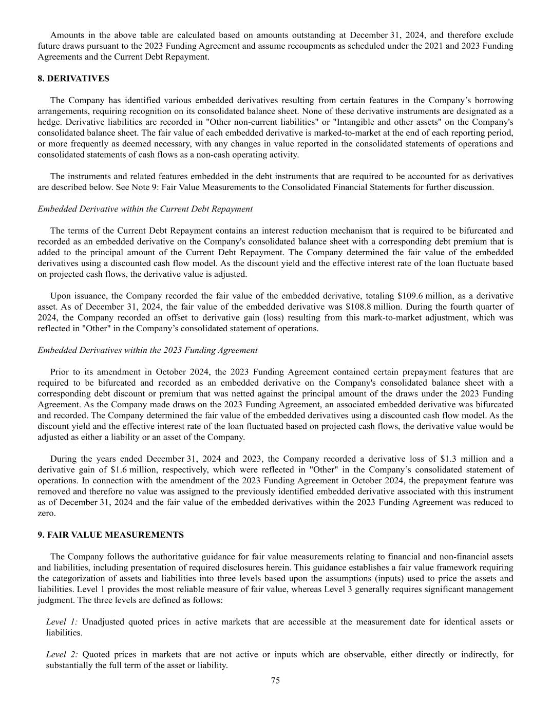 75   Amounts in the above table are calculated based on amounts outstanding at December 31, 2024, and therefore exclude  future draws pursuant to the 2023 Funding Agreement and assume recoupments as scheduled under the 2021 and 2023 Funding  Agreements and the Current Debt Repayment.    8. DERIVATIVES      The Company has identified various embedded derivatives resulting from certain features in the Company’s borrowing  arrangements, requiring recognition on its consolidated balance sheet. None of these derivative instruments are designated as a  hedge. Derivative liabilities are recorded in "Other non-current liabilities" or "Intangible and other assets" on the Company's  consolidated balance sheet. The fair value of each embedded derivative is marked-to-market at the end of each reporting period,  or more frequently as deemed necessary, with any changes in value reported in the consolidated statements of operations and  consolidated statements of cash flows as a non-cash operating activity.     The instruments and related features embedded in the debt instruments that are required to be accounted for as derivatives  are described below. See Note 9: Fair Value Measurements to the Consolidated Financial Statements for further discussion.     Embedded Derivative within the Current Debt Repayment     The terms of the Current Debt Repayment contains an interest reduction mechanism that is required to be bifurcated and  recorded as an embedded derivative on the Company's consolidated balance sheet with a corresponding debt premium that is  added to the principal amount of the Current Debt Repayment. The Company determined the fair value of the embedded  derivatives using a discounted cash flow model. As the discount yield and the effective interest rate of the loan fluctuate based  on projected cash flows, the derivative value is adjusted.    Upon issuance, the Company recorded the fair value of the embedded derivative, totaling $109.6 million, as a derivative  asset. As of December 31, 2024, the fair value of the embedded derivative was $108.8 million. During the fourth quarter of  2024, the Company recorded an offset to derivative gain (loss) resulting from this mark-to-market adjustment, which was  reflected in "Other" in the Company’s consolidated statement of operations.    Embedded Derivatives within the 2023 Funding Agreement    Prior to its amendment in October 2024, the 2023 Funding Agreement contained certain prepayment features that are  required to be bifurcated and recorded as an embedded derivative on the Company's consolidated balance sheet with a  corresponding debt discount or premium that was netted against the principal amount of the draws under the 2023 Funding  Agreement. As the Company made draws on the 2023 Funding Agreement, an associated embedded derivative was bifurcated  and recorded. The Company determined the fair value of the embedded derivatives using a discounted cash flow model. As the  discount yield and the effective interest rate of the loan fluctuated based on projected cash flows, the derivative value would be  adjusted as either a liability or an asset of the Company.     During the years ended December 31, 2024 and 2023, the Company recorded a derivative loss of $1.3 million and a  derivative gain of $1.6 million, respectively, which were reflected in "Other" in the Company’s consolidated statement of  operations. In connection with the amendment of the 2023 Funding Agreement in October 2024, the prepayment feature was  removed and therefore no value was assigned to the previously identified embedded derivative associated with this instrument  as of December 31, 2024 and the fair value of the embedded derivatives within the 2023 Funding Agreement was reduced to  zero.    9. FAIR VALUE MEASUREMENTS      The Company follows the authoritative guidance for fair value measurements relating to financial and non-financial assets  and liabilities, including presentation of required disclosures herein. This guidance establishes a fair value framework requiring  the categorization of assets and liabilities into three levels based upon the assumptions (inputs) used to price the assets and  liabilities. Level 1 provides the most reliable measure of fair value, whereas Level 3 generally requires significant management  judgment. The three levels are defined as follows:     Level 1: Unadjusted quoted prices in active markets that are accessible at the measurement date for identical assets or  liabilities.     Level 2: Quoted prices in markets that are not active or inputs which are observable, either directly or indirectly, for  substantially the full term of the asset or liability.