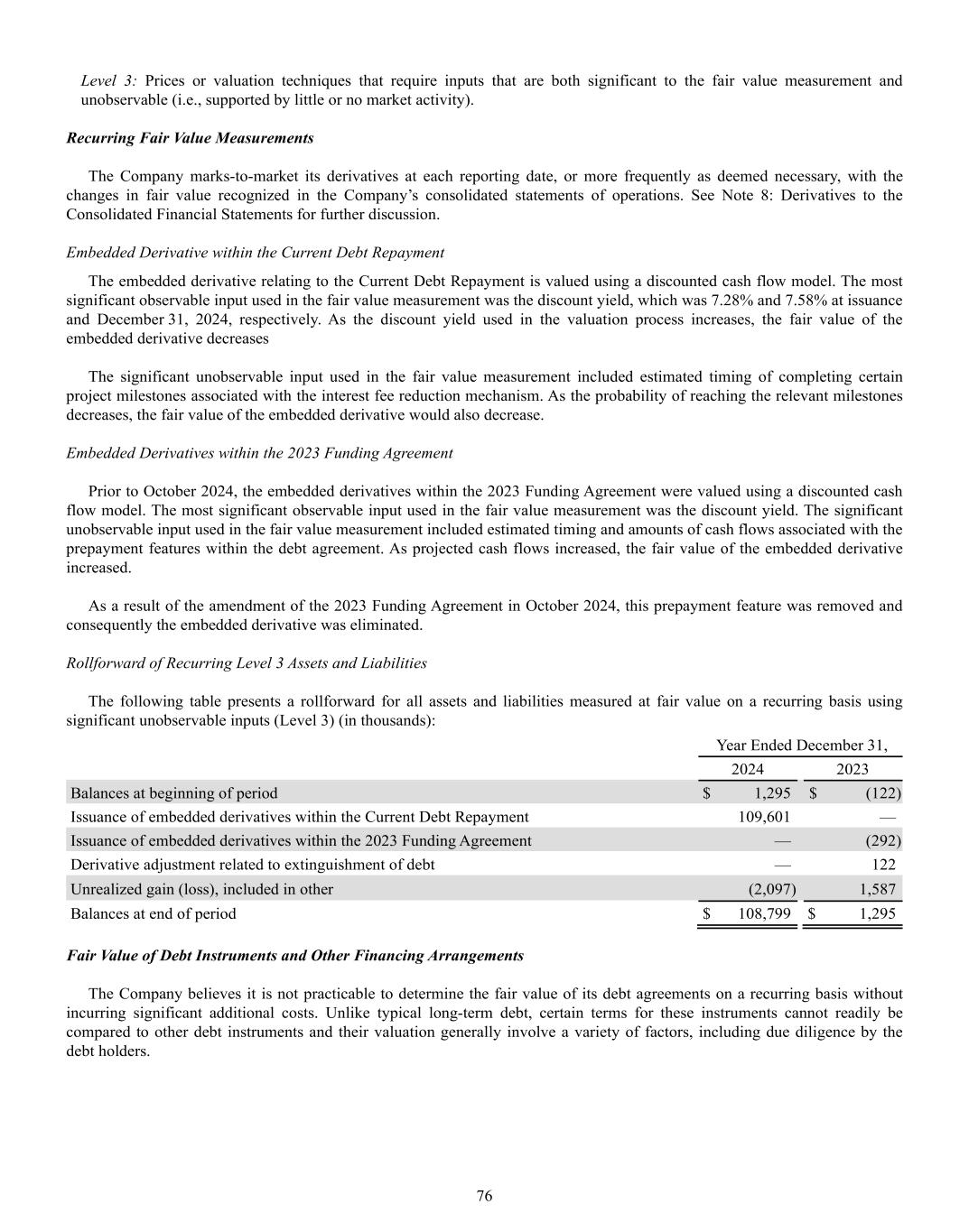 76     Level 3: Prices or valuation techniques that require inputs that are both significant to the fair value measurement and  unobservable (i.e., supported by little or no market activity).     Recurring Fair Value Measurements    The Company marks-to-market its derivatives at each reporting date, or more frequently as deemed necessary, with the  changes in fair value recognized in the Company’s consolidated statements of operations. See Note 8: Derivatives to the  Consolidated Financial Statements for further discussion.    Embedded Derivative within the Current Debt Repayment   The embedded derivative relating to the Current Debt Repayment is valued using a discounted cash flow model. The most  significant observable input used in the fair value measurement was the discount yield, which was 7.28% and 7.58% at issuance  and December 31, 2024, respectively. As the discount yield used in the valuation process increases, the fair value of the  embedded derivative decreases     The significant unobservable input used in the fair value measurement included estimated timing of completing certain  project milestones associated with the interest fee reduction mechanism. As the probability of reaching the relevant milestones  decreases, the fair value of the embedded derivative would also decrease.     Embedded Derivatives within the 2023 Funding Agreement    Prior to October 2024, the embedded derivatives within the 2023 Funding Agreement were valued using a discounted cash  flow model. The most significant observable input used in the fair value measurement was the discount yield. The significant  unobservable input used in the fair value measurement included estimated timing and amounts of cash flows associated with the  prepayment features within the debt agreement. As projected cash flows increased, the fair value of the embedded derivative  increased.    As a result of the amendment of the 2023 Funding Agreement in October 2024, this prepayment feature was removed and  consequently the embedded derivative was eliminated.    Rollforward of Recurring Level 3 Assets and Liabilities     The following table presents a rollforward for all assets and liabilities measured at fair value on a recurring basis using  significant unobservable inputs (Level 3) (in thousands):   Year Ended December 31,   2024  2023  Balances at beginning of period $ 1,295  $ (122)  Issuance of embedded derivatives within the Current Debt Repayment  109,601    —   Issuance of embedded derivatives within the 2023 Funding Agreement  —   (292)  Derivative adjustment related to extinguishment of debt  —   122   Unrealized gain (loss), included in other  (2,097)   1,587   Balances at end of period $ 108,799  $ 1,295     Fair Value of Debt Instruments and Other Financing Arrangements    The Company believes it is not practicable to determine the fair value of its debt agreements on a recurring basis without  incurring significant additional costs. Unlike typical long-term debt, certain terms for these instruments cannot readily be  compared to other debt instruments and their valuation generally involve a variety of factors, including due diligence by the  debt holders.