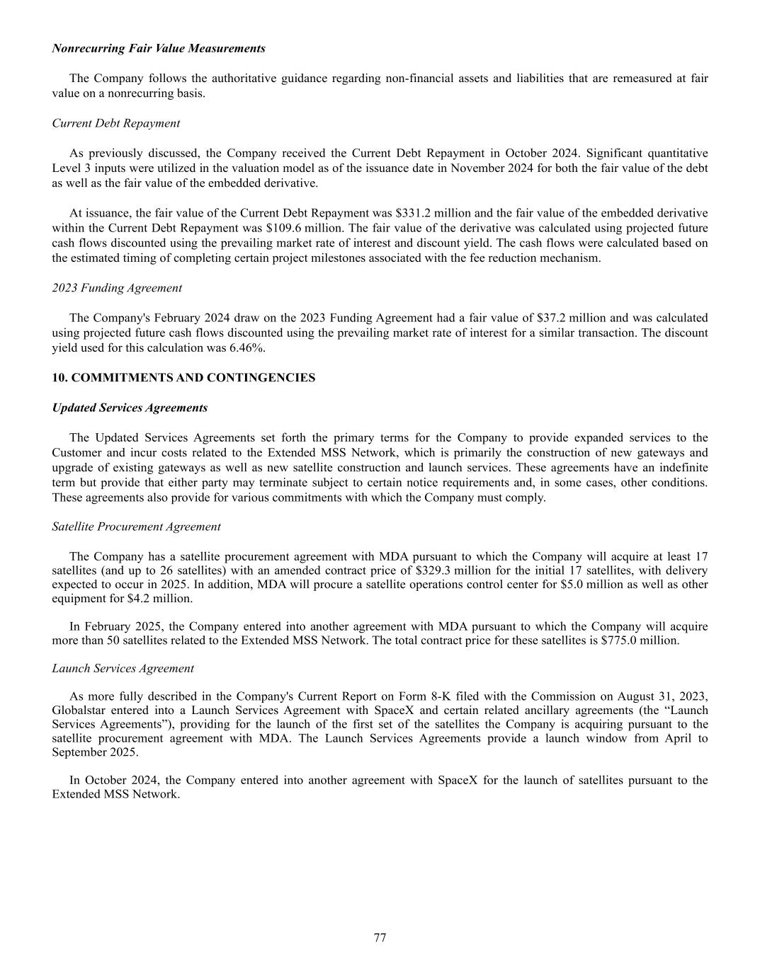 77   Nonrecurring Fair Value Measurements    The Company follows the authoritative guidance regarding non-financial assets and liabilities that are remeasured at fair  value on a nonrecurring basis.    Current Debt Repayment    As previously discussed, the Company received the Current Debt Repayment in October 2024. Significant quantitative  Level 3 inputs were utilized in the valuation model as of the issuance date in November 2024 for both the fair value of the debt  as well as the fair value of the embedded derivative.     At issuance, the fair value of the Current Debt Repayment was $331.2 million and the fair value of the embedded derivative  within the Current Debt Repayment was $109.6 million. The fair value of the derivative was calculated using projected future  cash flows discounted using the prevailing market rate of interest and discount yield. The cash flows were calculated based on  the estimated timing of completing certain project milestones associated with the fee reduction mechanism.     2023 Funding Agreement    The Company's February 2024 draw on the 2023 Funding Agreement had a fair value of $37.2 million and was calculated  using projected future cash flows discounted using the prevailing market rate of interest for a similar transaction. The discount  yield used for this calculation was 6.46%.     10. COMMITMENTS AND CONTINGENCIES     Updated Services Agreements    The Updated Services Agreements set forth the primary terms for the Company to provide expanded services to the  Customer and incur costs related to the Extended MSS Network, which is primarily the construction of new gateways and  upgrade of existing gateways as well as new satellite construction and launch services. These agreements have an indefinite  term but provide that either party may terminate subject to certain notice requirements and, in some cases, other conditions.  These agreements also provide for various commitments with which the Company must comply.     Satellite Procurement Agreement     The Company has a satellite procurement agreement with MDA pursuant to which the Company will acquire at least 17  satellites (and up to 26 satellites) with an amended contract price of $329.3 million for the initial 17 satellites, with delivery  expected to occur in 2025. In addition, MDA will procure a satellite operations control center for $5.0 million as well as other  equipment for $4.2 million.     In February 2025, the Company entered into another agreement with MDA pursuant to which the Company will acquire  more than 50 satellites related to the Extended MSS Network. The total contract price for these satellites is $775.0 million.     Launch Services Agreement    As more fully described in the Company's Current Report on Form 8-K filed with the Commission on August 31, 2023,  Globalstar entered into a Launch Services Agreement with SpaceX and certain related ancillary agreements (the “Launch  Services Agreements”), providing for the launch of the first set of the satellites the Company is acquiring pursuant to the  satellite procurement agreement with MDA. The Launch Services Agreements provide a launch window from April to  September 2025.    In October 2024, the Company entered into another agreement with SpaceX for the launch of satellites pursuant to the  Extended MSS Network.