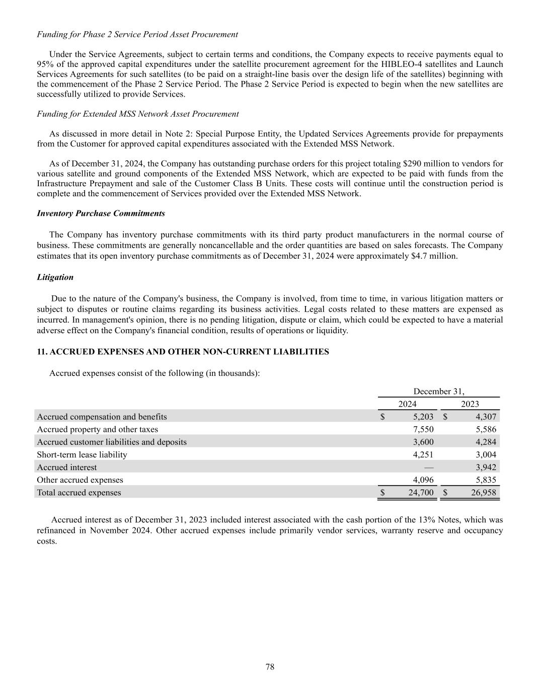 78   Funding for Phase 2 Service Period Asset Procurement     Under the Service Agreements, subject to certain terms and conditions, the Company expects to receive payments equal to  95% of the approved capital expenditures under the satellite procurement agreement for the HIBLEO-4 satellites and Launch  Services Agreements for such satellites (to be paid on a straight-line basis over the design life of the satellites) beginning with  the commencement of the Phase 2 Service Period. The Phase 2 Service Period is expected to begin when the new satellites are  successfully utilized to provide Services.     Funding for Extended MSS Network Asset Procurement    As discussed in more detail in Note 2: Special Purpose Entity, the Updated Services Agreements provide for prepayments  from the Customer for approved capital expenditures associated with the Extended MSS Network.     As of December 31, 2024, the Company has outstanding purchase orders for this project totaling $290 million to vendors for  various satellite and ground components of the Extended MSS Network, which are expected to be paid with funds from the  Infrastructure Prepayment and sale of the Customer Class B Units. These costs will continue until the construction period is  complete and the commencement of Services provided over the Extended MSS Network.    Inventory Purchase Commitments    The Company has inventory purchase commitments with its third party product manufacturers in the normal course of  business. These commitments are generally noncancellable and the order quantities are based on sales forecasts. The Company  estimates that its open inventory purchase commitments as of December 31, 2024 were approximately $4.7 million.     Litigation    Due to the nature of the Company's business, the Company is involved, from time to time, in various litigation matters or  subject to disputes or routine claims regarding its business activities. Legal costs related to these matters are expensed as  incurred. In management's opinion, there is no pending litigation, dispute or claim, which could be expected to have a material  adverse effect on the Company's financial condition, results of operations or liquidity.      11. ACCRUED EXPENSES AND OTHER NON-CURRENT LIABILITIES      Accrued expenses consist of the following (in thousands):    December 31,    2024  2023  Accrued compensation and benefits $ 5,203  $ 4,307   Accrued property and other taxes  7,550   5,586   Accrued customer liabilities and deposits  3,600   4,284   Short-term lease liability  4,251   3,004   Accrued interest  —   3,942   Other accrued expenses  4,096   5,835   Total accrued expenses $ 24,700  $ 26,958     Accrued interest as of December 31, 2023 included interest associated with the cash portion of the 13% Notes, which was  refinanced in November 2024. Other accrued expenses include primarily vendor services, warranty reserve and occupancy  costs.