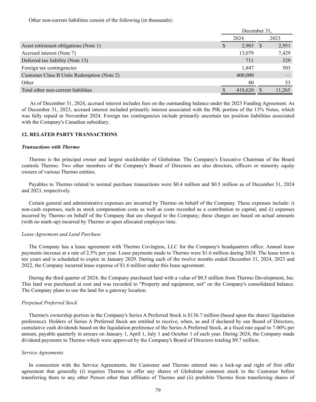79  Other non-current liabilities consist of the following (in thousands):      December 31,    2024  2023  Asset retirement obligations (Note 1) $ 2,903  $ 2,951   Accrued interest (Note 7)  13,079   7,429   Deferred tax liability (Note 13)  711   329   Foreign tax contingencies  1,847   503   Customer Class B Units Redemption (Note 2)  400,000    —   Other  80   53   Total other non-current liabilities $ 418,620  $ 11,265     As of December 31, 2024, accrued interest includes fees on the outstanding balance under the 2023 Funding Agreement. As  of December 31, 2023, accrued interest included primarily interest associated with the PIK portion of the 13% Notes, which  was fully repaid in November 2024. Foreign tax contingencies include primarily uncertain tax position liabilities associated  with the Company's Canadian subsidiary.    12. RELATED PARTY TRANSACTIONS    Transactions with Thermo     Thermo is the principal owner and largest stockholder of Globalstar. The Company's Executive Chairman of the Board  controls Thermo. Two other members of the Company's Board of Directors are also directors, officers or minority equity  owners of various Thermo entities.    Payables to Thermo related to normal purchase transactions were $0.4 million and $0.5 million as of December 31, 2024  and 2023, respectively.      Certain general and administrative expenses are incurred by Thermo on behalf of the Company. These expenses include: i)  non-cash expenses, such as stock compensation costs as well as costs recorded as a contribution to capital, and ii) expenses  incurred by Thermo on behalf of the Company that are charged to the Company; these charges are based on actual amounts  (with no mark-up) incurred by Thermo or upon allocated employee time.    Lease Agreement and Land Purchase    The Company has a lease agreement with Thermo Covington, LLC for the Company's headquarters office. Annual lease  payments increase at a rate of 2.5% per year. Lease payments made to Thermo were $1.6 million during 2024. The lease term is  ten years and is scheduled to expire in January 2029. During each of the twelve months ended December 31, 2024, 2023 and  2022, the Company incurred lease expense of $1.6 million under this lease agreement.    During the third quarter of 2024, the Company purchased land with a value of $0.5 million from Thermo Development, Inc.  This land was purchased at cost and was recorded to "Property and equipment, net" on the Company's consolidated balance.  The Company plans to use the land for a gateway location.    Perpetual Preferred Stock    Thermo's ownership portion in the Company's Series A Preferred Stock is $136.7 million (based upon the shares' liquidation  preference). Holders of Series A Preferred Stock are entitled to receive, when, as and if declared by our Board of Directors,  cumulative cash dividends based on the liquidation preference of the Series A Preferred Stock, at a fixed rate equal to 7.00% per  annum, payable quarterly in arrears on January 1, April 1, July 1 and October 1 of each year. During 2024, the Company made  dividend payments to Thermo which were approved by the Company's Board of Directors totaling $9.7 million.    Service Agreements    In connection with the Service Agreements, the Customer and Thermo entered into a lock-up and right of first offer  agreement that generally (i) requires Thermo to offer any shares of Globalstar common stock to the Customer before  transferring them to any other Person other than affiliates of Thermo and (ii) prohibits Thermo from transferring shares of