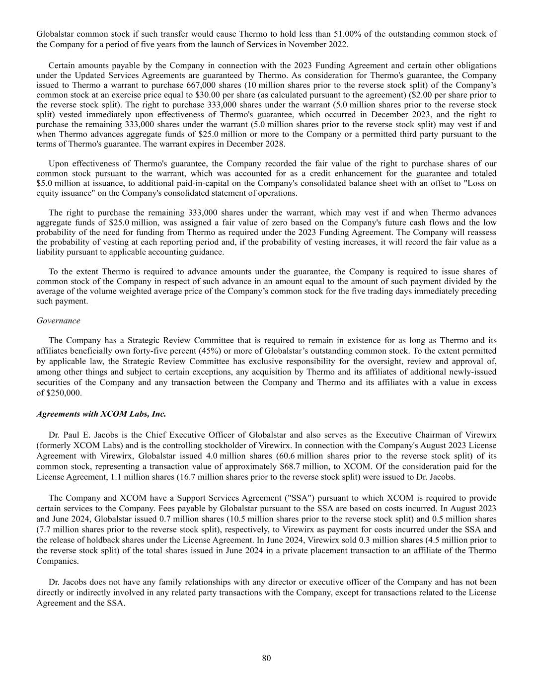 80  Globalstar common stock if such transfer would cause Thermo to hold less than 51.00% of the outstanding common stock of  the Company for a period of five years from the launch of Services in November 2022.     Certain amounts payable by the Company in connection with the 2023 Funding Agreement and certain other obligations  under the Updated Services Agreements are guaranteed by Thermo. As consideration for Thermo's guarantee, the Company  issued to Thermo a warrant to purchase 667,000 shares (10 million shares prior to the reverse stock split) of the Company’s  common stock at an exercise price equal to $30.00 per share (as calculated pursuant to the agreement) ($2.00 per share prior to  the reverse stock split). The right to purchase 333,000 shares under the warrant (5.0 million shares prior to the reverse stock  split) vested immediately upon effectiveness of Thermo's guarantee, which occurred in December 2023, and the right to  purchase the remaining 333,000 shares under the warrant (5.0 million shares prior to the reverse stock split) may vest if and  when Thermo advances aggregate funds of $25.0 million or more to the Company or a permitted third party pursuant to the  terms of Thermo's guarantee. The warrant expires in December 2028.     Upon effectiveness of Thermo's guarantee, the Company recorded the fair value of the right to purchase shares of our  common stock pursuant to the warrant, which was accounted for as a credit enhancement for the guarantee and totaled  $5.0 million at issuance, to additional paid-in-capital on the Company's consolidated balance sheet with an offset to "Loss on  equity issuance" on the Company's consolidated statement of operations.     The right to purchase the remaining 333,000 shares under the warrant, which may vest if and when Thermo advances  aggregate funds of $25.0 million, was assigned a fair value of zero based on the Company's future cash flows and the low  probability of the need for funding from Thermo as required under the 2023 Funding Agreement. The Company will reassess  the probability of vesting at each reporting period and, if the probability of vesting increases, it will record the fair value as a  liability pursuant to applicable accounting guidance.     To the extent Thermo is required to advance amounts under the guarantee, the Company is required to issue shares of  common stock of the Company in respect of such advance in an amount equal to the amount of such payment divided by the  average of the volume weighted average price of the Company’s common stock for the five trading days immediately preceding  such payment.     Governance    The Company has a Strategic Review Committee that is required to remain in existence for as long as Thermo and its  affiliates beneficially own forty-five percent (45%) or more of Globalstar’s outstanding common stock. To the extent permitted  by applicable law, the Strategic Review Committee has exclusive responsibility for the oversight, review and approval of,  among other things and subject to certain exceptions, any acquisition by Thermo and its affiliates of additional newly-issued  securities of the Company and any transaction between the Company and Thermo and its affiliates with a value in excess  of $250,000.    Agreements with XCOM Labs, Inc.    Dr. Paul E. Jacobs is the Chief Executive Officer of Globalstar and also serves as the Executive Chairman of Virewirx  (formerly XCOM Labs) and is the controlling stockholder of Virewirx. In connection with the Company's August 2023 License  Agreement with Virewirx, Globalstar issued 4.0 million shares (60.6 million shares prior to the reverse stock split) of its  common stock, representing a transaction value of approximately $68.7 million, to XCOM. Of the consideration paid for the  License Agreement, 1.1 million shares (16.7 million shares prior to the reverse stock split) were issued to Dr. Jacobs.    The Company and XCOM have a Support Services Agreement ("SSA") pursuant to which XCOM is required to provide  certain services to the Company. Fees payable by Globalstar pursuant to the SSA are based on costs incurred. In August 2023  and June 2024, Globalstar issued 0.7 million shares (10.5 million shares prior to the reverse stock split) and 0.5 million shares  (7.7 million shares prior to the reverse stock split), respectively, to Virewirx as payment for costs incurred under the SSA and  the release of holdback shares under the License Agreement. In June 2024, Virewirx sold 0.3 million shares (4.5 million prior to  the reverse stock split) of the total shares issued in June 2024 in a private placement transaction to an affiliate of the Thermo  Companies.    Dr. Jacobs does not have any family relationships with any director or executive officer of the Company and has not been  directly or indirectly involved in any related party transactions with the Company, except for transactions related to the License  Agreement and the SSA.