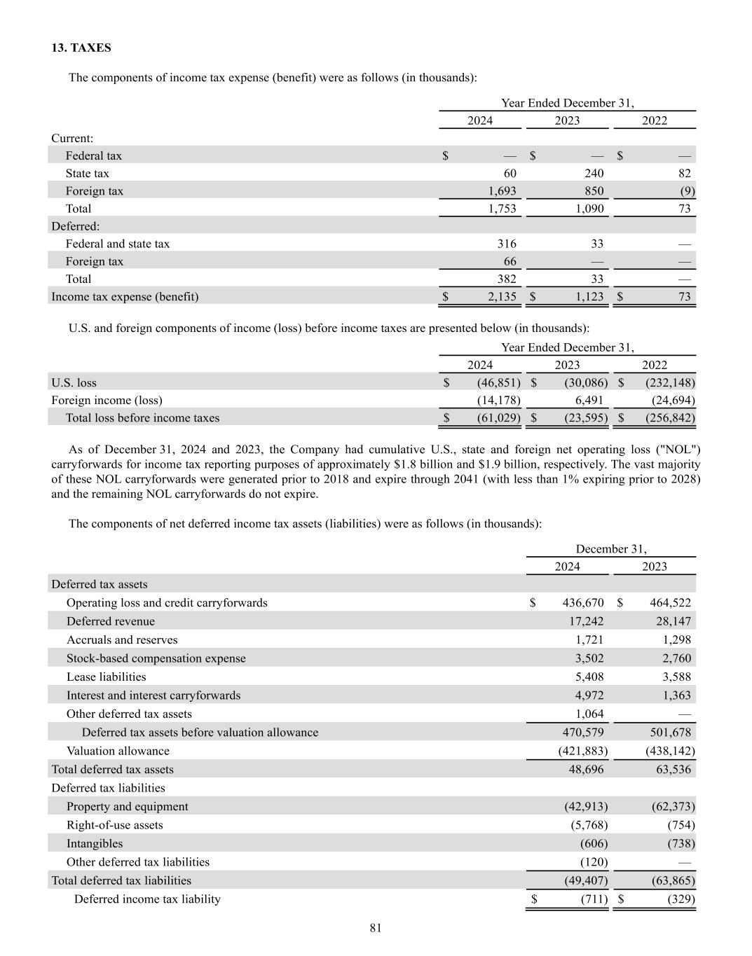 81   13. TAXES     The components of income tax expense (benefit) were as follows (in thousands):      Year Ended December 31,    2024  2023  2022  Current:          Federal tax $ —  $ —  $ —   State tax  60   240   82   Foreign tax  1,693   850   (9)  Total  1,753   1,090   73   Deferred:          Federal and state tax  316   33   —   Foreign tax  66   —   —   Total  382   33   —   Income tax expense (benefit) $ 2,135  $ 1,123  $ 73       U.S. and foreign components of income (loss) before income taxes are presented below (in thousands):    Year Ended December 31,    2024  2023  2022  U.S. loss $ (46,851) $ (30,086) $ (232,148)  Foreign income (loss)  (14,178)  6,491   (24,694)  Total loss before income taxes $ (61,029) $ (23,595) $ (256,842)     As of December 31, 2024 and 2023, the Company had cumulative U.S., state and foreign net operating loss ("NOL")  carryforwards for income tax reporting purposes of approximately $1.8 billion and $1.9 billion, respectively. The vast majority  of these NOL carryforwards were generated prior to 2018 and expire through 2041 (with less than 1% expiring prior to 2028)  and the remaining NOL carryforwards do not expire.     The components of net deferred income tax assets (liabilities) were as follows (in thousands):      December 31,    2024  2023  Deferred tax assets     Operating loss and credit carryforwards $ 436,670  $ 464,522   Deferred revenue  17,242   28,147   Accruals and reserves  1,721    1,298   Stock-based compensation expense  3,502    2,760   Lease liabilities  5,408    3,588   Interest and interest carryforwards  4,972   1,363   Other deferred tax assets  1,064    —   Deferred tax assets before valuation allowance  470,579   501,678   Valuation allowance  (421,883)  (438,142)  Total deferred tax assets  48,696   63,536   Deferred tax liabilities     Property and equipment  (42,913)  (62,373)  Right-of-use assets  (5,768)   (754)  Intangibles  (606)   (738)  Other deferred tax liabilities  (120)   —   Total deferred tax liabilities  (49,407)  (63,865)  Deferred income tax liability $ (711) $ (329)