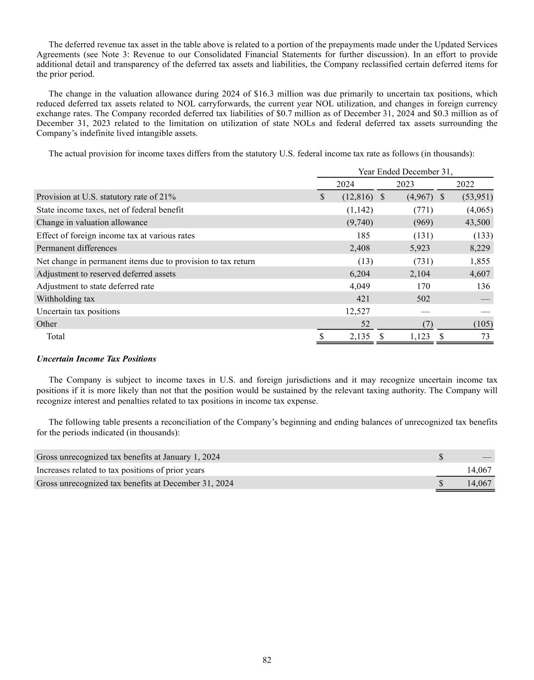 82      The deferred revenue tax asset in the table above is related to a portion of the prepayments made under the Updated Services  Agreements (see Note 3: Revenue to our Consolidated Financial Statements for further discussion). In an effort to provide  additional detail and transparency of the deferred tax assets and liabilities, the Company reclassified certain deferred items for  the prior period.     The change in the valuation allowance during 2024 of $16.3 million was due primarily to uncertain tax positions, which  reduced deferred tax assets related to NOL carryforwards, the current year NOL utilization, and changes in foreign currency  exchange rates. The Company recorded deferred tax liabilities of $0.7 million as of December 31, 2024 and $0.3 million as of  December 31, 2023 related to the limitation on utilization of state NOLs and federal deferred tax assets surrounding the  Company’s indefinite lived intangible assets.      The actual provision for income taxes differs from the statutory U.S. federal income tax rate as follows (in thousands):       Year Ended December 31,    2024  2023  2022  Provision at U.S. statutory rate of 21% $ (12,816) $ (4,967) $ (53,951)  State income taxes, net of federal benefit  (1,142)  (771)  (4,065)  Change in valuation allowance  (9,740)  (969)  43,500   Effect of foreign income tax at various rates  185   (131)  (133)  Permanent differences  2,408   5,923   8,229   Net change in permanent items due to provision to tax return  (13)  (731)  1,855   Adjustment to reserved deferred assets  6,204   2,104   4,607   Adjustment to state deferred rate  4,049   170   136   Withholding tax  421   502   —   Uncertain tax positions  12,527    —    —   Other  52   (7)  (105)  Total $ 2,135  $ 1,123  $ 73      Uncertain Income Tax Positions    The Company is subject to income taxes in U.S. and foreign jurisdictions and it may recognize uncertain income tax  positions if it is more likely than not that the position would be sustained by the relevant taxing authority. The Company will  recognize interest and penalties related to tax positions in income tax expense.     The following table presents a reconciliation of the Company’s beginning and ending balances of unrecognized tax benefits  for the periods indicated (in thousands):    Gross unrecognized tax benefits at January 1, 2024 $ —   Increases related to tax positions of prior years  14,067   Gross unrecognized tax benefits at December 31, 2024 $ 14,067