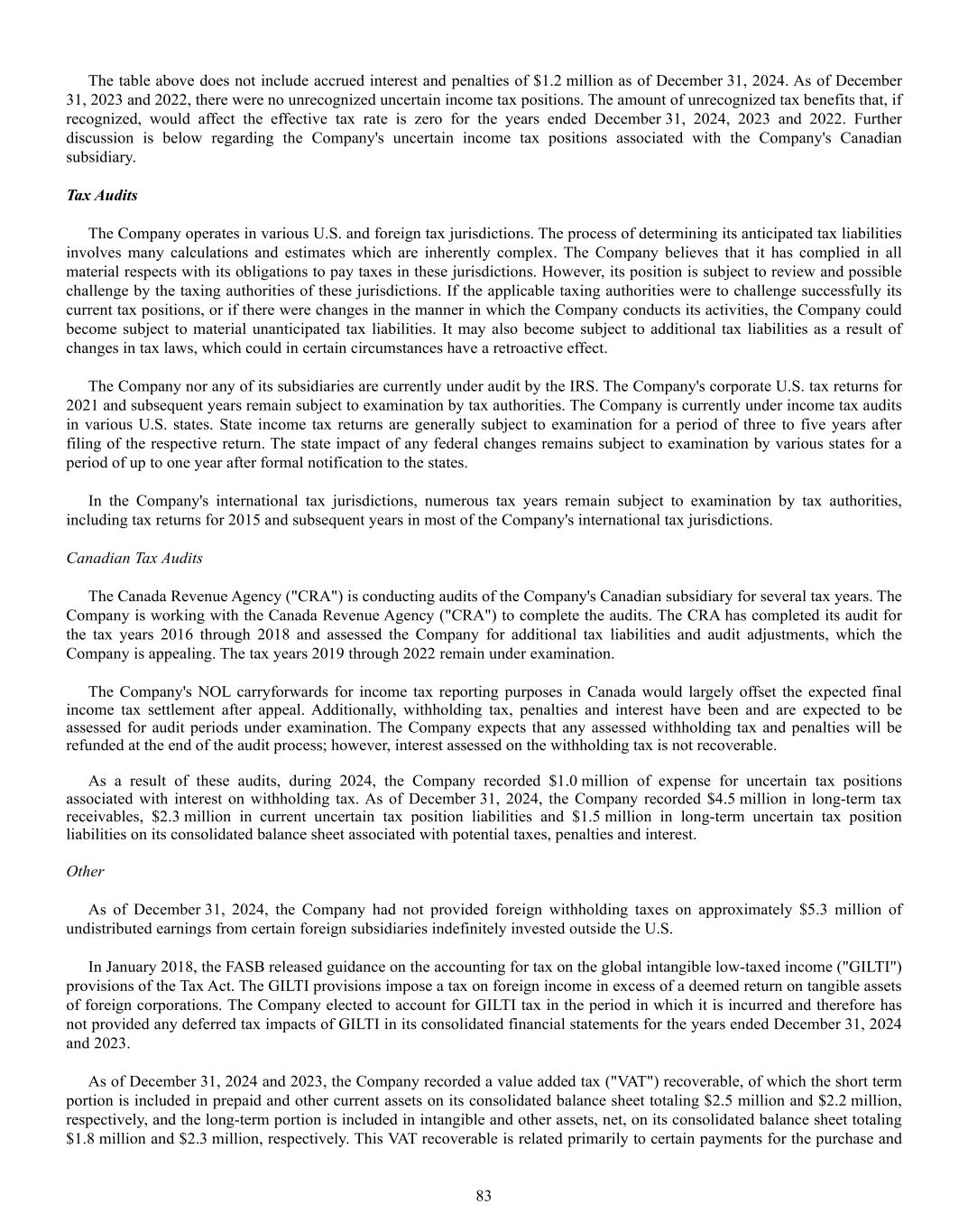 83     The table above does not include accrued interest and penalties of $1.2 million as of December 31, 2024. As of December  31, 2023 and 2022, there were no unrecognized uncertain income tax positions. The amount of unrecognized tax benefits that, if  recognized, would affect the effective tax rate is zero for the years ended December 31, 2024, 2023 and 2022. Further  discussion is below regarding the Company's uncertain income tax positions associated with the Company's Canadian  subsidiary.    Tax Audits     The Company operates in various U.S. and foreign tax jurisdictions. The process of determining its anticipated tax liabilities  involves many calculations and estimates which are inherently complex. The Company believes that it has complied in all  material respects with its obligations to pay taxes in these jurisdictions. However, its position is subject to review and possible  challenge by the taxing authorities of these jurisdictions. If the applicable taxing authorities were to challenge successfully its  current tax positions, or if there were changes in the manner in which the Company conducts its activities, the Company could  become subject to material unanticipated tax liabilities. It may also become subject to additional tax liabilities as a result of  changes in tax laws, which could in certain circumstances have a retroactive effect.    The Company nor any of its subsidiaries are currently under audit by the IRS. The Company's corporate U.S. tax returns for  2021 and subsequent years remain subject to examination by tax authorities. The Company is currently under income tax audits  in various U.S. states. State income tax returns are generally subject to examination for a period of three to five years after  filing of the respective return. The state impact of any federal changes remains subject to examination by various states for a  period of up to one year after formal notification to the states.      In the Company's international tax jurisdictions, numerous tax years remain subject to examination by tax authorities,  including tax returns for 2015 and subsequent years in most of the Company's international tax jurisdictions.    Canadian Tax Audits     The Canada Revenue Agency ("CRA") is conducting audits of the Company's Canadian subsidiary for several tax years. The  Company is working with the Canada Revenue Agency ("CRA") to complete the audits. The CRA has completed its audit for  the tax years 2016 through 2018 and assessed the Company for additional tax liabilities and audit adjustments, which the  Company is appealing. The tax years 2019 through 2022 remain under examination.    The Company's NOL carryforwards for income tax reporting purposes in Canada would largely offset the expected final  income tax settlement after appeal. Additionally, withholding tax, penalties and interest have been and are expected to be  assessed for audit periods under examination. The Company expects that any assessed withholding tax and penalties will be  refunded at the end of the audit process; however, interest assessed on the withholding tax is not recoverable.     As a result of these audits, during 2024, the Company recorded $1.0 million of expense for uncertain tax positions  associated with interest on withholding tax. As of December 31, 2024, the Company recorded $4.5 million in long-term tax  receivables, $2.3 million in current uncertain tax position liabilities and $1.5 million in long-term uncertain tax position  liabilities on its consolidated balance sheet associated with potential taxes, penalties and interest.     Other     As of December 31, 2024, the Company had not provided foreign withholding taxes on approximately $5.3 million of  undistributed earnings from certain foreign subsidiaries indefinitely invested outside the U.S.    In January 2018, the FASB released guidance on the accounting for tax on the global intangible low-taxed income ("GILTI")  provisions of the Tax Act. The GILTI provisions impose a tax on foreign income in excess of a deemed return on tangible assets  of foreign corporations. The Company elected to account for GILTI tax in the period in which it is incurred and therefore has  not provided any deferred tax impacts of GILTI in its consolidated financial statements for the years ended December 31, 2024  and 2023.    As of December 31, 2024 and 2023, the Company recorded a value added tax ("VAT") recoverable, of which the short term  portion is included in prepaid and other current assets on its consolidated balance sheet totaling $2.5 million and $2.2 million,  respectively, and the long-term portion is included in intangible and other assets, net, on its consolidated balance sheet totaling  $1.8 million and $2.3 million, respectively. This VAT recoverable is related primarily to certain payments for the purchase and