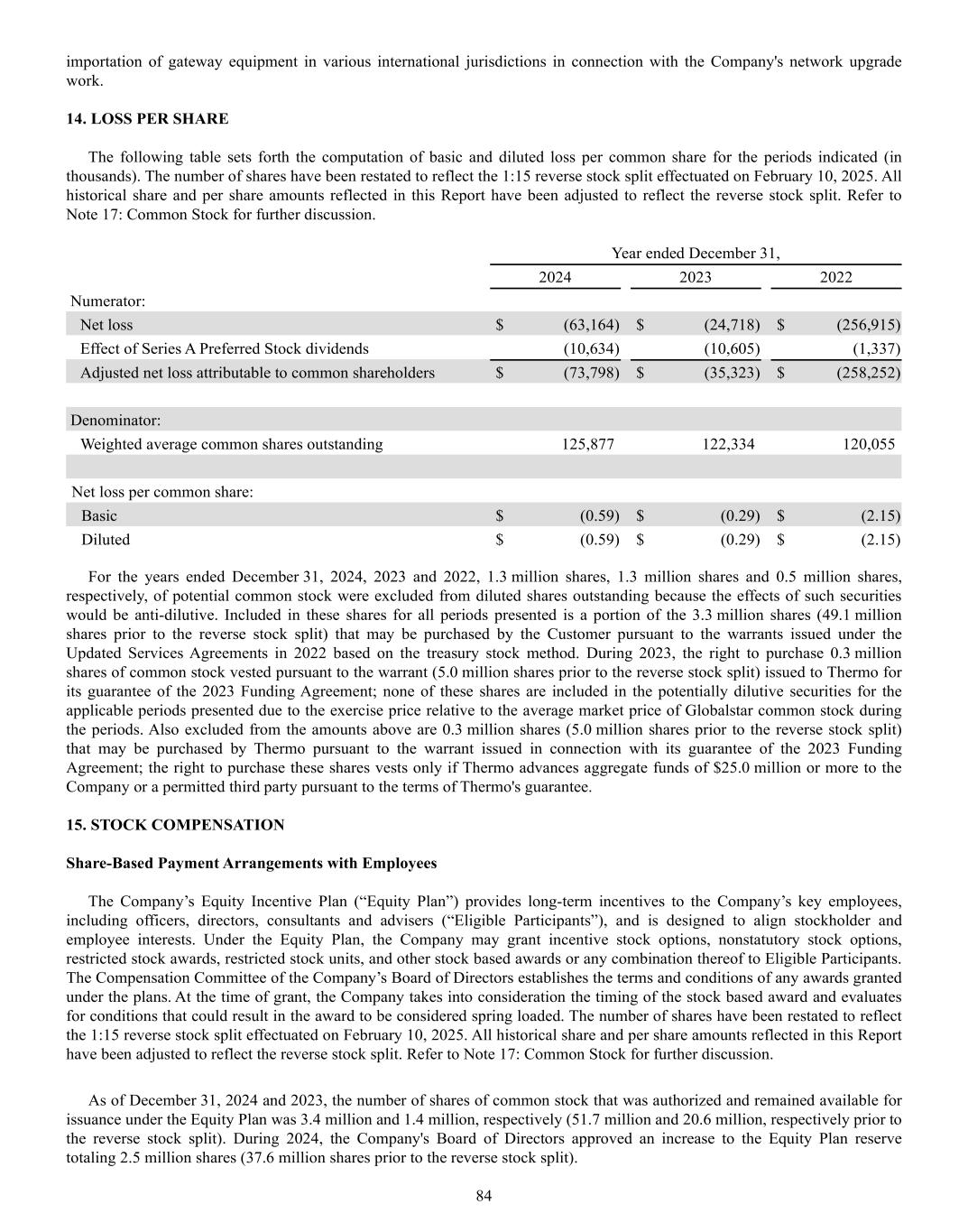 84   importation of gateway equipment in various international jurisdictions in connection with the Company's network upgrade  work.    14. LOSS PER SHARE     The following table sets forth the computation of basic and diluted loss per common share for the periods indicated (in  thousands). The number of shares have been restated to reflect the 1:15 reverse stock split effectuated on February 10, 2025. All  historical share and per share amounts reflected in this Report have been adjusted to reflect the reverse stock split. Refer to  Note 17: Common Stock for further discussion.   Year ended December 31,   2024  2023  2022  Numerator:       Net loss $ (63,164) $ (24,718) $ (256,915)  Effect of Series A Preferred Stock dividends  (10,634)  (10,605)  (1,337)  Adjusted net loss attributable to common shareholders $ (73,798) $ (35,323) $ (258,252)         Denominator:       Weighted average common shares outstanding  125,877   122,334   120,055          Net loss per common share:       Basic $ (0.59) $ (0.29) $ (2.15)  Diluted $ (0.59) $ (0.29) $ (2.15)    For the years ended December 31, 2024, 2023 and 2022, 1.3 million shares, 1.3 million shares and 0.5 million shares,  respectively, of potential common stock were excluded from diluted shares outstanding because the effects of such securities  would be anti-dilutive. Included in these shares for all periods presented is a portion of the 3.3 million shares (49.1 million  shares prior to the reverse stock split) that may be purchased by the Customer pursuant to the warrants issued under the  Updated Services Agreements in 2022 based on the treasury stock method. During 2023, the right to purchase 0.3 million  shares of common stock vested pursuant to the warrant (5.0 million shares prior to the reverse stock split) issued to Thermo for  its guarantee of the 2023 Funding Agreement; none of these shares are included in the potentially dilutive securities for the  applicable periods presented due to the exercise price relative to the average market price of Globalstar common stock during  the periods. Also excluded from the amounts above are 0.3 million shares (5.0 million shares prior to the reverse stock split)  that may be purchased by Thermo pursuant to the warrant issued in connection with its guarantee of the 2023 Funding  Agreement; the right to purchase these shares vests only if Thermo advances aggregate funds of $25.0 million or more to the  Company or a permitted third party pursuant to the terms of Thermo's guarantee.    15. STOCK COMPENSATION    Share-Based Payment Arrangements with Employees     The Company’s Equity Incentive Plan (“Equity Plan”) provides long-term incentives to the Company’s key employees,  including officers, directors, consultants and advisers (“Eligible Participants”), and is designed to align stockholder and  employee interests. Under the Equity Plan, the Company may grant incentive stock options, nonstatutory stock options,  restricted stock awards, restricted stock units, and other stock based awards or any combination thereof to Eligible Participants.  The Compensation Committee of the Company’s Board of Directors establishes the terms and conditions of any awards granted  under the plans. At the time of grant, the Company takes into consideration the timing of the stock based award and evaluates  for conditions that could result in the award to be considered spring loaded. The number of shares have been restated to reflect  the 1:15 reverse stock split effectuated on February 10, 2025. All historical share and per share amounts reflected in this Report  have been adjusted to reflect the reverse stock split. Refer to Note 17: Common Stock for further discussion.    As of December 31, 2024 and 2023, the number of shares of common stock that was authorized and remained available for  issuance under the Equity Plan was 3.4 million and 1.4 million, respectively (51.7 million and 20.6 million, respectively prior to  the reverse stock split). During 2024, the Company's Board of Directors approved an increase to the Equity Plan reserve  totaling 2.5 million shares (37.6 million shares prior to the reverse stock split).