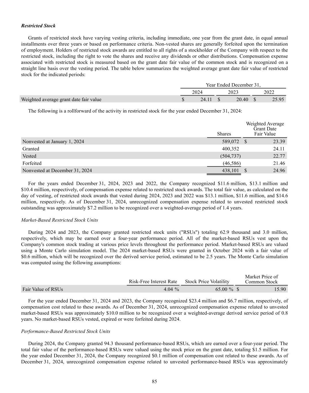 85      Restricted Stock     Grants of restricted stock have varying vesting criteria, including immediate, one year from the grant date, in equal annual  installments over three years or based on performance criteria. Non-vested shares are generally forfeited upon the termination  of employment. Holders of restricted stock awards are entitled to all rights of a stockholder of the Company with respect to the  restricted stock, including the right to vote the shares and receive any dividends or other distributions. Compensation expense  associated with restricted stock is measured based on the grant date fair value of the common stock and is recognized on a  straight line basis over the vesting period. The table below summarizes the weighted average grant date fair value of restricted  stock for the indicated periods:      Year Ended December 31,    2024  2023  2022  Weighted average grant date fair value $ 24.11  $ 20.40  $ 25.95      The following is a rollforward of the activity in restricted stock for the year ended December 31, 2024:       Shares   Weighted Average  Grant Date  Fair Value  Nonvested at January 1, 2024  589,072  $ 23.39   Granted  400,352   24.11   Vested  (504,737)  22.77   Forfeited  (46,586)  21.46   Nonvested at December 31, 2024  438,101  $ 24.96     For the years ended December 31, 2024, 2023 and 2022, the Company recognized $11.6 million, $13.1 million and  $10.4 million, respectively, of compensation expense related to restricted stock awards. The total fair value, as calculated on the  day of vesting, of restricted stock awards that vested during 2024, 2023 and 2022 was $13.1 million, $11.6 million, and $14.6  million, respectively. As of December 31, 2024, unrecognized compensation expense related to unvested restricted stock  outstanding was approximately $7.2 million to be recognized over a weighted-average period of 1.4 years.    Market-Based Restricted Stock Units    During 2024 and 2023, the Company granted restricted stock units ("RSUs") totaling 62.9 thousand and 3.0 million,  respectively, which may be earned over a four-year performance period. All of the market-based RSUs vest upon the  Company's common stock trading at various price levels throughout the performance period. Market-based RSUs are valued  using a Monte Carlo simulation model. The 2024 market-based RSUs were granted in October 2024 with a fair value of  $0.6 million, which will be recognized over the derived service period, estimated to be 2.5 years. The Monte Carlo simulation  was computed using the following assumptions:     Risk-Free Interest Rate  Stock Price Volatility   Market Price of  Common Stock  Fair Value of RSUs 4.04 % 65.00 % $ 15.90     For the year ended December 31, 2024 and 2023, the Company recognized $23.4 million and $6.7 million, respectively, of  compensation cost related to these awards. As of December 31, 2024, unrecognized compensation expense related to unvested  market-based RSUs was approximately $10.0 million to be recognized over a weighted-average derived service period of 0.8  years. No market-based RSUs vested, expired or were forfeited during 2024.    Performance-Based Restricted Stock Units    During 2024, the Company granted 94.3 thousand performance-based RSUs, which are earned over a four-year period. The  total fair value of the performance-based RSUs were valued using the stock price on the grant date, totaling $1.5 million. For  the year ended December 31, 2024, the Company recognized $0.1 million of compensation cost related to these awards. As of  December 31, 2024, unrecognized compensation expense related to unvested performance-based RSUs was approximately