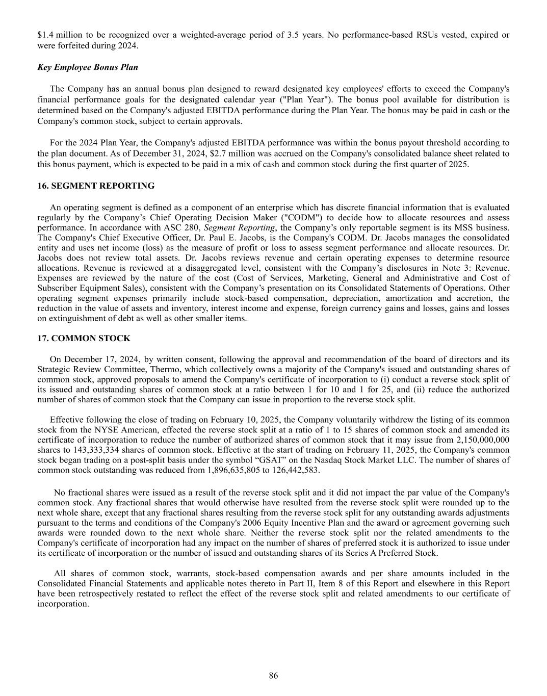 86   $1.4 million to be recognized over a weighted-average period of 3.5 years. No performance-based RSUs vested, expired or  were forfeited during 2024.    Key Employee Bonus Plan    The Company has an annual bonus plan designed to reward designated key employees' efforts to exceed the Company's  financial performance goals for the designated calendar year ("Plan Year"). The bonus pool available for distribution is  determined based on the Company's adjusted EBITDA performance during the Plan Year. The bonus may be paid in cash or the  Company's common stock, subject to certain approvals.     For the 2024 Plan Year, the Company's adjusted EBITDA performance was within the bonus payout threshold according to  the plan document. As of December 31, 2024, $2.7 million was accrued on the Company's consolidated balance sheet related to  this bonus payment, which is expected to be paid in a mix of cash and common stock during the first quarter of 2025.     16. SEGMENT REPORTING    An operating segment is defined as a component of an enterprise which has discrete financial information that is evaluated  regularly by the Company’s Chief Operating Decision Maker ("CODM") to decide how to allocate resources and assess  performance. In accordance with ASC 280, Segment Reporting, the Company’s only reportable segment is its MSS business.  The Company's Chief Executive Officer, Dr. Paul E. Jacobs, is the Company's CODM. Dr. Jacobs manages the consolidated  entity and uses net income (loss) as the measure of profit or loss to assess segment performance and allocate resources. Dr.  Jacobs does not review total assets. Dr. Jacobs reviews revenue and certain operating expenses to determine resource  allocations. Revenue is reviewed at a disaggregated level, consistent with the Company’s disclosures in Note 3: Revenue.  Expenses are reviewed by the nature of the cost (Cost of Services, Marketing, General and Administrative and Cost of  Subscriber Equipment Sales), consistent with the Company’s presentation on its Consolidated Statements of Operations. Other  operating segment expenses primarily include stock-based compensation, depreciation, amortization and accretion, the  reduction in the value of assets and inventory, interest income and expense, foreign currency gains and losses, gains and losses  on extinguishment of debt as well as other smaller items.    17. COMMON STOCK    On December 17, 2024, by written consent, following the approval and recommendation of the board of directors and its  Strategic Review Committee, Thermo, which collectively owns a majority of the Company's issued and outstanding shares of  common stock, approved proposals to amend the Company's certificate of incorporation to (i) conduct a reverse stock split of  its issued and outstanding shares of common stock at a ratio between 1 for 10 and 1 for 25, and (ii) reduce the authorized  number of shares of common stock that the Company can issue in proportion to the reverse stock split.     Effective following the close of trading on February 10, 2025, the Company voluntarily withdrew the listing of its common  stock from the NYSE American, effected the reverse stock split at a ratio of 1 to 15 shares of common stock and amended its  certificate of incorporation to reduce the number of authorized shares of common stock that it may issue from 2,150,000,000  shares to 143,333,334 shares of common stock. Effective at the start of trading on February 11, 2025, the Company's common  stock began trading on a post-split basis under the symbol “GSAT” on the Nasdaq Stock Market LLC. The number of shares of  common stock outstanding was reduced from 1,896,635,805 to 126,442,583.    No fractional shares were issued as a result of the reverse stock split and it did not impact the par value of the Company's  common stock. Any fractional shares that would otherwise have resulted from the reverse stock split were rounded up to the  next whole share, except that any fractional shares resulting from the reverse stock split for any outstanding awards adjustments  pursuant to the terms and conditions of the Company's 2006 Equity Incentive Plan and the award or agreement governing such  awards were rounded down to the next whole share. Neither the reverse stock split nor the related amendments to the  Company's certificate of incorporation had any impact on the number of shares of preferred stock it is authorized to issue under  its certificate of incorporation or the number of issued and outstanding shares of its Series A Preferred Stock.    All shares of common stock, warrants, stock-based compensation awards and per share amounts included in the  Consolidated Financial Statements and applicable notes thereto in Part II, Item 8 of this Report and elsewhere in this Report  have been retrospectively restated to reflect the effect of the reverse stock split and related amendments to our certificate of  incorporation.