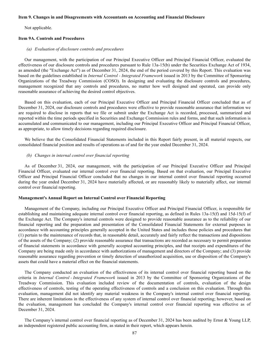 87  Item 9. Changes in and Disagreements with Accountants on Accounting and Financial Disclosure     Not applicable.     Item 9A. Controls and Procedures    (a) Evaluation of disclosure controls and procedures    Our management, with the participation of our Principal Executive Officer and Principal Financial Officer, evaluated the  effectiveness of our disclosure controls and procedures pursuant to Rule 13a-15(b) under the Securities Exchange Act of 1934,  as amended (the "Exchange Act") as of December 31, 2024, the end of the period covered by this Report. This evaluation was  based on the guidelines established in Internal Control - Integrated Framework issued in 2013 by the Committee of Sponsoring  Organizations of the Treadway Commission (COSO). In designing and evaluating the disclosure controls and procedures,  management recognized that any controls and procedures, no matter how well designed and operated, can provide only  reasonable assurance of achieving the desired control objectives.     Based on this evaluation, each of our Principal Executive Officer and Principal Financial Officer concluded that as of  December 31, 2024, our disclosure controls and procedures were effective to provide reasonable assurance that information we  are required to disclose in reports that we file or submit under the Exchange Act is recorded, processed, summarized and  reported within the time periods specified in Securities and Exchange Commission rules and forms, and that such information is  accumulated and communicated to our management, including our Principal Executive Officer and Principal Financial Officer,  as appropriate, to allow timely decisions regarding required disclosure.     We believe that the Consolidated Financial Statements included in this Report fairly present, in all material respects, our  consolidated financial position and results of operations as of and for the year ended December 31, 2024.     (b) Changes in internal control over financial reporting    As of December 31, 2024, our management, with the participation of our Principal Executive Officer and Principal  Financial Officer, evaluated our internal control over financial reporting. Based on that evaluation, our Principal Executive  Officer and Principal Financial Officer concluded that no changes in our internal control over financial reporting occurred  during the year ended December 31, 2024 have materially affected, or are reasonably likely to materially affect, our internal  control over financial reporting.     Management's Annual Report on Internal Control over Financial Reporting      Management of the Company, including our Principal Executive Officer and Principal Financial Officer, is responsible for  establishing and maintaining adequate internal control over financial reporting, as defined in Rules 13a-15(f) and 15d-15(f) of  the Exchange Act. The Company's internal controls were designed to provide reasonable assurance as to the reliability of our  financial reporting and the preparation and presentation of the Consolidated Financial Statements for external purposes in  accordance with accounting principles generally accepted in the United States and includes those policies and procedures that  (1) pertain to the maintenance of records that, in reasonable detail, accurately and fairly reflect the transactions and dispositions  of the assets of the Company; (2) provide reasonable assurance that transactions are recorded as necessary to permit preparation  of financial statements in accordance with generally accepted accounting principles, and that receipts and expenditures of the  Company are being made only in accordance with authorizations of management and directors of the Company; and (3) provide  reasonable assurance regarding prevention or timely detection of unauthorized acquisition, use or disposition of the Company's  assets that could have a material effect on the financial statements.     The Company conducted an evaluation of the effectiveness of its internal control over financial reporting based on the  criteria in Internal Control - Integrated Framework issued in 2013 by the Committee of Sponsoring Organizations of the  Treadway Commission. This evaluation included review of the documentation of controls, evaluation of the design  effectiveness of controls, testing of the operating effectiveness of controls and a conclusion on this evaluation. Through this  evaluation, management did not identify any material weakness in the Company's internal control over financial reporting.  There are inherent limitations in the effectiveness of any system of internal control over financial reporting; however, based on  the evaluation, management has concluded the Company's internal control over financial reporting was effective as of  December 31, 2024.     The Company’s internal control over financial reporting as of December 31, 2024 has been audited by Ernst & Young LLP,  an independent registered public accounting firm, as stated in their report, which appears herein.