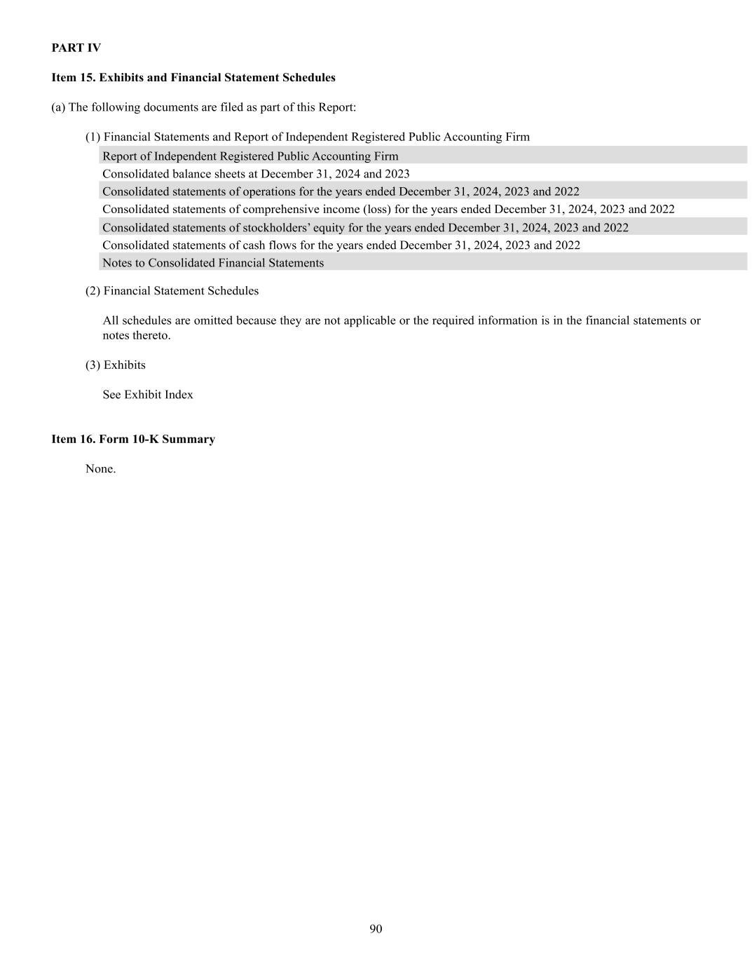 90   PART IV     Item 15. Exhibits and Financial Statement Schedules    (a) The following documents are filed as part of this Report:    (1) Financial Statements and Report of Independent Registered Public Accounting Firm  Report of Independent Registered Public Accounting Firm  Consolidated balance sheets at December 31, 2024 and 2023  Consolidated statements of operations for the years ended December 31, 2024, 2023 and 2022  Consolidated statements of comprehensive income (loss) for the years ended December 31, 2024, 2023 and 2022  Consolidated statements of stockholders’ equity for the years ended December 31, 2024, 2023 and 2022  Consolidated statements of cash flows for the years ended December 31, 2024, 2023 and 2022  Notes to Consolidated Financial Statements     (2) Financial Statement Schedules    All schedules are omitted because they are not applicable or the required information is in the financial statements or  notes thereto.    (3) Exhibits    See Exhibit Index      Item 16. Form 10-K Summary    None.