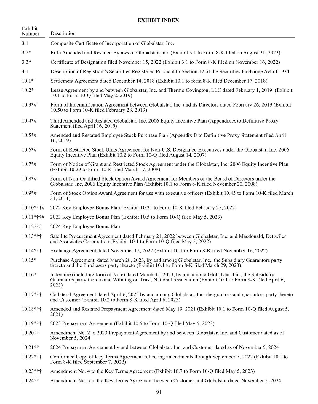91   EXHIBIT INDEX   Exhibit   Number  Description  3.1  Composite Certificate of Incorporation of Globalstar, Inc.  3.2*  Fifth Amended and Restated Bylaws of Globalstar, Inc. (Exhibit 3.1 to Form 8-K filed on August 31, 2023)  3.3*  Certificate of Designation filed November 15, 2022 (Exhibit 3.1 to Form 8-K filed on November 16, 2022)  4.1  Description of Registrant's Securities Registered Pursuant to Section 12 of the Securities Exchange Act of 1934  10.1*  Settlement Agreement dated December 14, 2018 (Exhibit 10.1 to form 8-K filed December 17, 2018)  10.2*    Lease Agreement by and between Globalstar, Inc. and Thermo Covington, LLC dated February 1, 2019  (Exhibit  10.1 to Form 10-Q filed May 2, 2019)  10.3*#    Form of Indemnification Agreement between Globalstar, Inc. and its Directors dated February 26, 2019 (Exhibit  10.50 to Form 10-K filed February 28, 2019)    10.4*#    Third Amended and Restated Globalstar, Inc. 2006 Equity Incentive Plan (Appendix A to Definitive Proxy  Statement filed April 16, 2019)  10.5*#    Amended and Restated Employee Stock Purchase Plan (Appendix B to Definitive Proxy Statement filed April  16, 2019)  10.6*#    Form of Restricted Stock Units Agreement for Non-U.S. Designated Executives under the Globalstar, Inc. 2006  Equity Incentive Plan (Exhibit 10.2 to Form 10-Q filed August 14, 2007)  10.7*#    Form of Notice of Grant and Restricted Stock Agreement under the Globalstar, Inc. 2006 Equity Incentive Plan  (Exhibit 10.29 to Form 10-K filed March 17, 2008)  10.8*#    Form of Non-Qualified Stock Option Award Agreement for Members of the Board of Directors under the  Globalstar, Inc. 2006 Equity Incentive Plan (Exhibit 10.1 to Form 8-K filed November 20, 2008)  10.9*#    Form of Stock Option Award Agreement for use with executive officers (Exhibit 10.45 to Form 10-K filed March  31, 2011)  10.10*††#  2022 Key Employee Bonus Plan (Exhibit 10.21 to Form 10-K filed February 25, 2022)  10.11*††#  2023 Key Employee Bonus Plan (Exhibit 10.5 to Form 10-Q filed May 5, 2023)  10.12††#  2024 Key Employee Bonus Plan  10.13*††    Satellite Procurement Agreement dated February 21, 2022 between Globalstar, Inc. and Macdonald, Dettwiler  and Associates Corporation (Exhibit 10.1 to Form 10-Q filed May 5, 2022)  10.14*††  Exchange Agreement dated November 15, 2022 (Exhibit 10.1 to Form 8-K filed November 16, 2022)  10.15*    Purchase Agreement, dated March 28, 2023, by and among Globalstar, Inc., the Subsidiary Guarantors party  thereto and the Purchasers party thereto (Exhibit 10.1 to Form 8-K filed March 29, 2023)  10.16*    Indenture (including form of Note) dated March 31, 2023, by and among Globalstar, Inc., the Subsidiary  Guarantors party thereto and Wilmington Trust, National Association (Exhibit 10.1 to Form 8-K filed April 6,  2023)  10.17*††    Collateral Agreement dated April 6, 2023 by and among Globalstar, Inc. the grantors and guarantors party thereto  and Customer (Exhibit 10.2 to Form 8-K filed April 6, 2023)  10.18*††    Amended and Restated Prepayment Agreement dated May 19, 2021 (Exhibit 10.1 to Form 10-Q filed August 5,  2021)   10.19*††  2023 Prepayment Agreement (Exhibit 10.6 to Form 10-Q filed May 5, 2023)  10.20††    Amendment No. 2 to 2023 Prepayment Agreement by and between Globalstar, Inc. and Customer dated as of   November 5, 2024  10.21††  2024 Prepayment Agreement by and between Globalstar, Inc. and Customer dated as of November 5, 2024  10.22*††    Conformed Copy of Key Terms Agreement reflecting amendments through September 7, 2022 (Exhibit 10.1 to  Form 8-K filed September 7, 2022)  10.23*††  Amendment No. 4 to the Key Terms Agreement (Exhibit 10.7 to Form 10-Q filed May 5, 2023)  10.24††  Amendment No. 5 to the Key Terms Agreement between Customer and Globalstar dated November 5, 2024