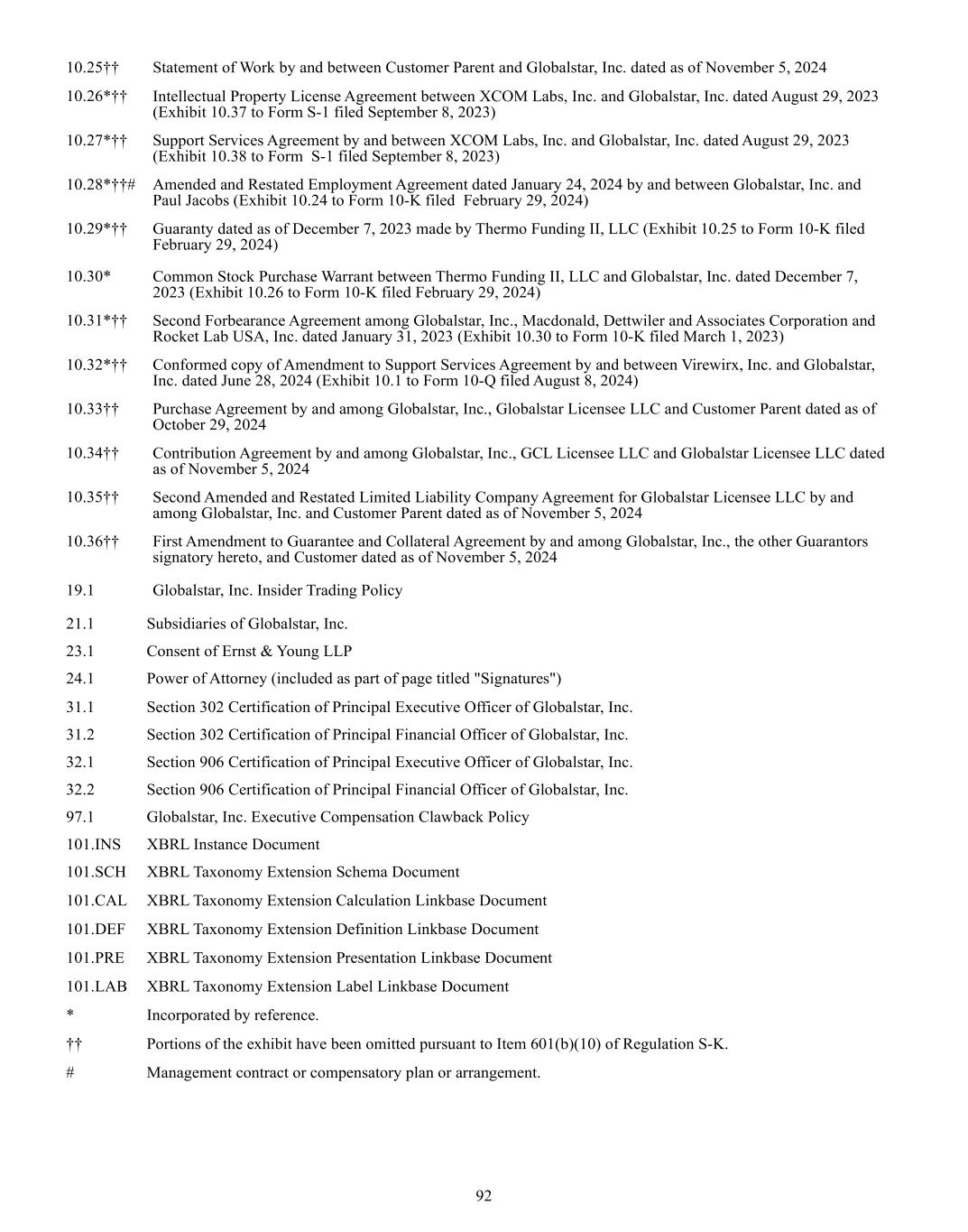 92   10.25††  Statement of Work by and between Customer Parent and Globalstar, Inc. dated as of November 5, 2024  10.26*††    Intellectual Property License Agreement between XCOM Labs, Inc. and Globalstar, Inc. dated August 29, 2023  (Exhibit 10.37 to Form S-1 filed September 8, 2023)  10.27*††    Support Services Agreement by and between XCOM Labs, Inc. and Globalstar, Inc. dated August 29, 2023  (Exhibit 10.38 to Form  S-1 filed September 8, 2023)  10.28*††#    Amended and Restated Employment Agreement dated January 24, 2024 by and between Globalstar, Inc. and  Paul Jacobs (Exhibit 10.24 to Form 10-K filed  February 29, 2024)  10.29*††    Guaranty dated as of December 7, 2023 made by Thermo Funding II, LLC (Exhibit 10.25 to Form 10-K filed  February 29, 2024)  10.30*    Common Stock Purchase Warrant between Thermo Funding II, LLC and Globalstar, Inc. dated December 7,  2023 (Exhibit 10.26 to Form 10-K filed February 29, 2024)  10.31*††    Second Forbearance Agreement among Globalstar, Inc., Macdonald, Dettwiler and Associates Corporation and  Rocket Lab USA, Inc. dated January 31, 2023 (Exhibit 10.30 to Form 10-K filed March 1, 2023)  10.32*††    Conformed copy of Amendment to Support Services Agreement by and between Virewirx, Inc. and Globalstar,  Inc. dated June 28, 2024 (Exhibit 10.1 to Form 10-Q filed August 8, 2024)  10.33††    Purchase Agreement by and among Globalstar, Inc., Globalstar Licensee LLC and Customer Parent dated as of  October 29, 2024  10.34††    Contribution Agreement by and among Globalstar, Inc., GCL Licensee LLC and Globalstar Licensee LLC dated  as of November 5, 2024  10.35††    Second Amended and Restated Limited Liability Company Agreement for Globalstar Licensee LLC by and  among Globalstar, Inc. and Customer Parent dated as of November 5, 2024  10.36††    First Amendment to Guarantee and Collateral Agreement by and among Globalstar, Inc., the other Guarantors  signatory hereto, and Customer dated as of November 5, 2024  19.1  Globalstar, Inc. Insider Trading Policy    21.1  Subsidiaries of Globalstar, Inc.  23.1  Consent of Ernst & Young LLP   24.1  Power of Attorney (included as part of page titled "Signatures")  31.1  Section 302 Certification of Principal Executive Officer of Globalstar, Inc.  31.2  Section 302 Certification of Principal Financial Officer of Globalstar, Inc.  32.1  Section 906 Certification of Principal Executive Officer of Globalstar, Inc.  32.2  Section 906 Certification of Principal Financial Officer of Globalstar, Inc.  97.1  Globalstar, Inc. Executive Compensation Clawback Policy  101.INS  XBRL Instance Document  101.SCH  XBRL Taxonomy Extension Schema Document  101.CAL  XBRL Taxonomy Extension Calculation Linkbase Document  101.DEF  XBRL Taxonomy Extension Definition Linkbase Document  101.PRE  XBRL Taxonomy Extension Presentation Linkbase Document  101.LAB  XBRL Taxonomy Extension Label Linkbase Document  *  Incorporated by reference.  ††  Portions of the exhibit have been omitted pursuant to Item 601(b)(10) of Regulation S-K.  #  Management contract or compensatory plan or arrangement.