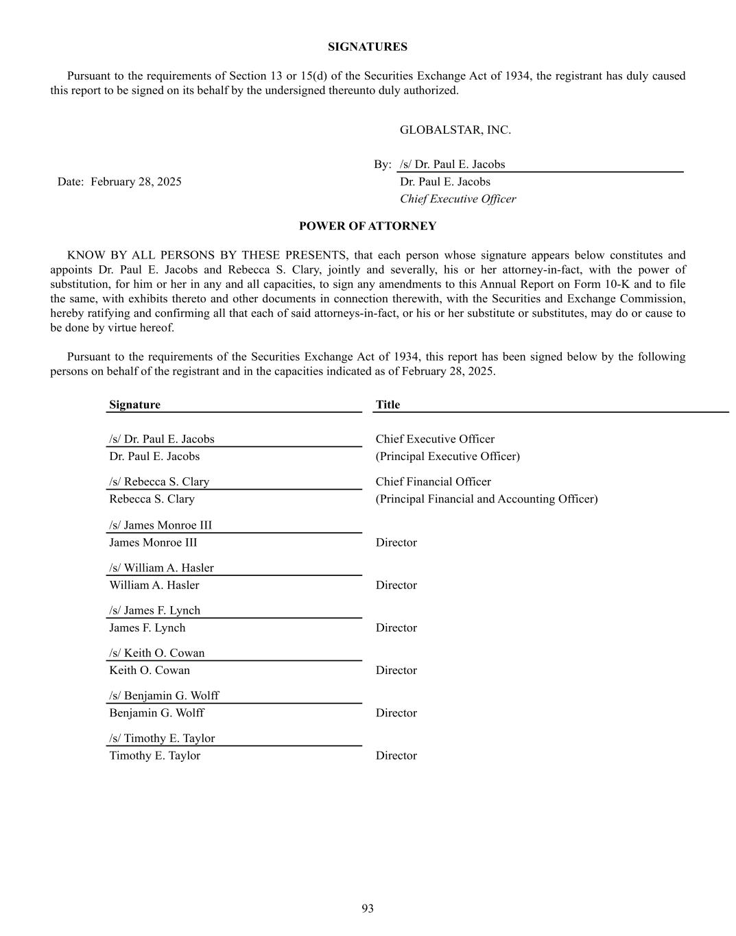 93   SIGNATURES     Pursuant to the requirements of Section 13 or 15(d) of the Securities Exchange Act of 1934, the registrant has duly caused  this report to be signed on its behalf by the undersigned thereunto duly authorized.          GLOBALSTAR, INC.             By: /s/ Dr. Paul E. Jacobs  Date: February 28, 2025   Dr. Paul E. Jacobs       Chief Executive Officer     POWER OF ATTORNEY     KNOW BY ALL PERSONS BY THESE PRESENTS, that each person whose signature appears below constitutes and  appoints Dr. Paul E. Jacobs and Rebecca S. Clary, jointly and severally, his or her attorney-in-fact, with the power of  substitution, for him or her in any and all capacities, to sign any amendments to this Annual Report on Form 10-K and to file  the same, with exhibits thereto and other documents in connection therewith, with the Securities and Exchange Commission,  hereby ratifying and confirming all that each of said attorneys-in-fact, or his or her substitute or substitutes, may do or cause to  be done by virtue hereof.     Pursuant to the requirements of the Securities Exchange Act of 1934, this report has been signed below by the following  persons on behalf of the registrant and in the capacities indicated as of February 28, 2025.      Signature   Title           /s/ Dr. Paul E. Jacobs   Chief Executive Officer   Dr. Paul E. Jacobs   (Principal Executive Officer)   /s/ Rebecca S. Clary   Chief Financial Officer    Rebecca S. Clary   (Principal Financial and Accounting Officer)   /s/ James Monroe III       James Monroe III   Director    /s/ William A. Hasler       William A. Hasler   Director    /s/ James F. Lynch       James F. Lynch   Director    /s/ Keith O. Cowan       Keith O. Cowan   Director    /s/ Benjamin G. Wolff       Benjamin G. Wolff   Director    /s/ Timothy E. Taylor       Timothy E. Taylor   Director
