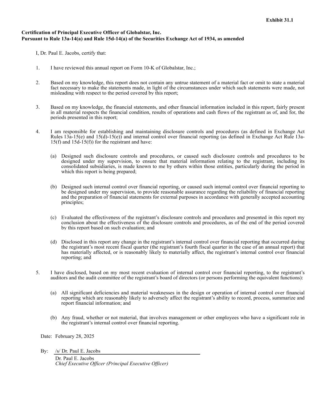 Exhibit 31.1     Certification of Principal Executive Officer of Globalstar, Inc.  Pursuant to Rule 13a-14(a) and Rule 15d-14(a) of the Securities Exchange Act of 1934, as amended     I, Dr. Paul E. Jacobs, certify that:       1. I have reviewed this annual report on Form 10-K of Globalstar, Inc.;       2. Based on my knowledge, this report does not contain any untrue statement of a material fact or omit to state a material  fact necessary to make the statements made, in light of the circumstances under which such statements were made, not  misleading with respect to the period covered by this report;       3. Based on my knowledge, the financial statements, and other financial information included in this report, fairly present  in all material respects the financial condition, results of operations and cash flows of the registrant as of, and for, the  periods presented in this report;       4. I am responsible for establishing and maintaining disclosure controls and procedures (as defined in Exchange Act  Rules 13a-15(e) and 15(d)-15(e)) and internal control over financial reporting (as defined in Exchange Act Rule 13a- 15(f) and 15d-15(f)) for the registrant and have:         (a) Designed such disclosure controls and procedures, or caused such disclosure controls and procedures to be  designed under my supervision, to ensure that material information relating to the registrant, including its  consolidated subsidiaries, is made known to me by others within those entities, particularly during the period in  which this report is being prepared;           (b) Designed such internal control over financial reporting, or caused such internal control over financial reporting to  be designed under my supervision, to provide reasonable assurance regarding the reliability of financial reporting  and the preparation of financial statements for external purposes in accordance with generally accepted accounting  principles;           (c) Evaluated the effectiveness of the registrant’s disclosure controls and procedures and presented in this report my  conclusion about the effectiveness of the disclosure controls and procedures, as of the end of the period covered  by this report based on such evaluation; and           (d) Disclosed in this report any change in the registrant’s internal control over financial reporting that occurred during  the registrant’s most recent fiscal quarter (the registrant’s fourth fiscal quarter in the case of an annual report) that  has materially affected, or is reasonably likely to materially affect, the registrant’s internal control over financial  reporting; and         5. I have disclosed, based on my most recent evaluation of internal control over financial reporting, to the registrant’s  auditors and the audit committee of the registrant’s board of directors (or persons performing the equivalent functions):         (a) All significant deficiencies and material weaknesses in the design or operation of internal control over financial  reporting which are reasonably likely to adversely affect the registrant’s ability to record, process, summarize and  report financial information; and           (b) Any fraud, whether or not material, that involves management or other employees who have a significant role in  the registrant’s internal control over financial reporting.     Date: February 28, 2025           By: /s/ Dr. Paul E. Jacobs       Dr. Paul E. Jacobs  Chief Executive Officer (Principal Executive Officer)