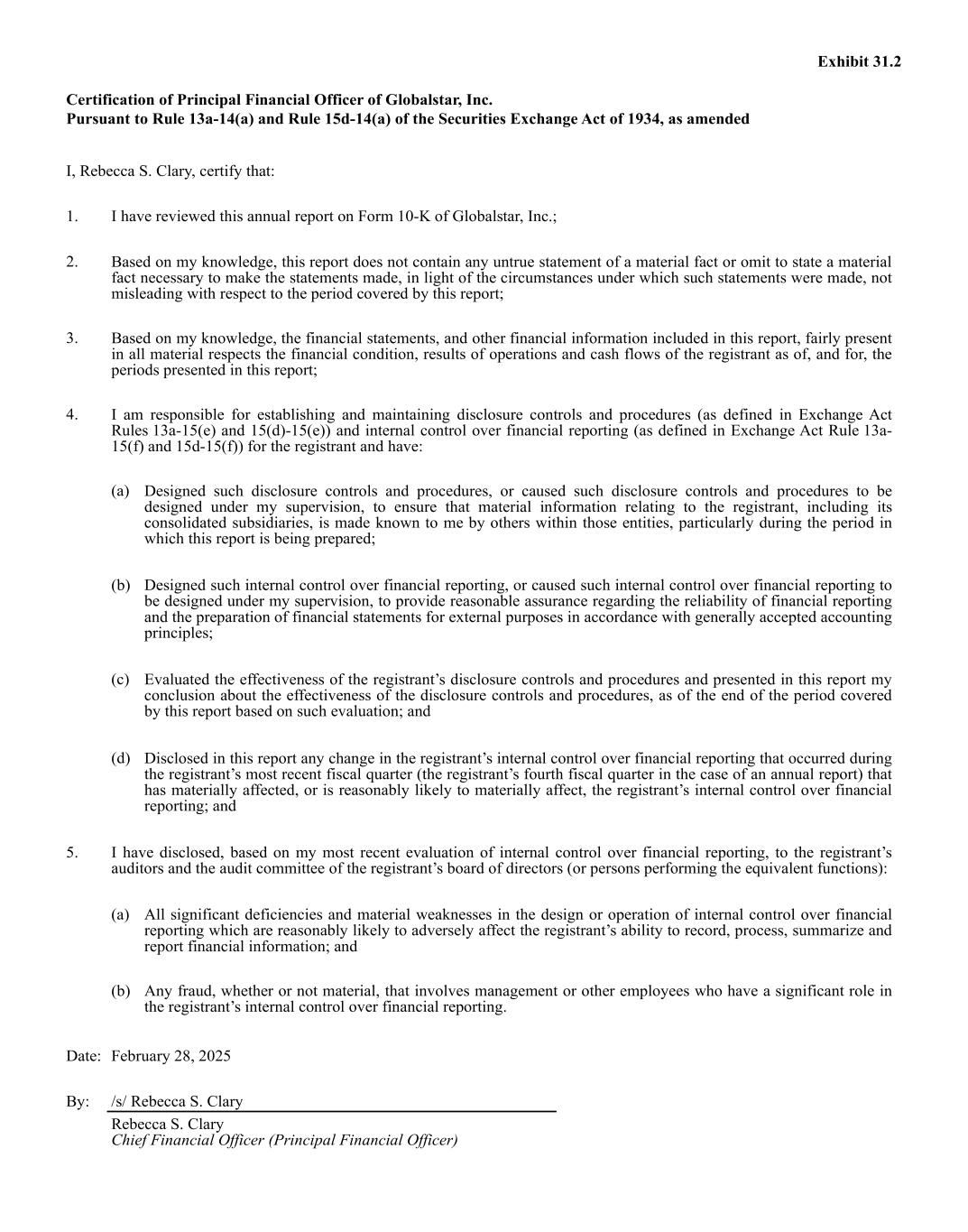 Exhibit 31.2     Certification of Principal Financial Officer of Globalstar, Inc.  Pursuant to Rule 13a-14(a) and Rule 15d-14(a) of the Securities Exchange Act of 1934, as amended     I, Rebecca S. Clary, certify that:       1. I have reviewed this annual report on Form 10-K of Globalstar, Inc.;       2. Based on my knowledge, this report does not contain any untrue statement of a material fact or omit to state a material  fact necessary to make the statements made, in light of the circumstances under which such statements were made, not  misleading with respect to the period covered by this report;       3. Based on my knowledge, the financial statements, and other financial information included in this report, fairly present  in all material respects the financial condition, results of operations and cash flows of the registrant as of, and for, the  periods presented in this report;       4. I am responsible for establishing and maintaining disclosure controls and procedures (as defined in Exchange Act  Rules 13a-15(e) and 15(d)-15(e)) and internal control over financial reporting (as defined in Exchange Act Rule 13a- 15(f) and 15d-15(f)) for the registrant and have:         (a) Designed such disclosure controls and procedures, or caused such disclosure controls and procedures to be  designed under my supervision, to ensure that material information relating to the registrant, including its  consolidated subsidiaries, is made known to me by others within those entities, particularly during the period in  which this report is being prepared;           (b) Designed such internal control over financial reporting, or caused such internal control over financial reporting to  be designed under my supervision, to provide reasonable assurance regarding the reliability of financial reporting  and the preparation of financial statements for external purposes in accordance with generally accepted accounting  principles;           (c) Evaluated the effectiveness of the registrant’s disclosure controls and procedures and presented in this report my  conclusion about the effectiveness of the disclosure controls and procedures, as of the end of the period covered  by this report based on such evaluation; and           (d) Disclosed in this report any change in the registrant’s internal control over financial reporting that occurred during  the registrant’s most recent fiscal quarter (the registrant’s fourth fiscal quarter in the case of an annual report) that  has materially affected, or is reasonably likely to materially affect, the registrant’s internal control over financial  reporting; and         5. I have disclosed, based on my most recent evaluation of internal control over financial reporting, to the registrant’s  auditors and the audit committee of the registrant’s board of directors (or persons performing the equivalent functions):         (a) All significant deficiencies and material weaknesses in the design or operation of internal control over financial  reporting which are reasonably likely to adversely affect the registrant’s ability to record, process, summarize and  report financial information; and           (b) Any fraud, whether or not material, that involves management or other employees who have a significant role in  the registrant’s internal control over financial reporting.     Date: February 28, 2025           By: /s/ Rebecca S. Clary       Rebecca S. Clary  Chief Financial Officer (Principal Financial Officer)