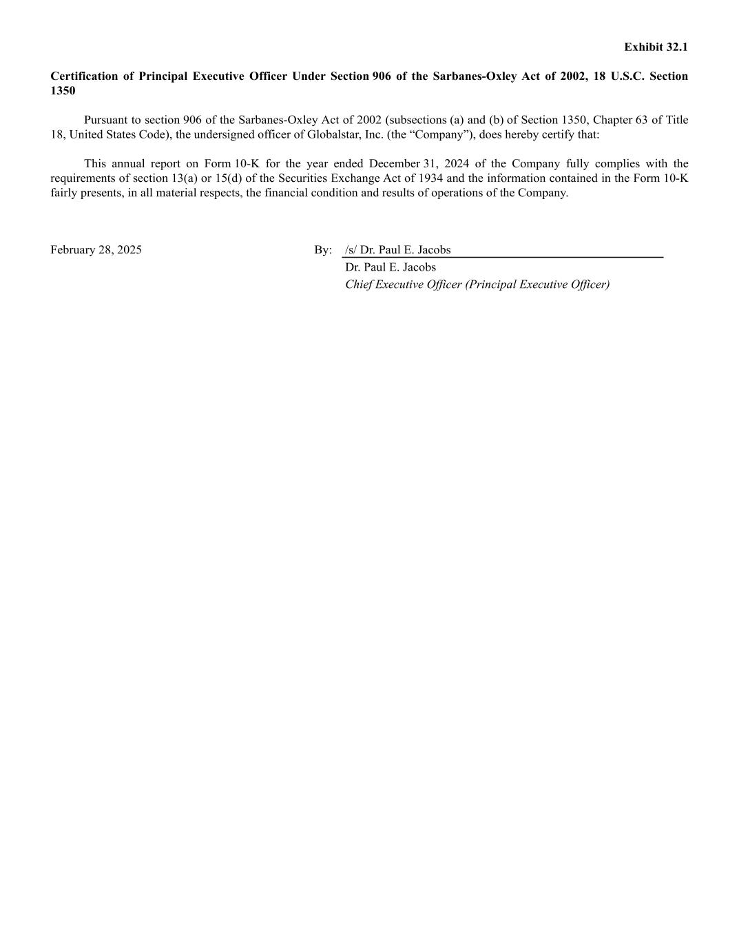 Exhibit 32.1    Certification of Principal Executive Officer Under Section 906 of the Sarbanes-Oxley Act of 2002, 18 U.S.C. Section  1350     Pursuant to section 906 of the Sarbanes-Oxley Act of 2002 (subsections (a) and (b) of Section 1350, Chapter 63 of Title  18, United States Code), the undersigned officer of Globalstar, Inc. (the “Company”), does hereby certify that:     This annual report on Form 10-K for the year ended December 31, 2024 of the Company fully complies with the  requirements of section 13(a) or 15(d) of the Securities Exchange Act of 1934 and the information contained in the Form 10-K  fairly presents, in all material respects, the financial condition and results of operations of the Company.            February 28, 2025 By: /s/ Dr. Paul E. Jacobs      Dr. Paul E. Jacobs      Chief Executive Officer (Principal Executive Officer)