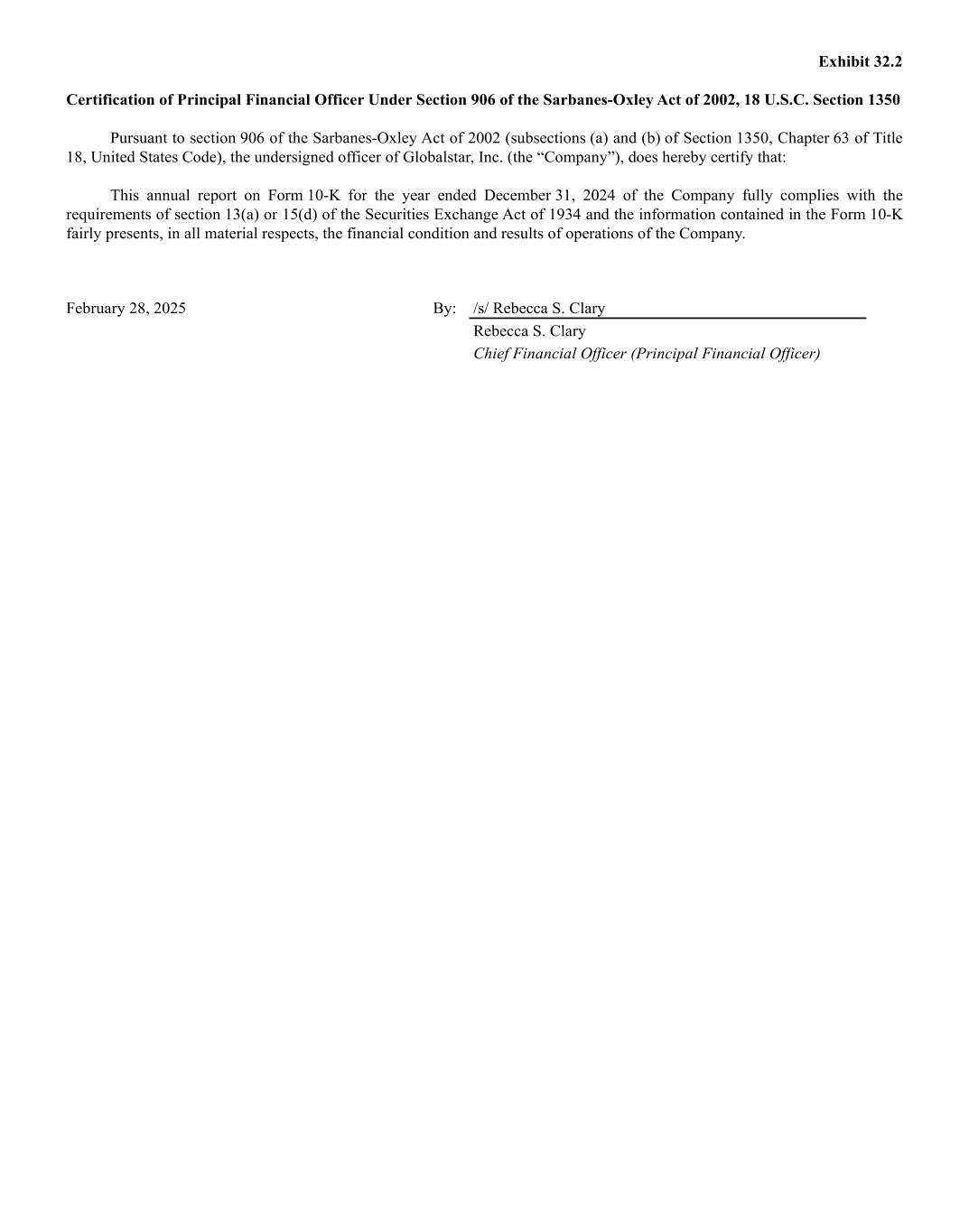 Exhibit 32.2    Certification of Principal Financial Officer Under Section 906 of the Sarbanes-Oxley Act of 2002, 18 U.S.C. Section 1350     Pursuant to section 906 of the Sarbanes-Oxley Act of 2002 (subsections (a) and (b) of Section 1350, Chapter 63 of Title  18, United States Code), the undersigned officer of Globalstar, Inc. (the “Company”), does hereby certify that:     This annual report on Form 10-K for the year ended December 31, 2024 of the Company fully complies with the  requirements of section 13(a) or 15(d) of the Securities Exchange Act of 1934 and the information contained in the Form 10-K  fairly presents, in all material respects, the financial condition and results of operations of the Company.            February 28, 2025 By: /s/ Rebecca S. Clary      Rebecca S. Clary      Chief Financial Officer (Principal Financial Officer)