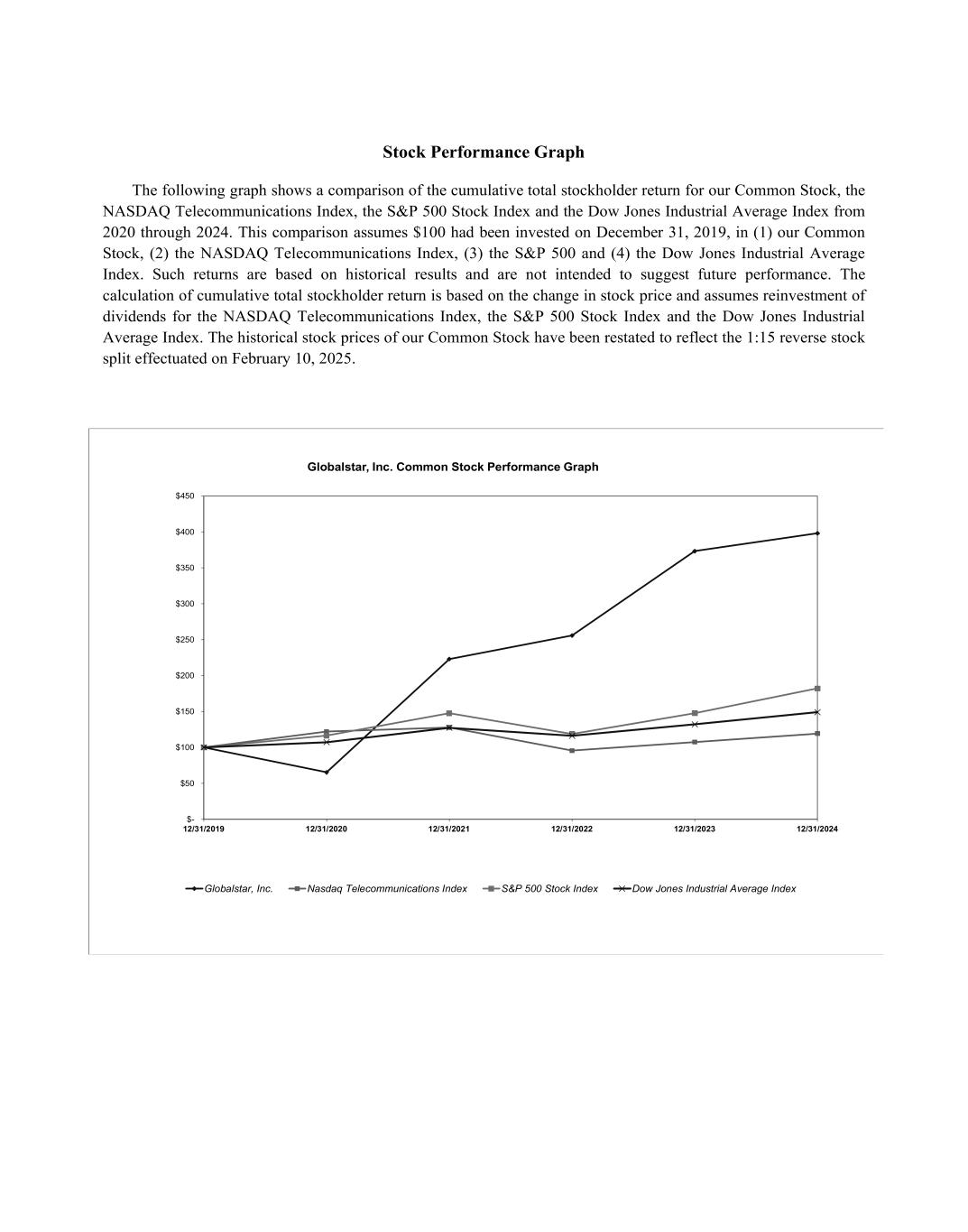 Stock Performance Graph  The following graph shows a comparison of the cumulative total stockholder return for our Common Stock, the  NASDAQ Telecommunications Index, the S&P 500 Stock Index and the Dow Jones Industrial Average Index from  2020 through 2024. This comparison assumes $100 had been invested on December 31, 2019, in (1) our Common  Stock, (2) the NASDAQ Telecommunications Index, (3) the S&P 500 and (4) the Dow Jones Industrial Average  Index. Such returns are based on historical results and are not intended to suggest future performance. The  calculation of cumulative total stockholder return is based on the change in stock price and assumes reinvestment of  dividends for the NASDAQ Telecommunications Index, the S&P 500 Stock Index and the Dow Jones Industrial  Average Index. The historical stock prices of our Common Stock have been restated to reflect the 1:15 reverse stock  split effectuated on February 10, 2025.   $-  $50  $100  $150  $200  $250  $300  $350  $400  $450 12/31/2019 12/31/2020 12/31/2021 12/31/2022 12/31/2023 12/31/2024 Globalstar, Inc. Common Stock Performance Graph Globalstar, Inc. Nasdaq Telecommunications Index S&P 500 Stock Index Dow Jones Industrial Average Index