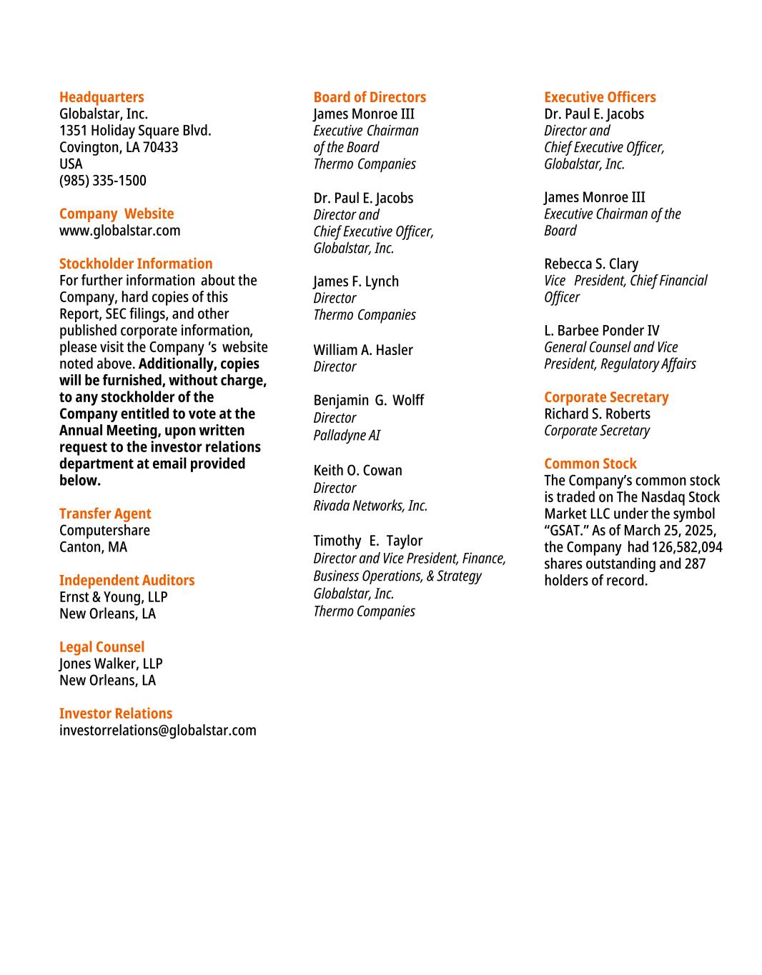 2 Dear Stockholders, As we reflect on the achievements of 2024, I am proud of our strengthened position as a leader in both satellite and terrestrial  connectivity markets. This past year has been transformative, marked by strategic milestones, technological advancements,   and financial growth that have collectively enhanced our competitive edge, enabling our next phase of growth.  During the last twelve months, we have actively engaged with you - our stockholders - as well as industry leaders and other  supporters of Globalstar in various forums. In December, it was a pleasure meeting with so many of you during our analyst  and investor day, where our executive leadership team outlined our strategic priorities and growth strategy as well as provided  updates to our short and long-term financial outlook. These presentations and several customer panels during the event are  available for replay on Globalstar’s investor relations website under “Events and Presentations”. Globalstar also had a strong presence at Mobile World Congress in Barcelona, Spain in March 2025. At this premier mobile  technology event, we were able to showcase our diverse solution set of connectivity products and services, including a live  demonstration of XCOM RAN utilizing Globalstar’s Band 53TM, a milestone described in more detail below. We also hosted the  International Telecommunication Union (ITU) Secretary General, Doreen Bogdan-Martin, and her delegation at Globalstar’s  booth to express our support for the ITU’s Partner2Connect initiative, as well as held meetings with other international  administrations’ delegations who were in attendance. Also in March, we held a grand opening of Globalstar’s new satellite operations control center at the Company’s headquarters  in Covington, Louisiana. This milestone marks a significant expansion of our operational capabilities and reinforces our strategic  growth as we extend our current network with capabilities for next-generation satellite and connectivity solutions. The grand  opening event was attended by notable representatives and local dignitaries, including House Majority Leader Steve Scalise   and FCC Chairman Brendan Carr.  Operational Highlights and Strategic Developments During the last twelve months, we have seen remarkable progress in our product development capabilities. Under new  leadership, our team successfully delivered a full two-way satellite commercial IoT solution, transitioning from   our previous one-way tracking and telemetry applications. We believe that this advancement positions us to   compete aggressively for subscribers in existing markets ripe for disruption. The globally harmonized L- and S-band mobile satellite spectrum that has been  licensed to us for over 30 years continues to provide a stable platform for   innovating connectivity solutions. We believe that we have the most   successful and well-utilized mobile satellite service (“MSS”) band,   with plans to further intensify the usage of our licensed spectrum.   Our bent pipe architecture further differentiates Globalstar,   allowing for rapid deployment of new innovations while   others either borrow spectrum or deploy additional   satellites to match our capabilities. ANNUAL REPORT 2024  Headquarters   Globalstar, Inc.   1351 Holiday Square Blvd.  Covington, LA 70433   USA   (985) 335-1500 Company Website  www.globalstar.com   Stockholder Information   For further information about the  Company, hard copies of this  Report, SEC filings, and other  published corporate information,  please visit the Company ’s  website  noted above. Additionally, copies  will be furnished, without charge,  to any stockholder of the  Company entitled to vote at the  Annual Meeting, upon written  request to the investor relations  department at email provided  below.   Transfer Agent Computershare  Canton, MA   Independent Auditors Ernst & Young, LLP   New Orleans, LA   Legal Counsel   Jones Walker, LLP New Orleans, LA   Investor Relations   investorrelations@globalstar.com   Board of Directors  James Monroe III  Executive Chairman  of the Board  Thermo Companies Dr. Paul E. Jacobs  Director and   Chief Executive Officer,  Globalstar, Inc.  James F. Lynch  Director   Thermo Companies William A. Hasler  Director   Benjamin G. Wolff Director  Palladyne AI  Keith O. Cowan  Director  Rivada Networks, Inc.  Timothy E. Taylor Director  and Vice President, Finance,  Business Operations, & Strategy  Globalstar, Inc.  Thermo Companies Executive Officers  Dr. Paul E. Jacobs  Director and   Chief Executive Officer,  Globalstar, Inc.  James Monroe III  Executive Chairman of the  Board  Rebecca S. Clary  Vice President, Chief Financial  Officer  L. Barbee Ponder IV General Counsel and Vice  President, Regulatory Affairs Corporate Secretary  Richard S. Roberts  Corporate Secretary  Common Stock   The Company’s common stock  is traded on The Nasdaq Stock  Market LLC under the symbol  “GSAT.” As of March 25, 2025,  the Company had 126,582,094  shares outsta  nding and 287  holders of record.