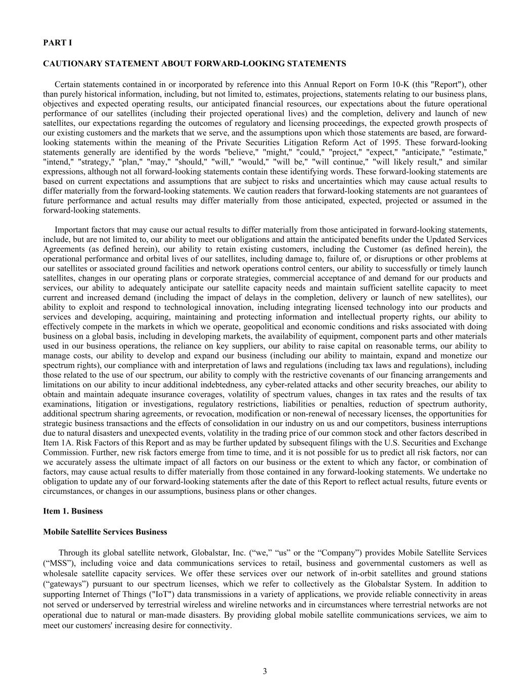 2 Dear Stockholders, 2025 was a year defined by expansion of our strategic relevance across mission-critical industries. Over the past twelve months, Globalstar meaningfully strengthened its position as a global connectivity platform operating at the intersection of satellite, licensed spectrum, private wireless, and next-generation IoT. We advanced our next-generation constellation plans, expanded our ground infrastructure footprint across multiple continents, deepened our entry into defense and public sector markets, and accelerated commercialization of our terrestrial and multimode connectivity solutions. This was not a year of incremental progress. It was a year of structural advancement. Throughout 2025, we engaged actively with stockholders, regulators, enterprise partners, and government stakeholders across global forums. From ringing the NASDAQ opening bell and completing our transfer to the NASDAQ Global Select Market, to industry-specific thought leadership at conferences worldwide, we reinforced Globalstar’s strategic direction and long-term growth thesis. Our market updates communicated continued advancement and underscored our confidence in the durability of our asset base and market positioning. 2025 ANNUAL REPORT A central focus of 2025 was strengthening the foundation of Globalstar’s wholesale satellite business through continued infrastructure expansion and advancement of our next-generation constellation roadmap. Our business plan includes delivering expanded services over a new MSS network, including a new satellite constellation, upgraded ground infrastructure, and increased global MSS licensing, referred to collectively as our Extended MSS Network. Complementing our replacement second-generation satellites expected to be launched this year, our third-generation, or C-3, constellation comprised of over 50 satellites is designed to expand network capacity, enhance service durability, and position Globalstar to support both wholesale and our own direct customer offerings well into the future. Unlike many emerging entrants, Globalstar builds on decades of operational experience, licensed spectrum stewardship, and established orbital assets. Our bent pipe architecture continues to differentiate us by enabling rapid service innovation without requiring a redesign of the satellite network or acquisition of new spectrum. During 2025, we also demonstrated our ability to operate evolving standards across our existing LEO infrastructure, highlighting the depth of our spectrum and standards expertise. As satellite connectivity continues to transition from niche capability to mainstream communications infrastructure, Globalstar remains positioned as a proven operator with global licenses and scalable architecture. Wholesale Satellite Services: Expanding Our Network Foundation