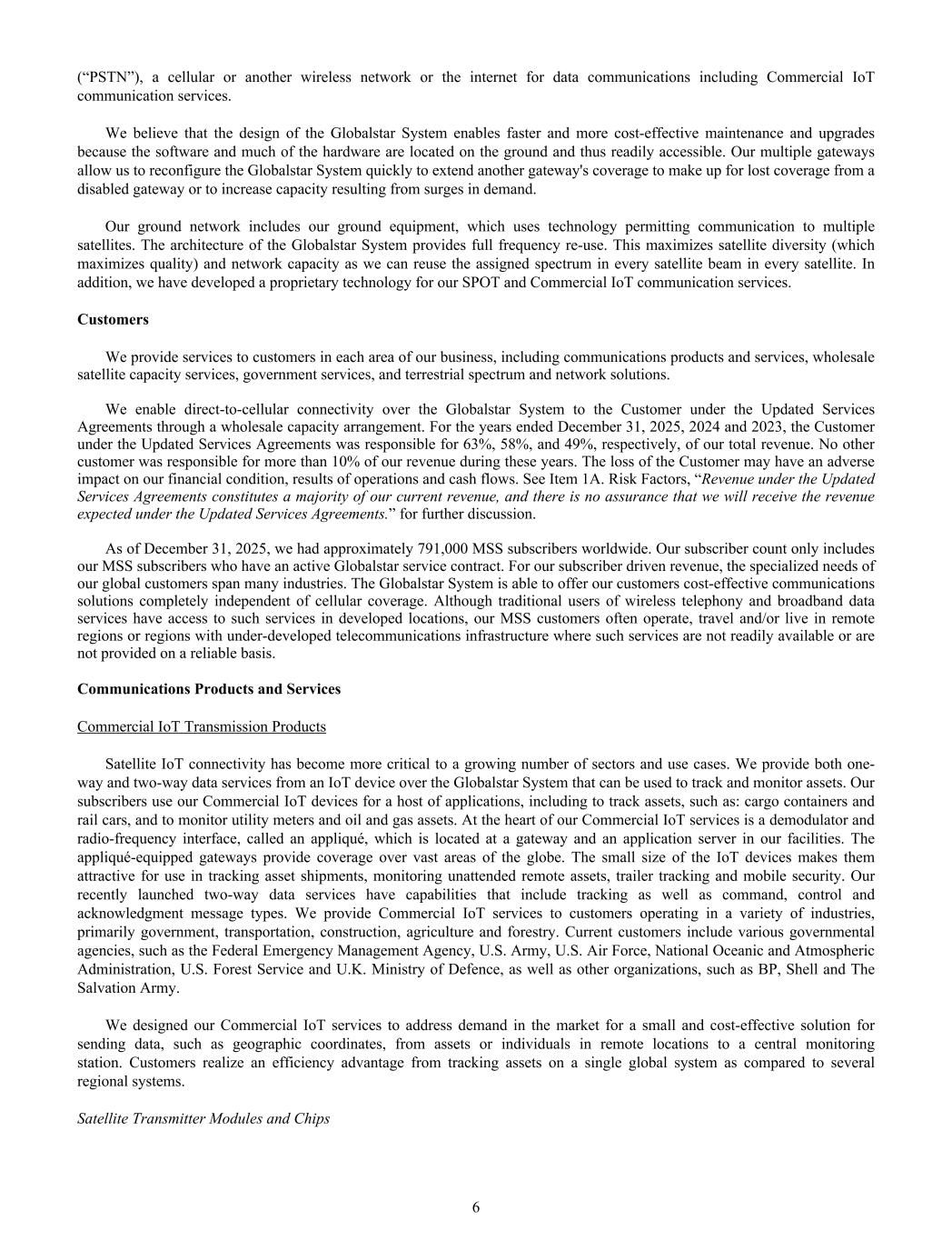42025 ANNUAL REPORT We also saw increasing interest in the use of XCOM RAN within government and defense environments. During the year, Globalstar participated in a research initiative evaluating high-capacity private wireless architectures for defense applications, and our ecosystem partners secured government funding to further develop advanced 5G solutions for challenging operational environments. These developments demonstrate how Globalstar’s licensed spectrum and proprietary wireless technology are extending the Company’s role beyond satellite services and into hybrid satellite-terrestrial connectivity platforms. Momentum across Globalstar’s commercial IoT business remained strong throughout 2025, supported by product innovation and expanding enterprise demand. One of the most significant milestones during the year was the launch of two-way satellite IoT capabilities with the commercial rollout of the RM200M module. This development represents an important expansion of Globalstar’s IoT portfolio, moving beyond one-way monitoring to enable reliable command and control for enterprise, government, and industrial customers. Two-way IoT expands our addressable market and enables higher-value use cases where confirmation and resiliency are critical, including asset tracking, infrastructure monitoring, logistics management, and safety applications. Average commercial IoT subscribers increased 6% year over year, while IoT hardware revenue grew 50% year over year. This growth reflects continued adoption of satellite connectivity across industries including agriculture, wildfire response, industrial monitoring, and public safety. Commercial IoT: Scaling Enterprise Connectivity Globalstar’s SPOT consumer product line continues to deliver reliable satellite connectivity to individuals operating beyond the reach of traditional communications networks. Used by outdoor enthusiasts, adventurers, and professionals worldwide, SPOT devices provide critical safety capabilities, including satellite messaging, GPS tracking, and emergency SOS alerting. Most importantly, SPOT represents a life-saving solution when emergencies occur far from cellular coverage. In July 2025, a remote canoe expedition in Ontario demonstrated the real-world value of the technology. During a backcountry trip along the rugged Lady Evelyn River, an experienced outdoorsman suffered a serious head injury after slipping on a rock during a portage. With no cellular coverage and no road access in the remote wilderness, his sister activated the SOS feature on her SPOT device. The alert triggered a coordinated emergency response and a helicopter rescue team successfully located the pair in the dense backcountry and delivered medical assistance. SPOT Consumer: A Life-Saving Connectivity Solution